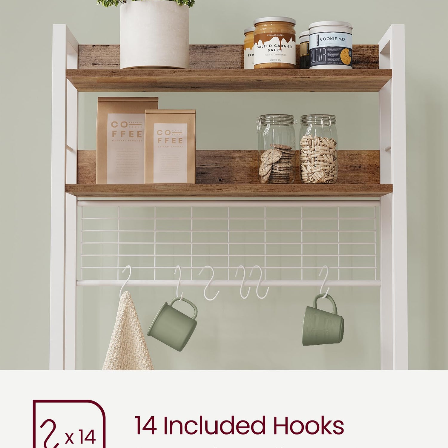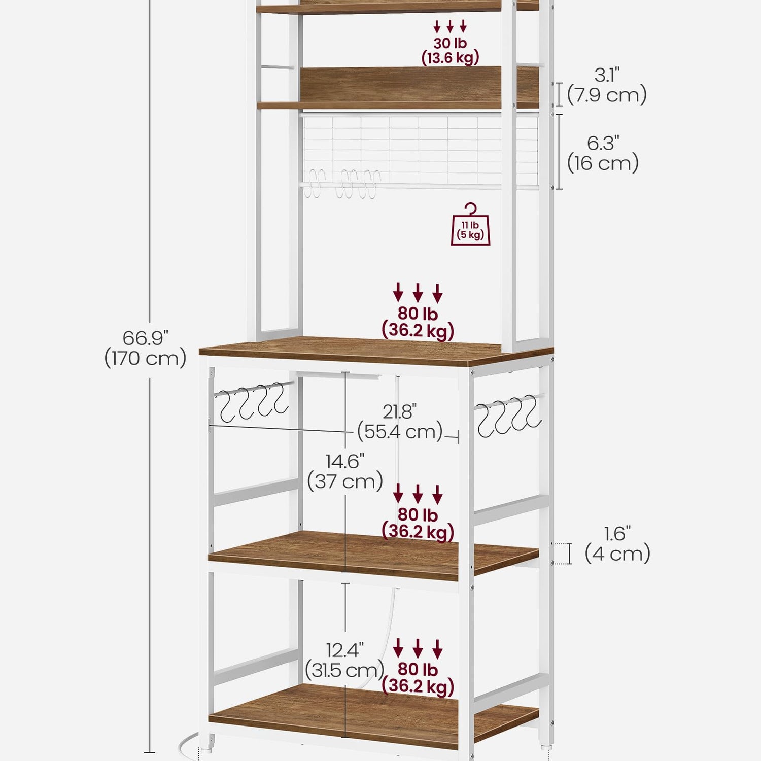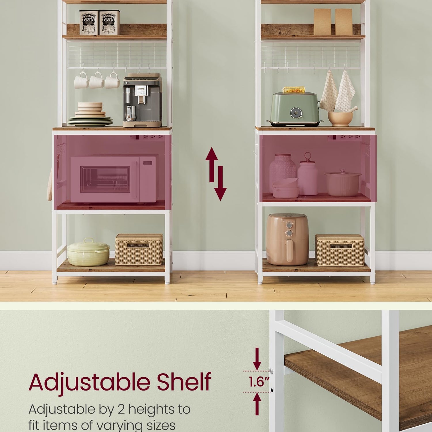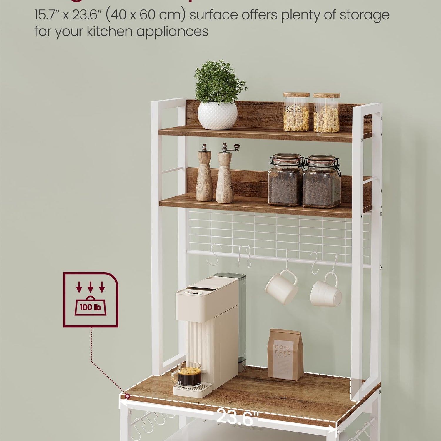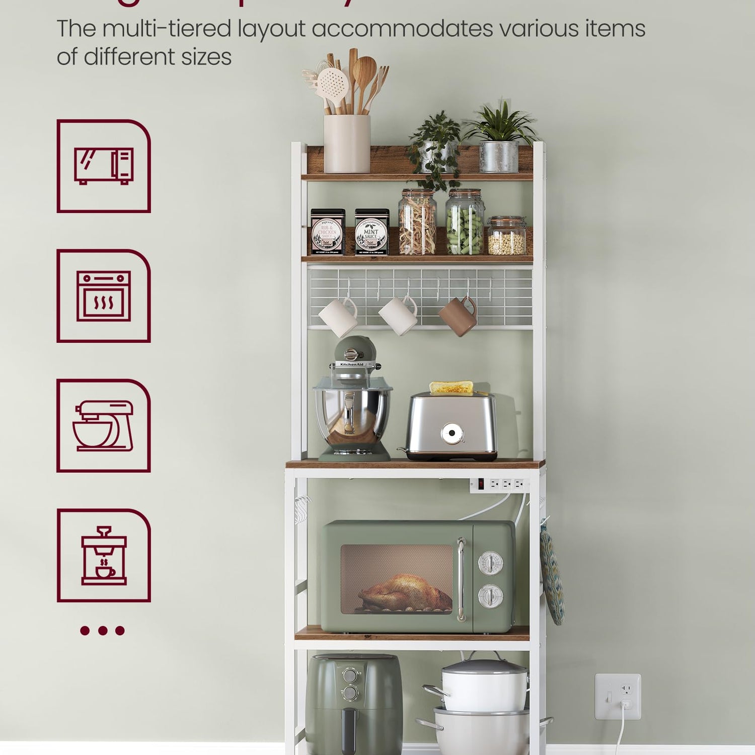VASAGLE Hutch Bakers Rack with Power Outlet, 14 Hooks Microwave Stand, Adjustable Coffee Bar with Metal Wire Panel, Kitchen Storage Shelf, 15.7 x 23.6 x 66.9 Inches, Rustic Walnut and White UKKS037W41