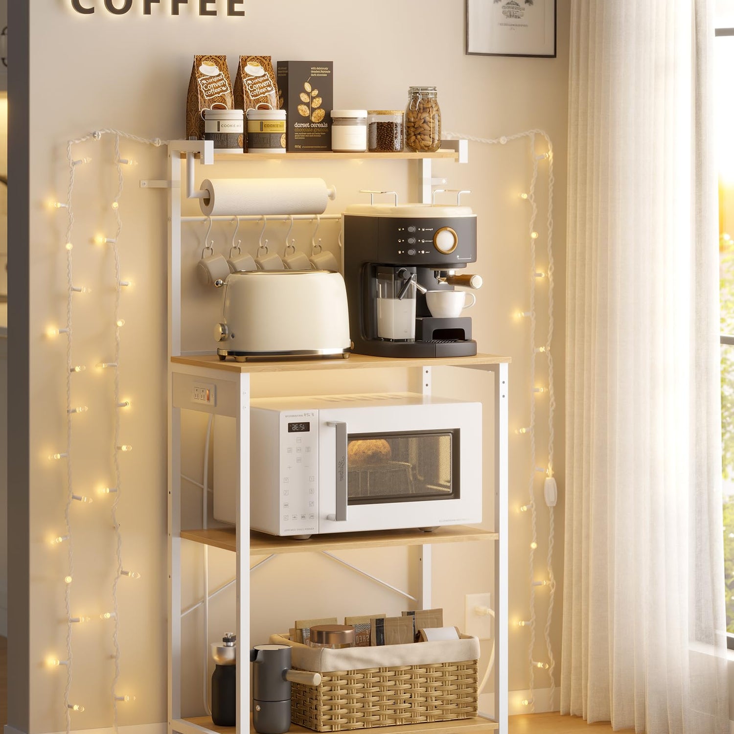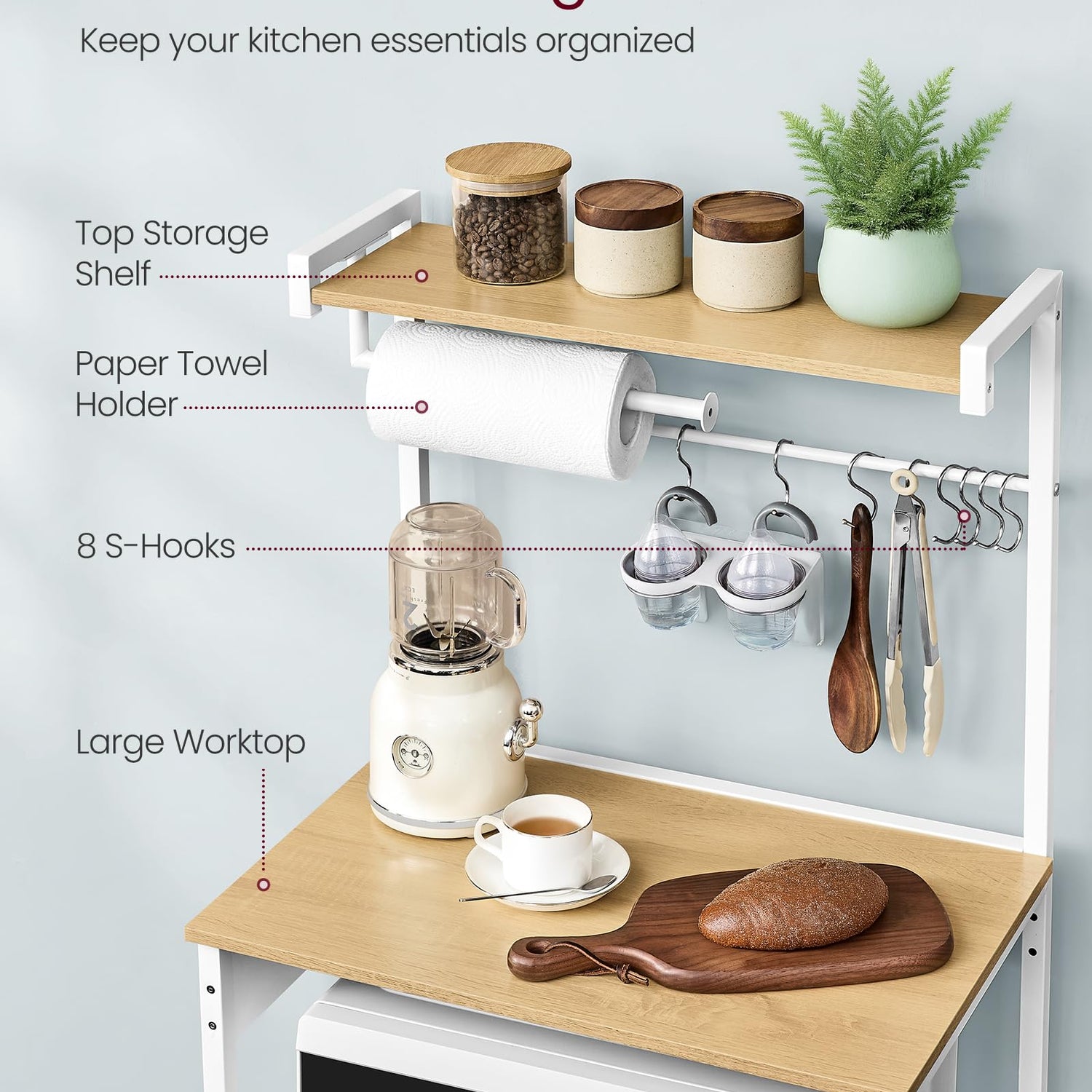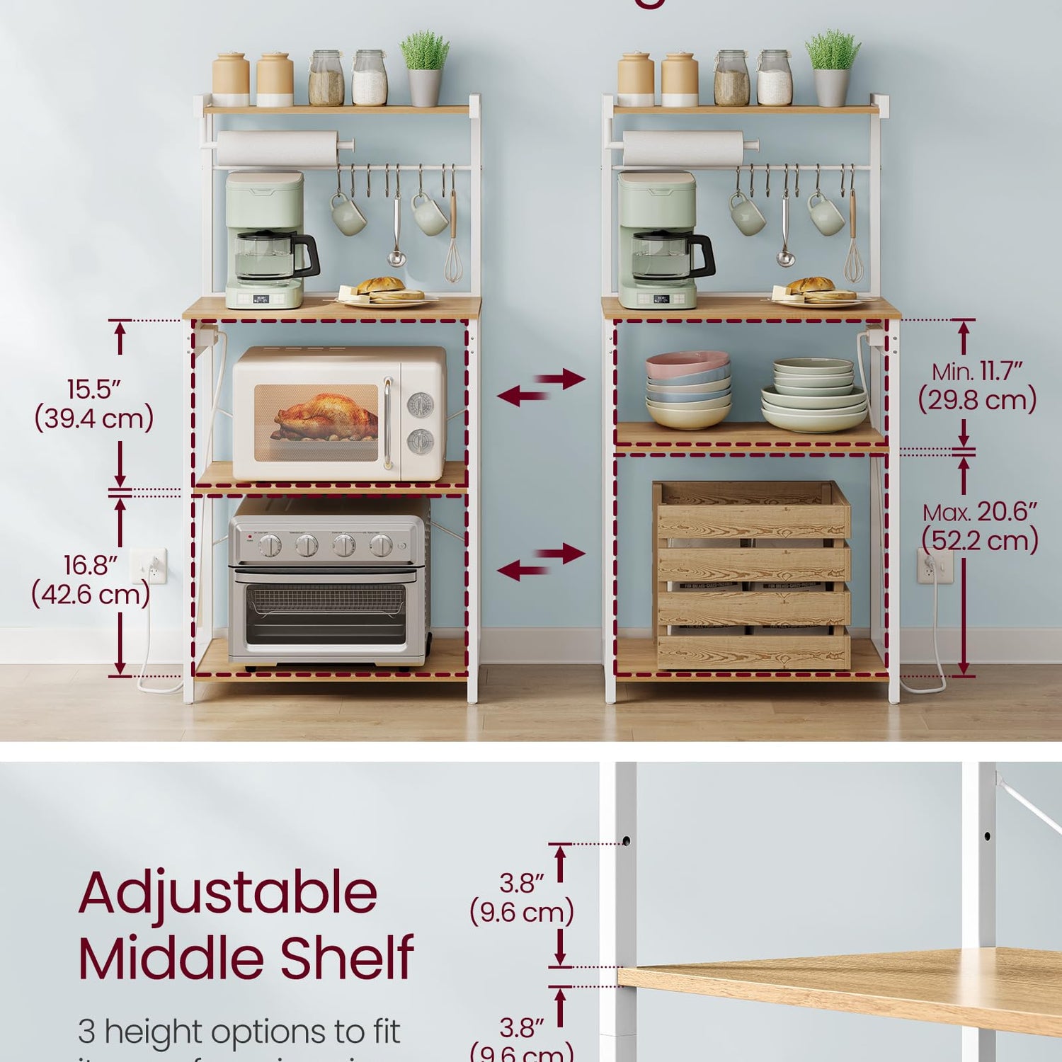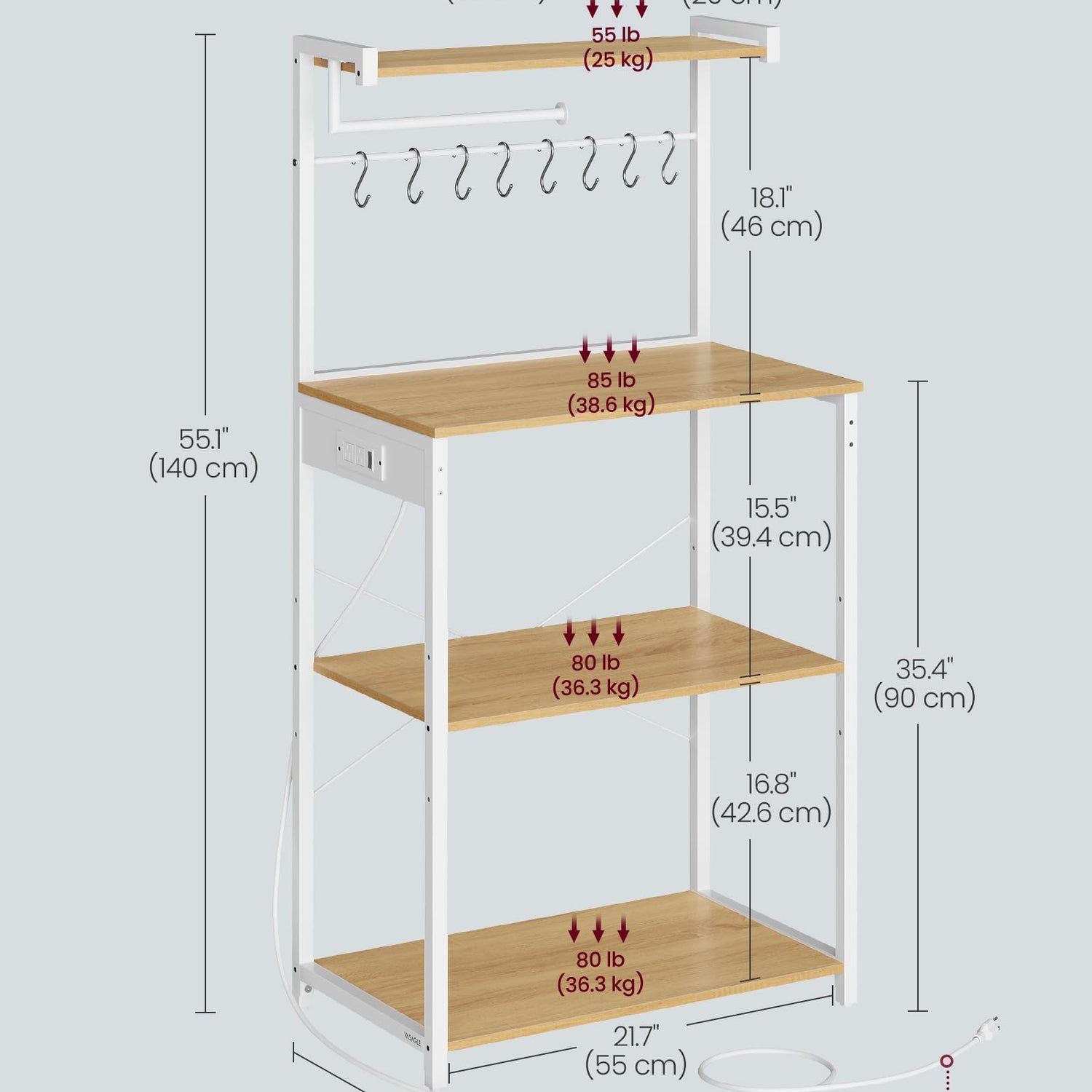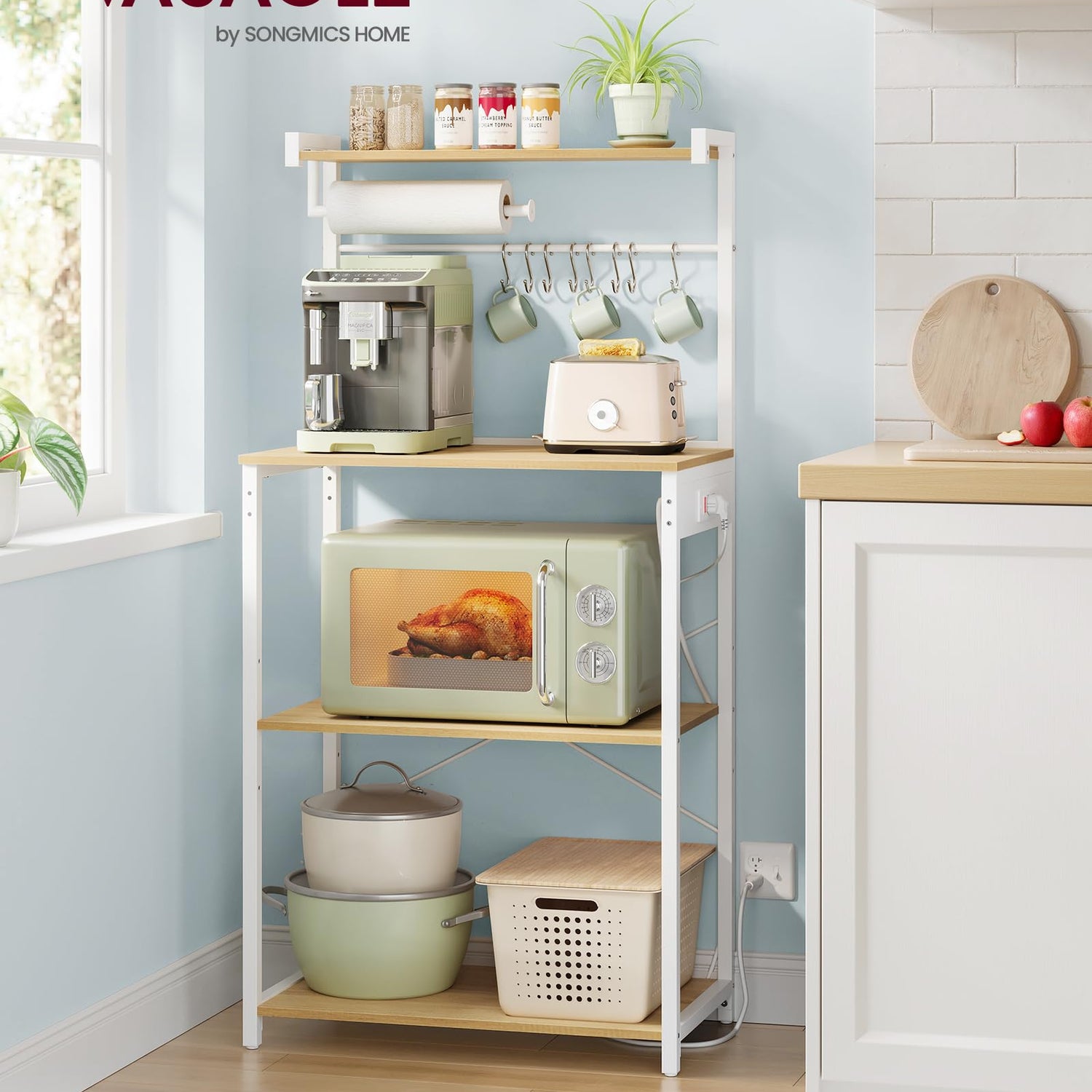 VASAGLE Kitchen Bakers Rack with Power Outlet, Coffee Bar 4-Tier with 8 S Hooks, Microwave Stand, Adjustable Shelf, for Small Spaces, Golden Oak and Cloud White UKKS014Y01V1