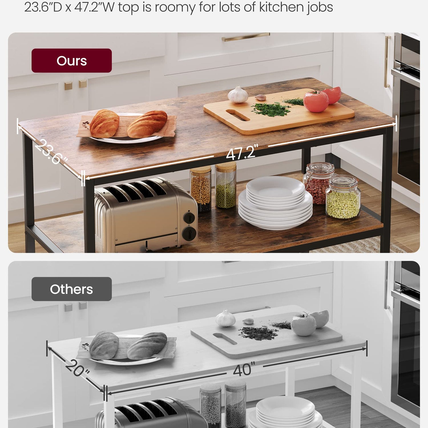 With its expansive worktop measuring 23.6”D x 47.2”W, this kitchen island offers ample surface area for food preparation while providing convenient space for your essential appliances, whether it's a toaster or a coffee machine. The three-tier storage system ensures everything is easily organized and accessible, making your kitchen tasks smoother and more efficient. Capable of holding decor items on the top shelf, kitchen gadgets on the middle, and storing bakeware in containers below, this island is designed for ultimate convenience.