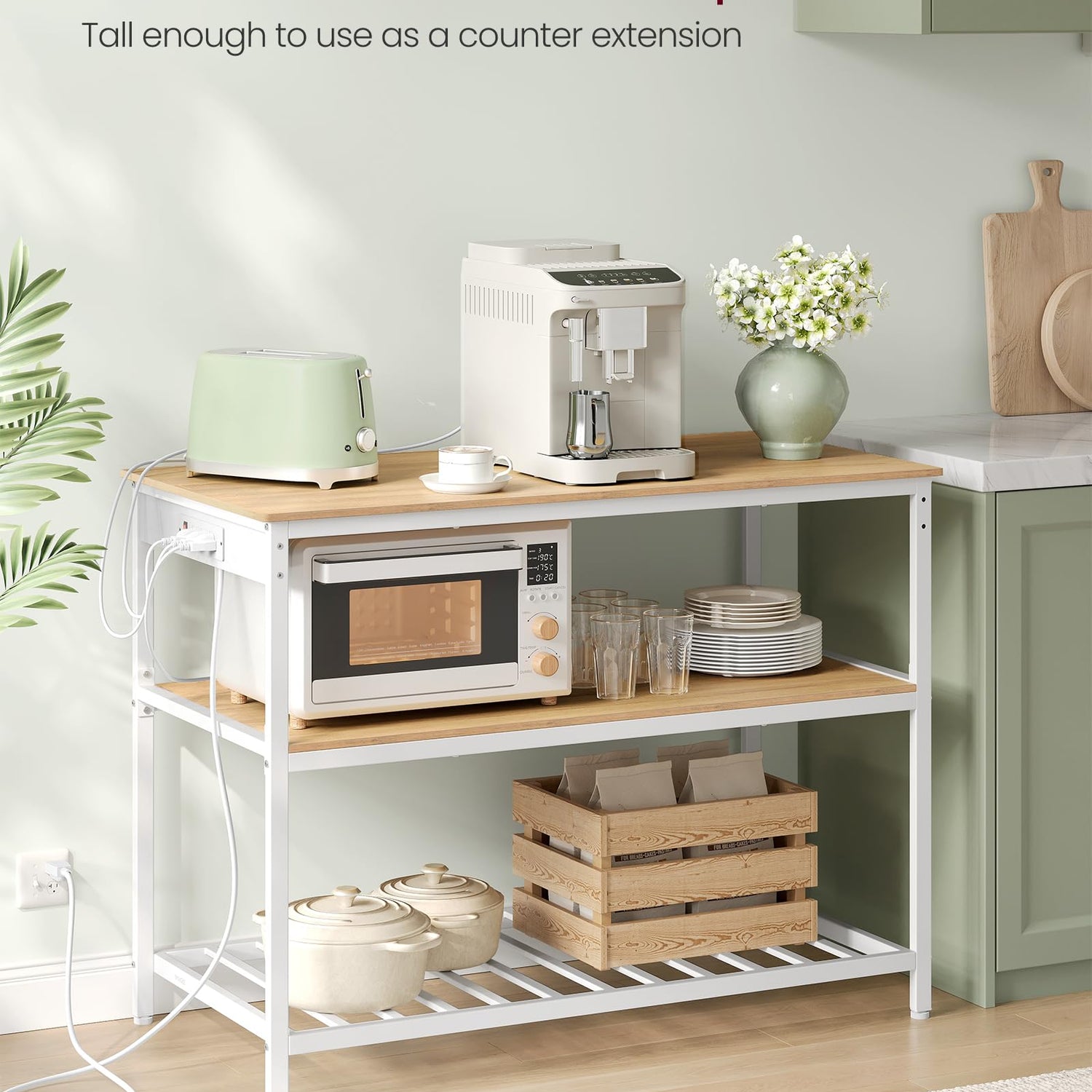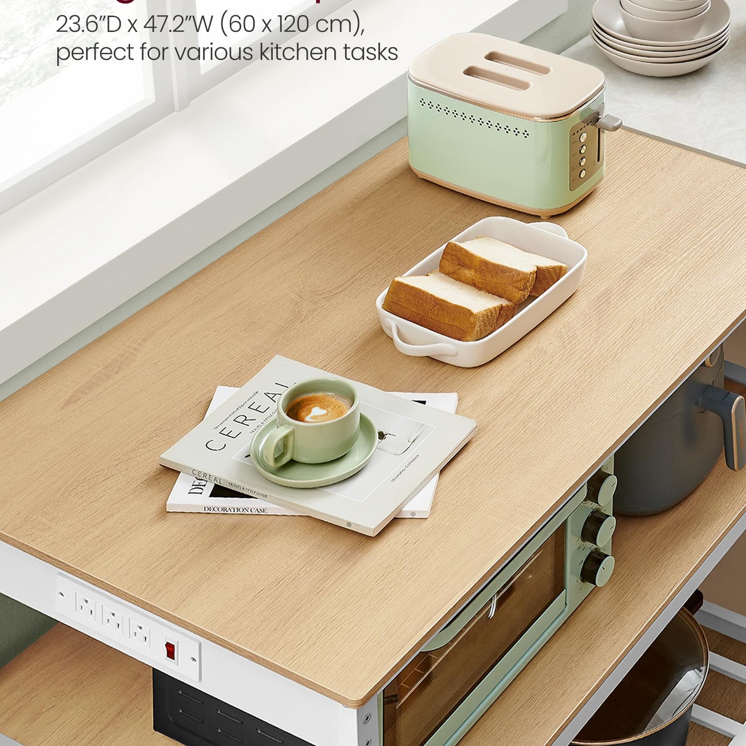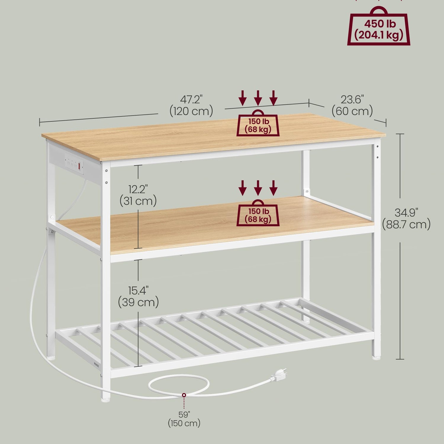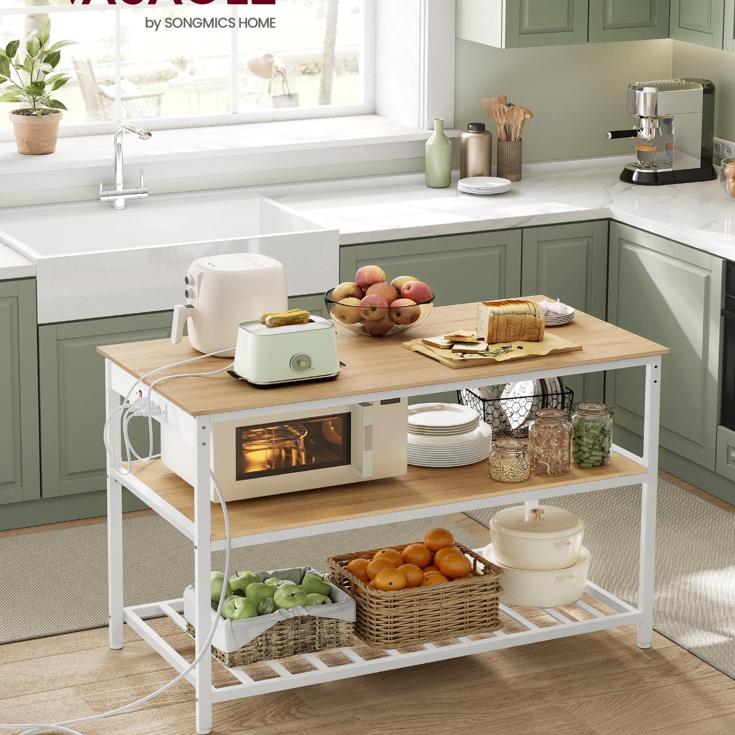 VASAGLE Kitchen Island with 3 Shelves, 47.2 Inches Width Kitchen Shelf with Power Strip, Large Worktop, Stable Steel Structure, Industrial, Easy to Assemble, Golden Oak and White UKKI101Y01