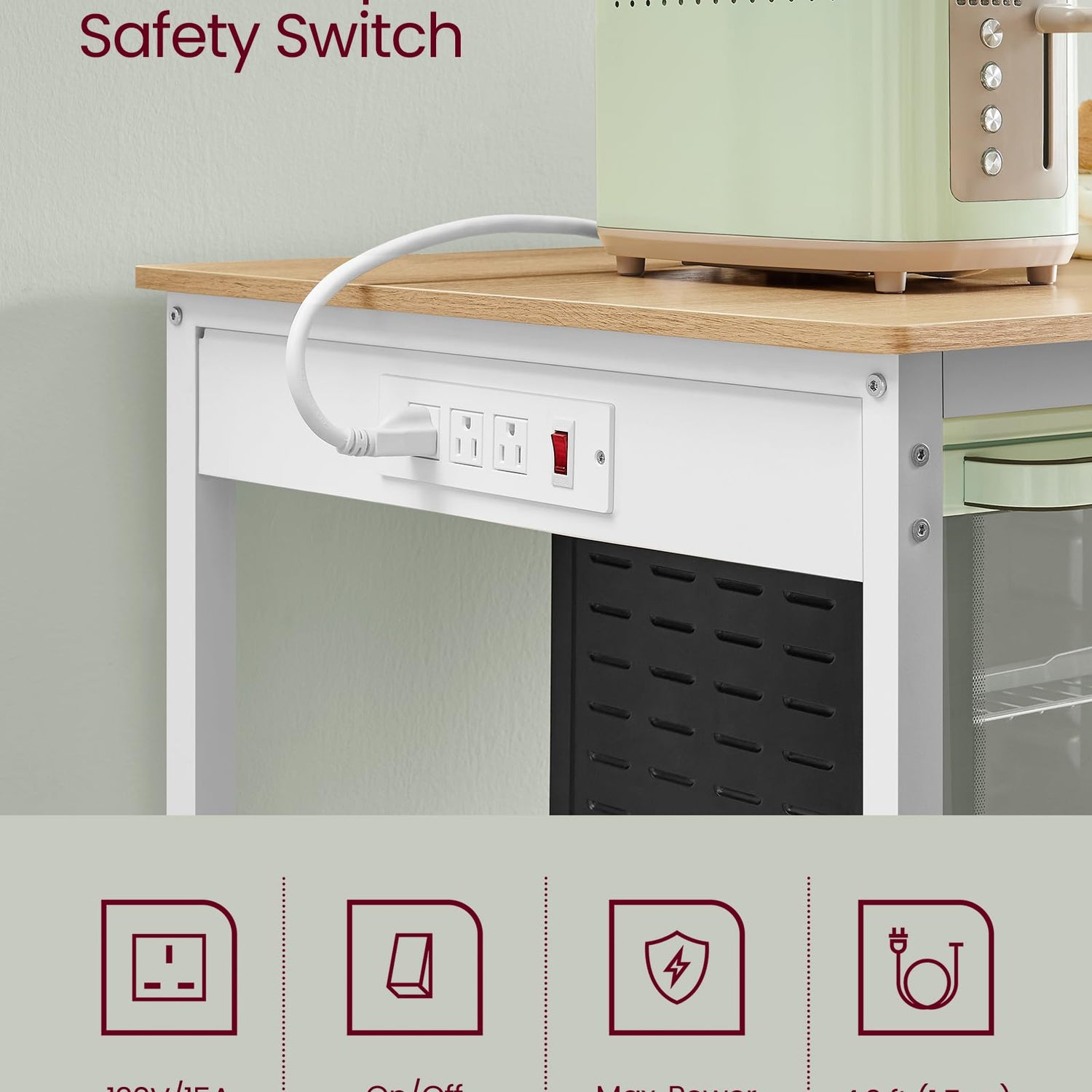 - [Convenient Power Strip] This baker's rack features a built-in power strip with 3 AC outlets, a safety switch, and a maximum power capacity of 1875 watts. It's perfect for powering multiple appliances at once