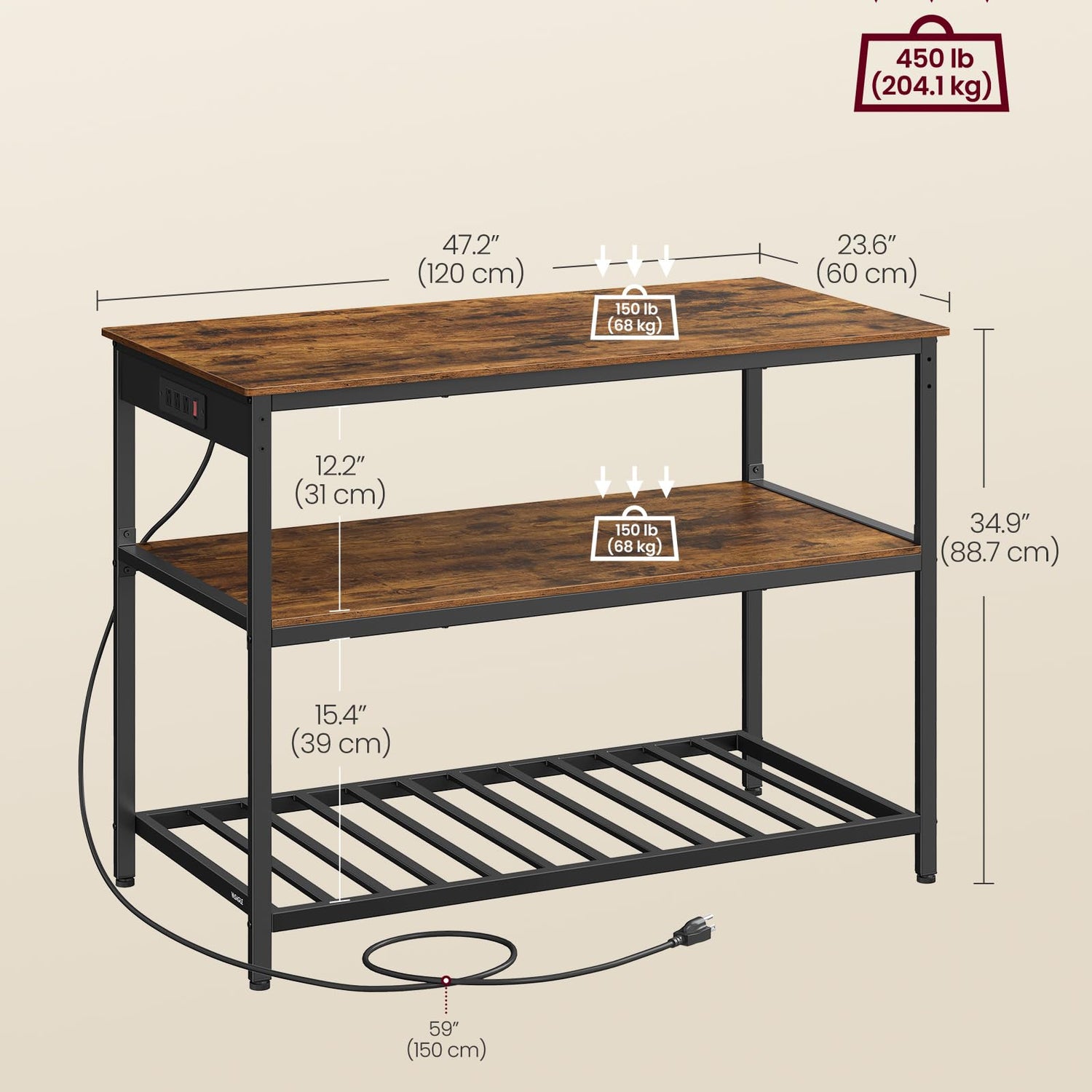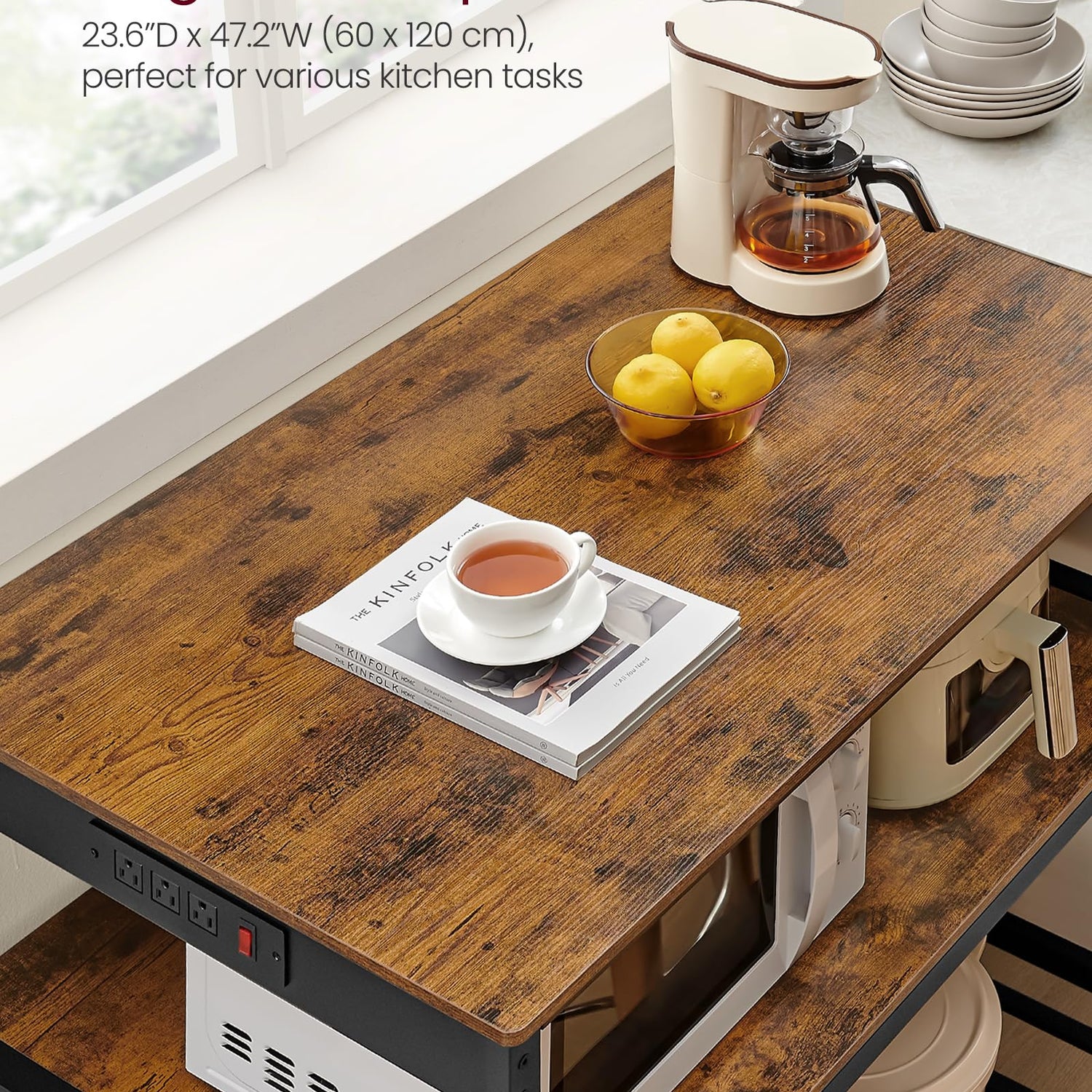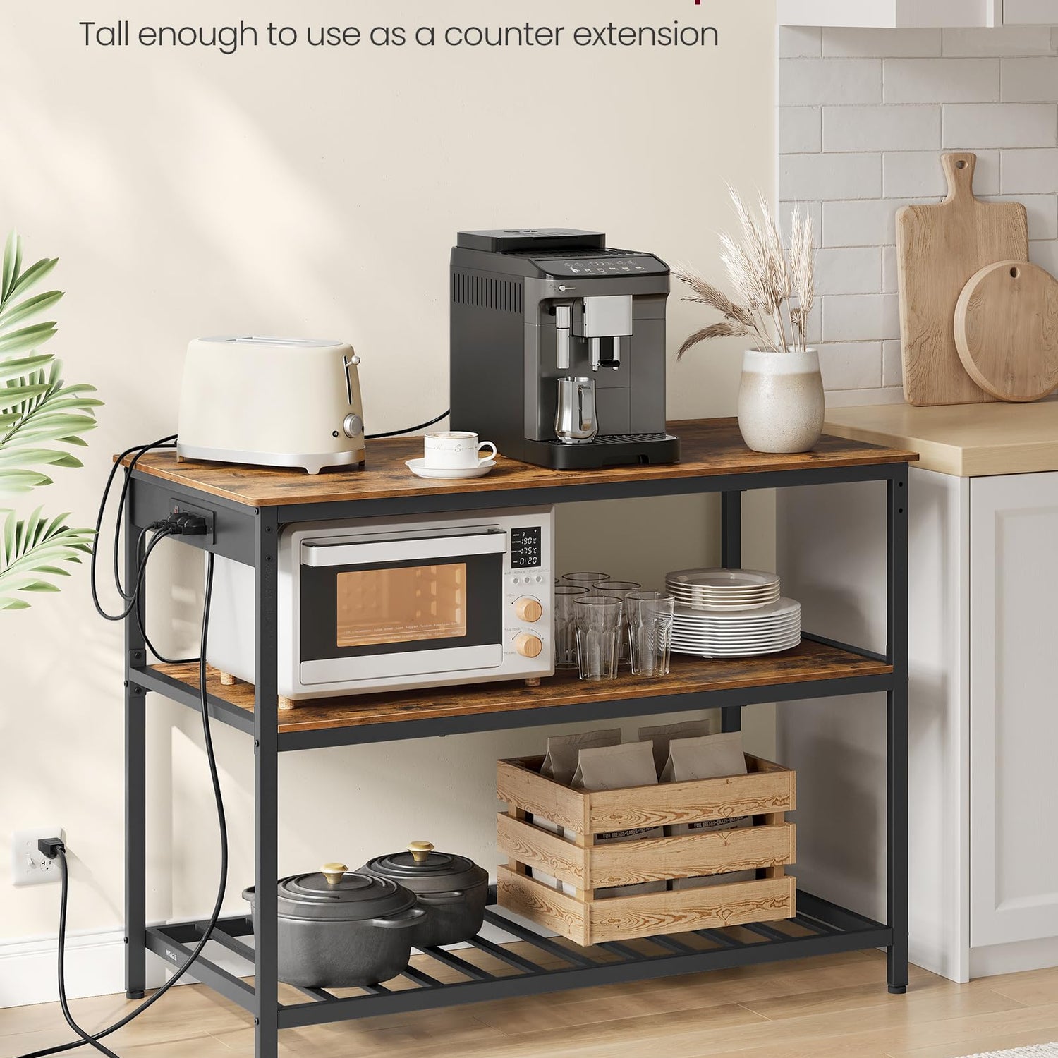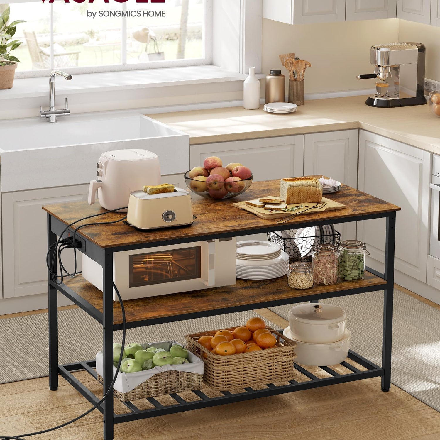 VASAGLE Kitchen Island with 3 Shelves, 47.2 Inches Width Kitchen Shelf with Power Strip, Large Worktop, Stable Steel Structure, Industrial, Easy to Assemble, Rustic Brown and Black UKKI101K01