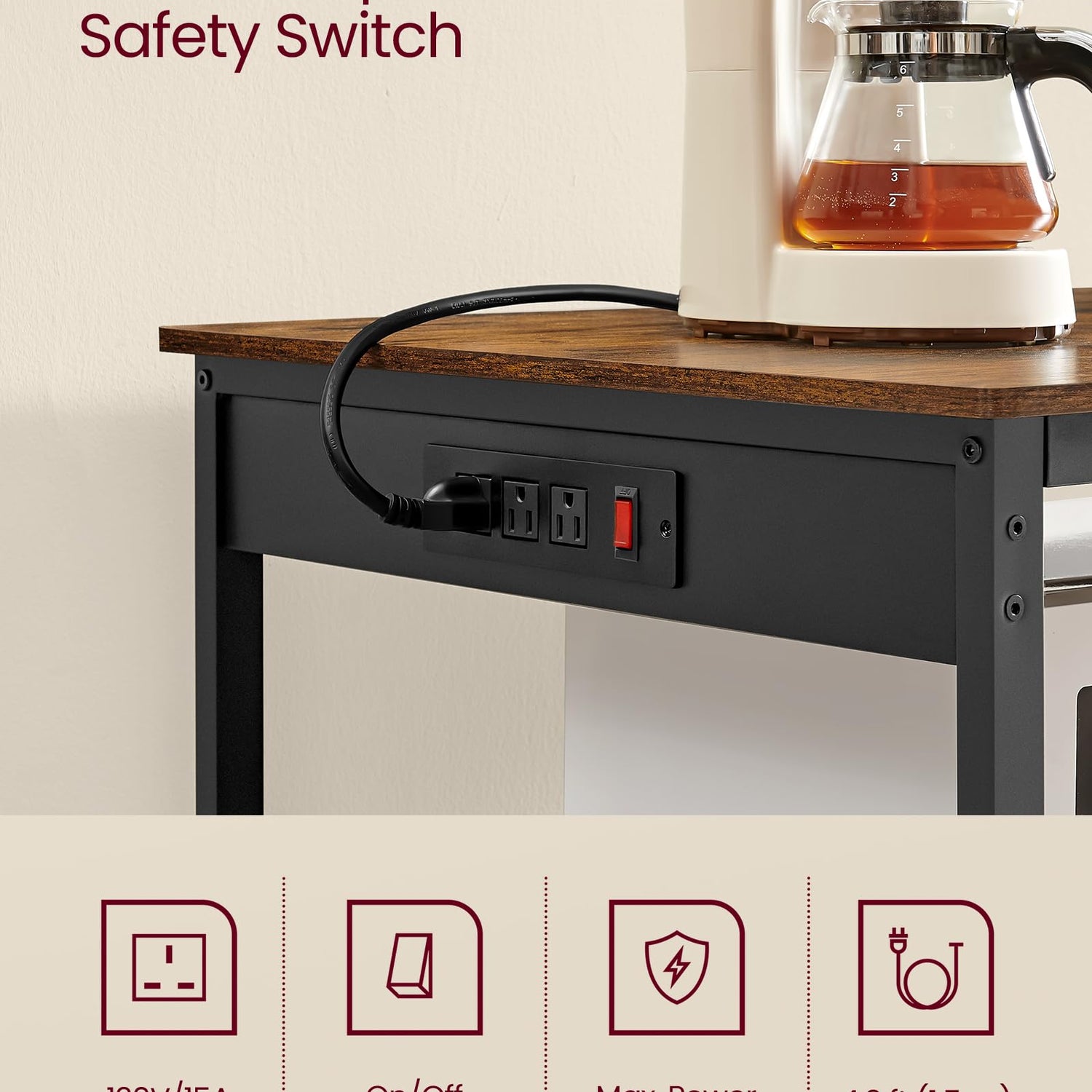 - [Convenient Power Strip] This baker's rack features a built-in power strip with 3 AC outlets, a safety switch, and a maximum power capacity of 1875 watts. It's perfect for powering multiple appliances at once