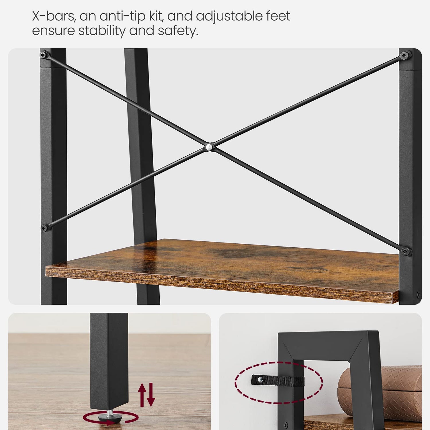 - [Stable] Designed in a solid frame, reinforced by X-shaped bars, balanced by adjustable feet, and secured by an anti-tip kit, this ladder shelf features great stability