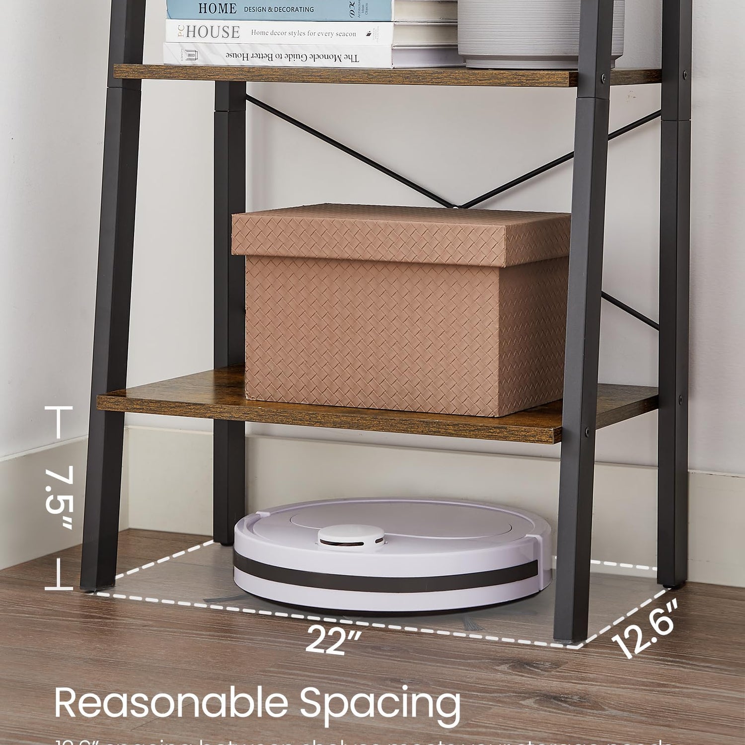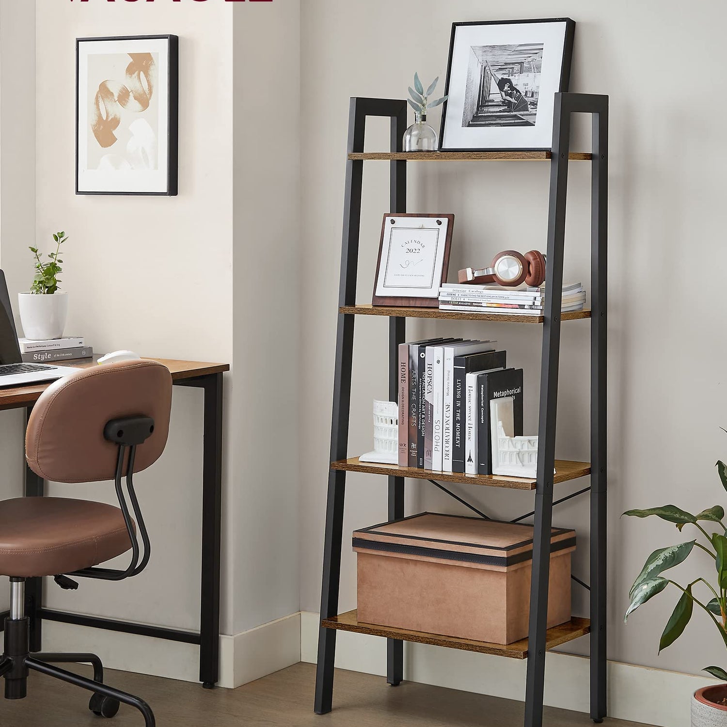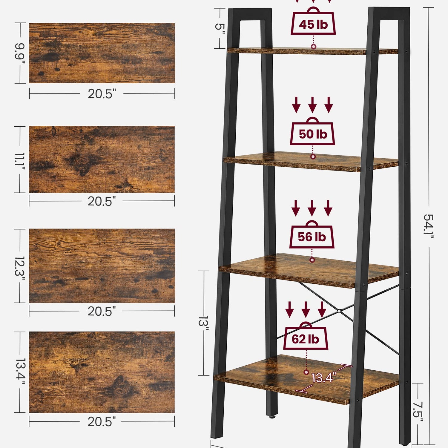 Details: When you need more storage space and make full use of the space in your home, consider adding this lovely ladder storage unit. It combines the charm of both classic and contemporary furniture styles.Place it in the living room Fill the shelves with eye-catching knick-knacks, it will definitely become a centerpiece of your home.Place it in the study or office Keep your books, documents and etc. in order within reach.Place it in the bathroom Well organize your towels, toiletries, loo rolls and etc.Place it on the balcony Proudly display your plants, fish bowls and etc. while creating a peaceful corner.Choose the VASAGLE ladder shelf and to increase storage space and to add a handsome and functional piece of furniture to your home!Specifications: - Color: Rustic Brown- Material: Particleboard and Metal - Load Capacity of Each Tier: 11 lb (5 kg) - Product Size: 22.1"L x 13.3"W x 54.1"H ( 56 x 34 x 137.5 cm) - Weight: 15.15 lb (6.87 kg)Package Contents: - 1 x Ladder Shelf - 1 x InstructionsNotes: - Avoid direct sun exposure. - Avoid touching with pointed and sharp objects such as knives to avoid surface damage.