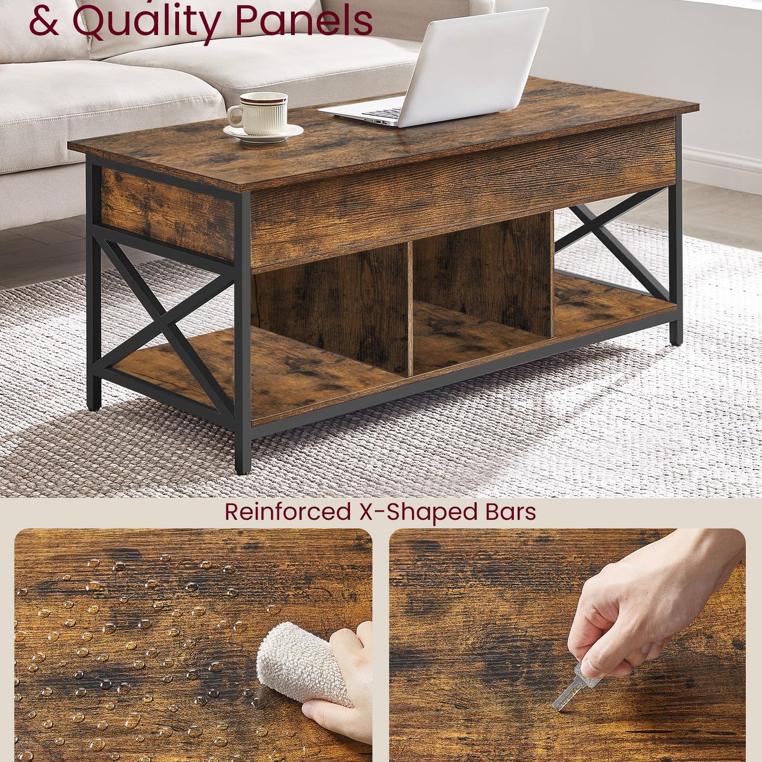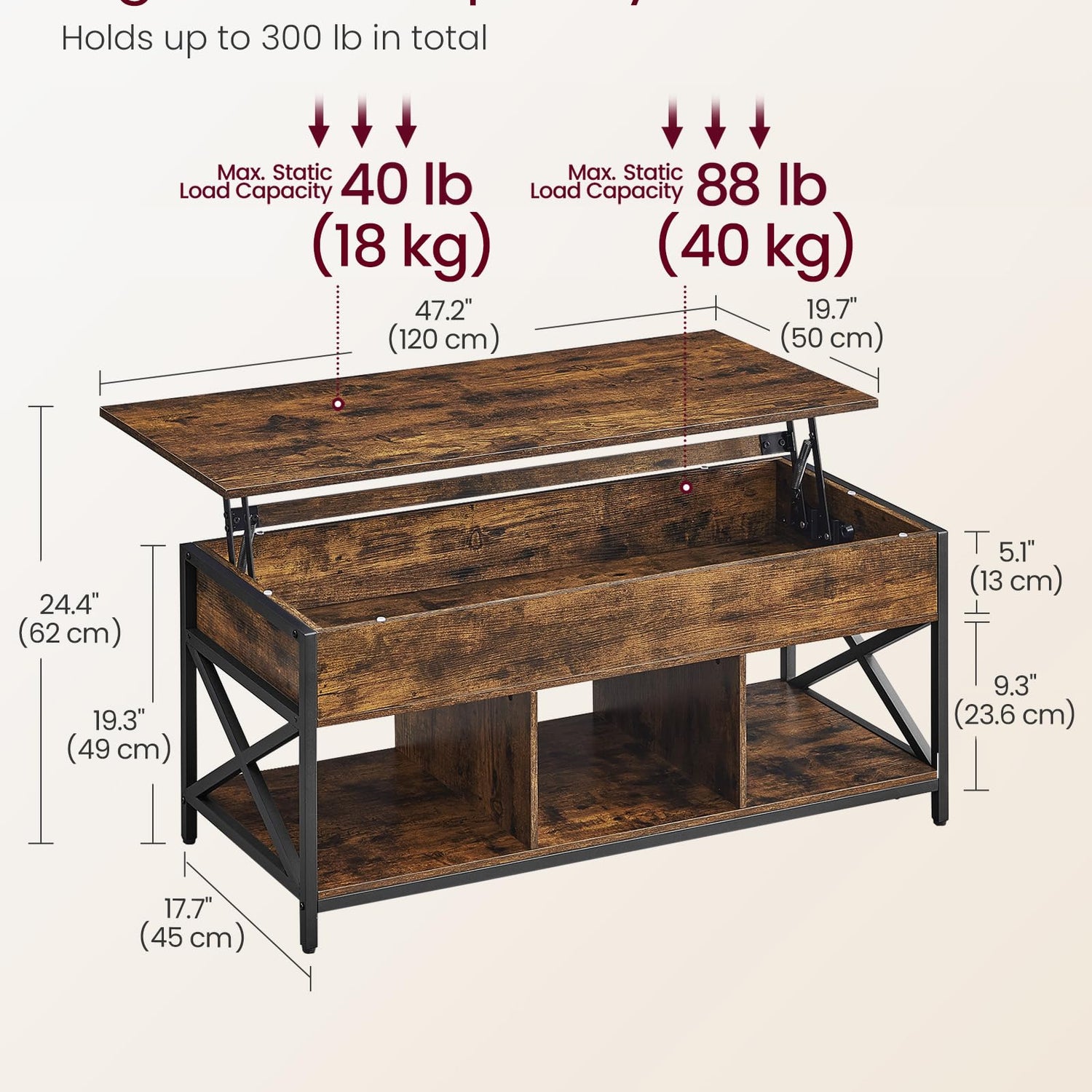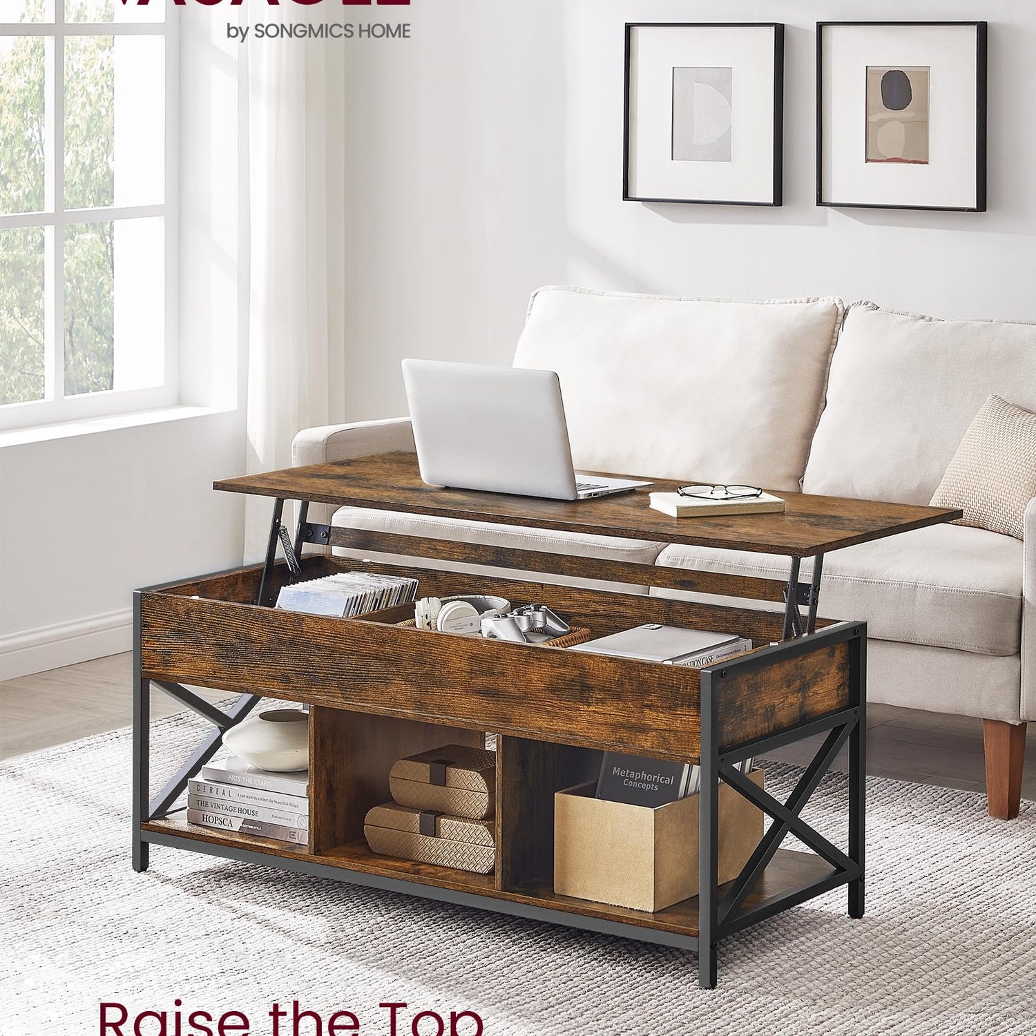 VASAGLE Lift Top Coffee Table, Lift Coffee Table with Storage Shelf, Hidden Compartments and Lifting Top, for Living Room, Office, 19.7 x 47.2 x (19.3-24.4) Inches, Rustic Brown and Black ULCT212B01
