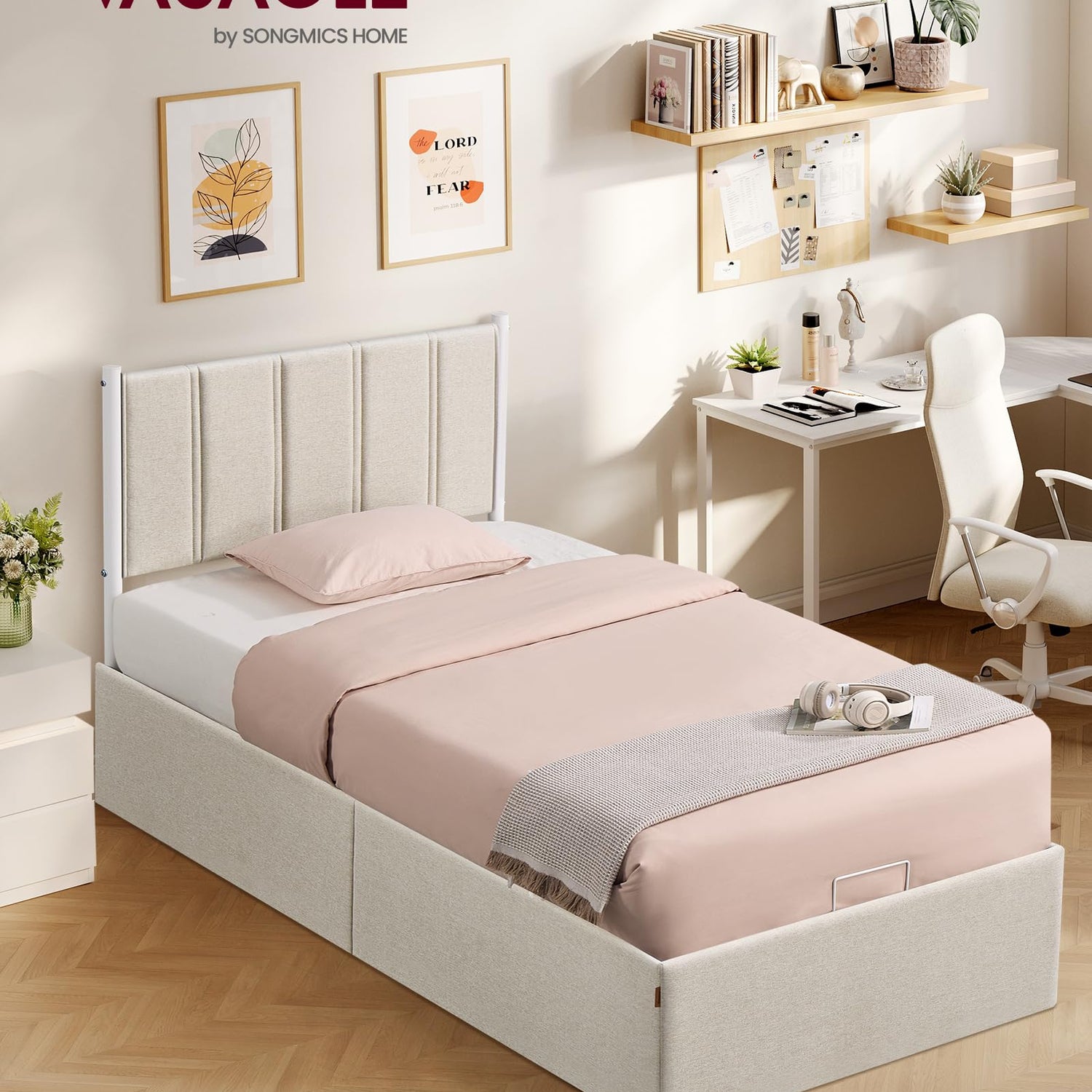 VASAGLE Lift Up Storage Bed Frame Twin Size, Hydraulic Platform Bed, with Upholstered Headboard, 550 lb Weight Capacity, No Box Spring Needed, Easy Assembly, Modern, Cappuccino Beige URMB603W01