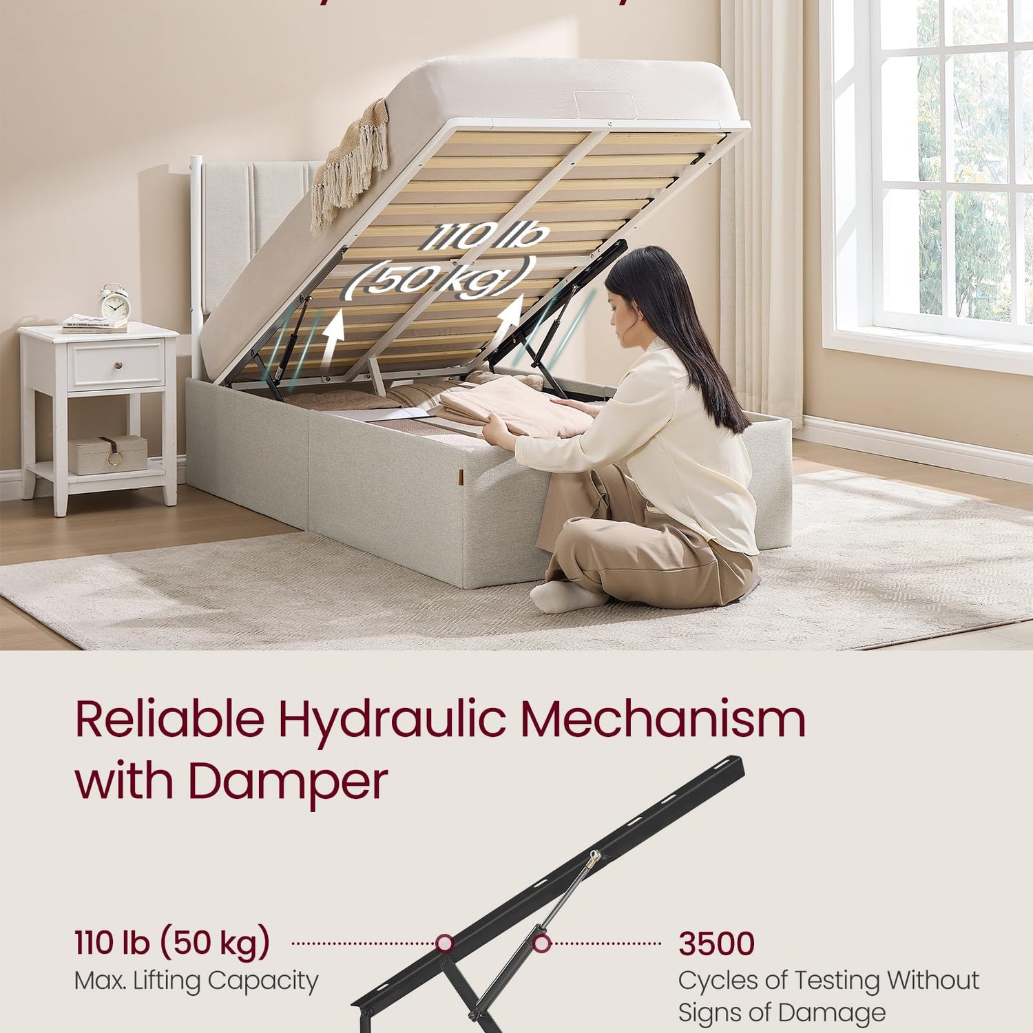 - Safe, Reliable Hydraulic Lift: This bed frame with storage features premium hydraulic lift that can raise up to 110 lb weight with ease, giving you easy access to the under-bed storage. The built-in damper ensures a smooth, safe descent