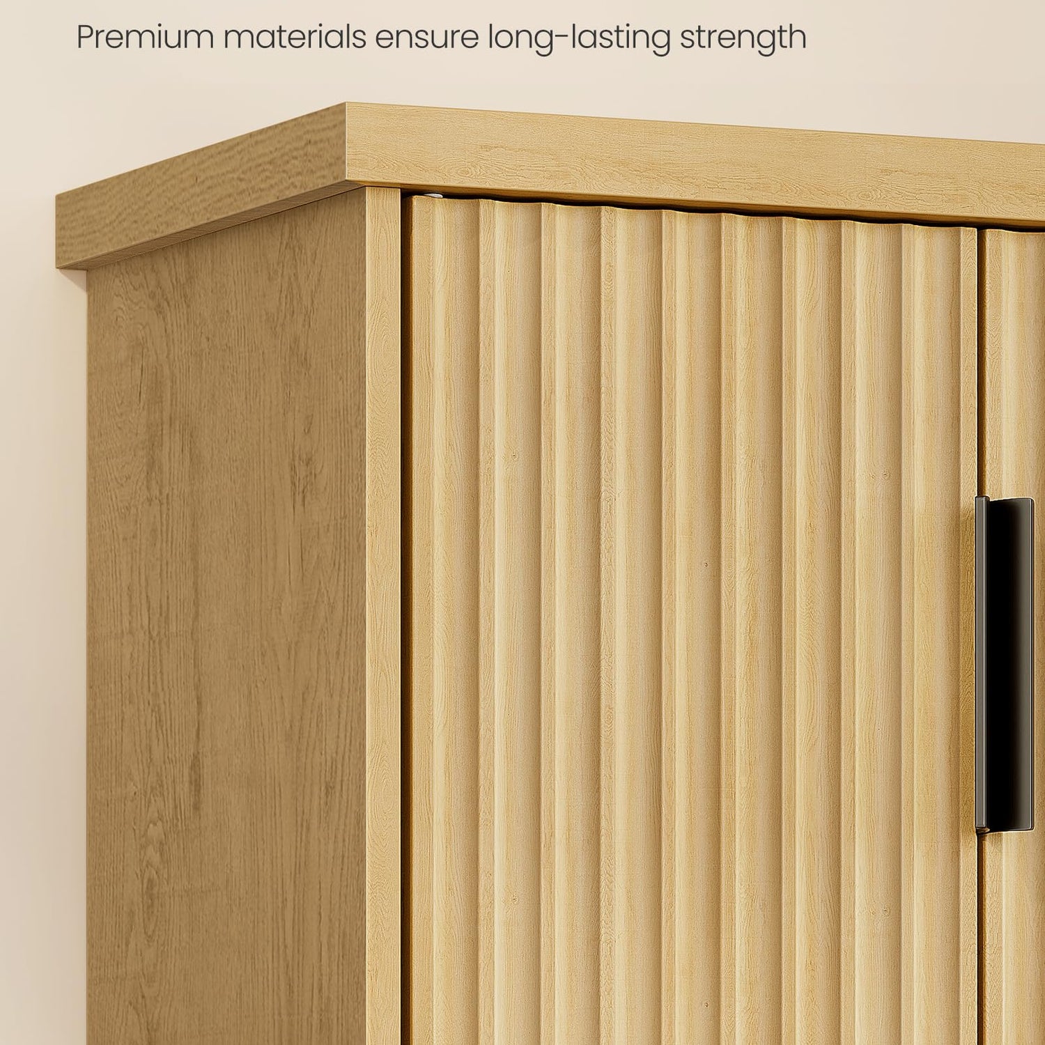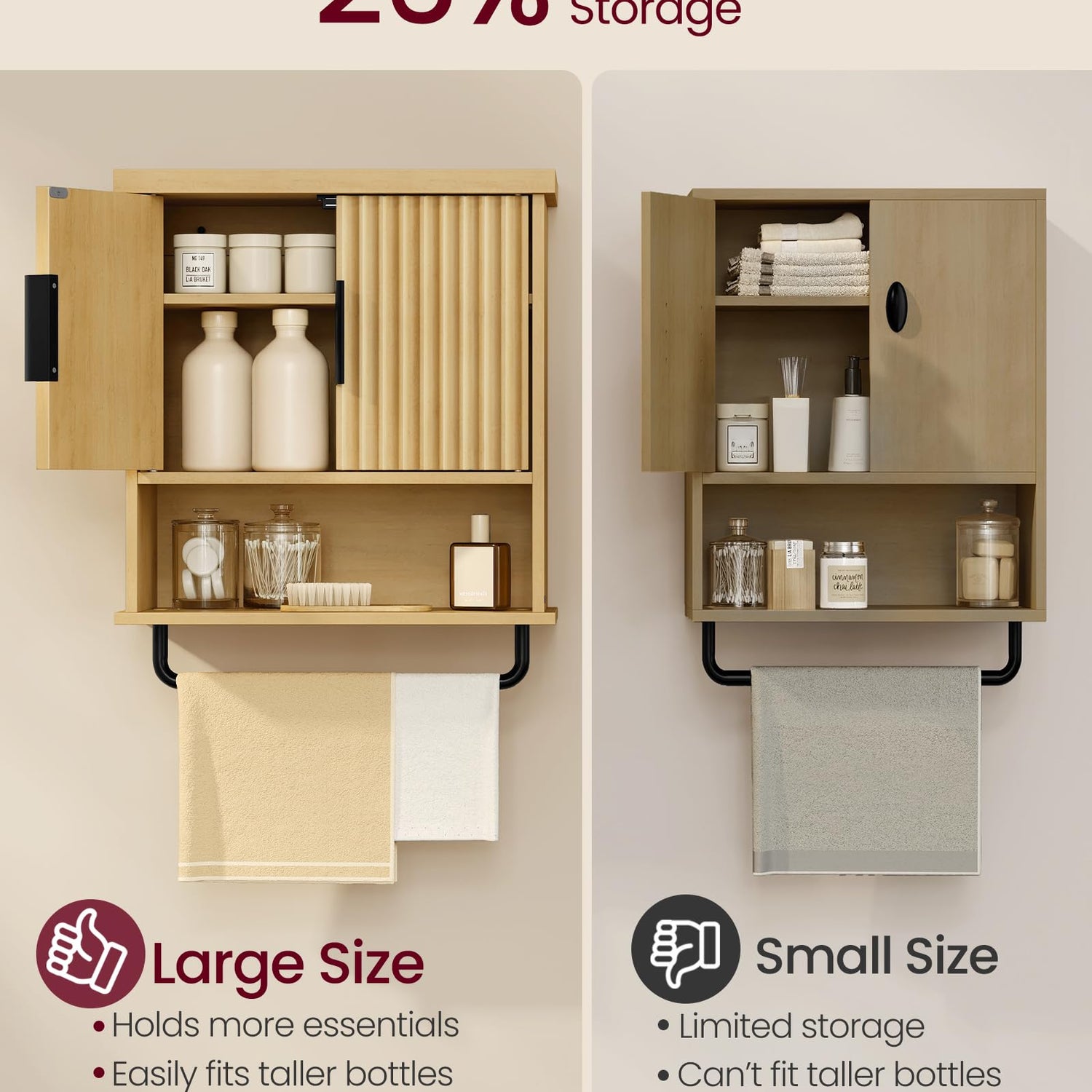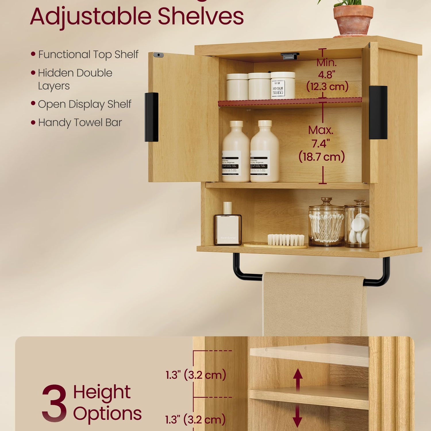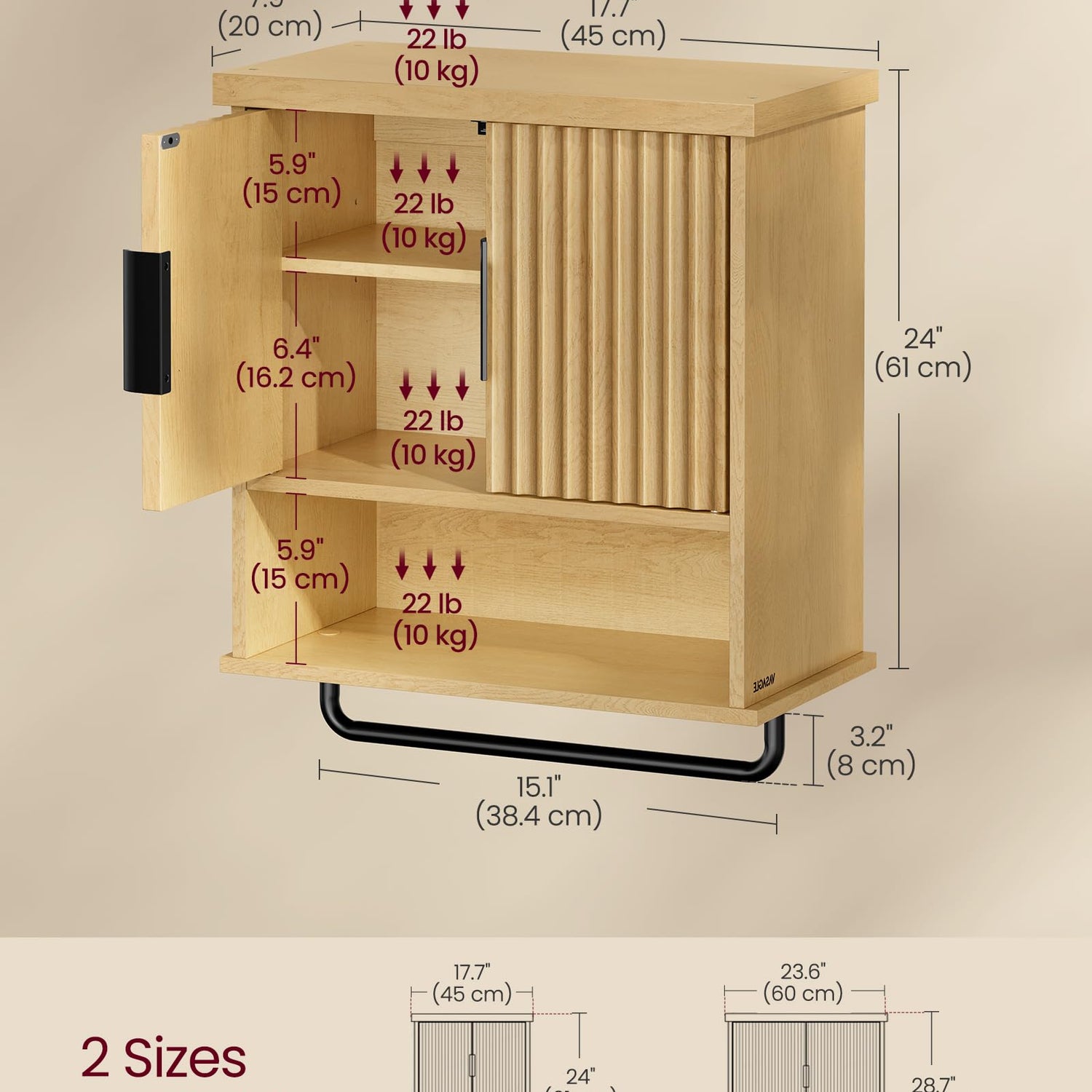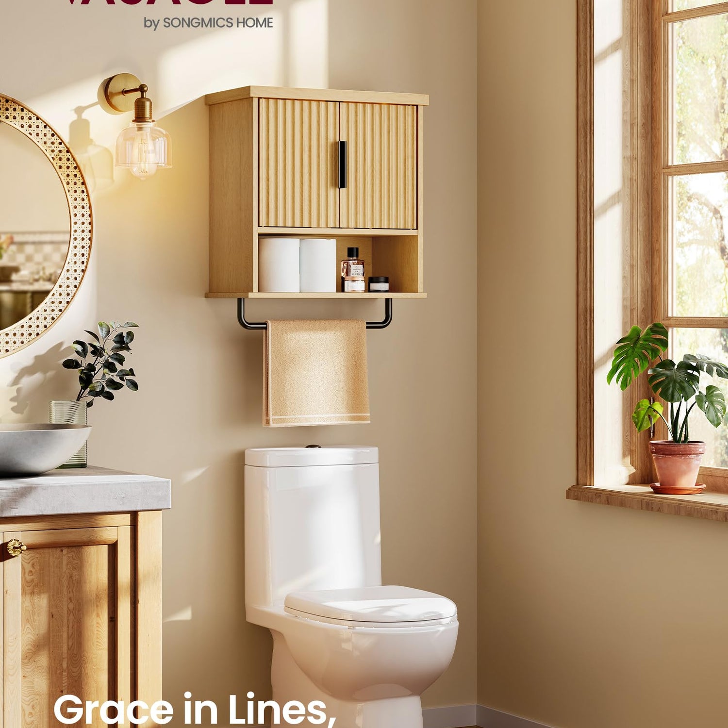 VASAGLE MAXE Collection - Bathroom Cabinet Wall Mounted, Over Toilet Hanging Cabinet with Adjustable Shelf, Towel Bar, Fluted Doors, 7.9 x 17.7 x 24 Inches, Transitional, Oak Beige UBBK137Y01S
