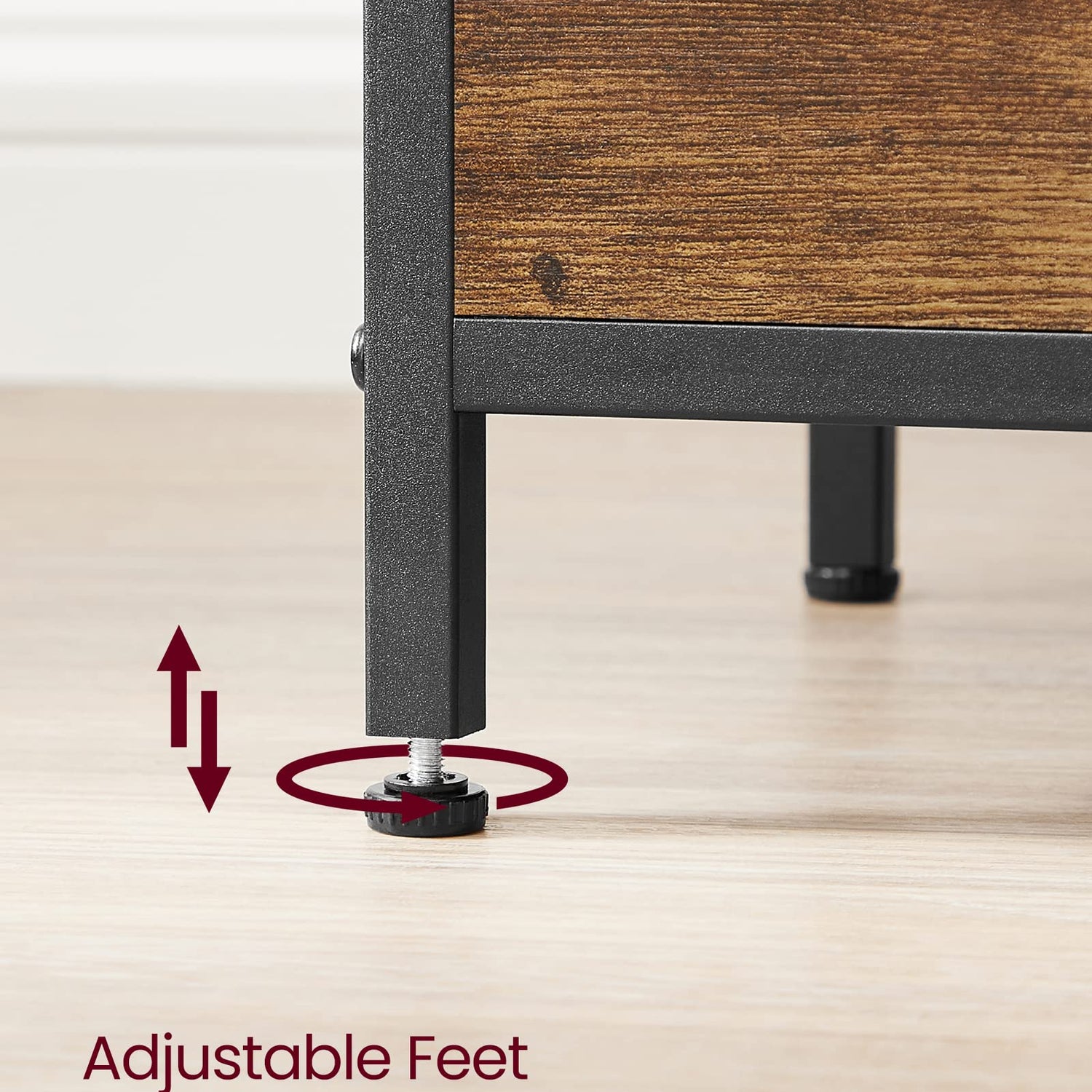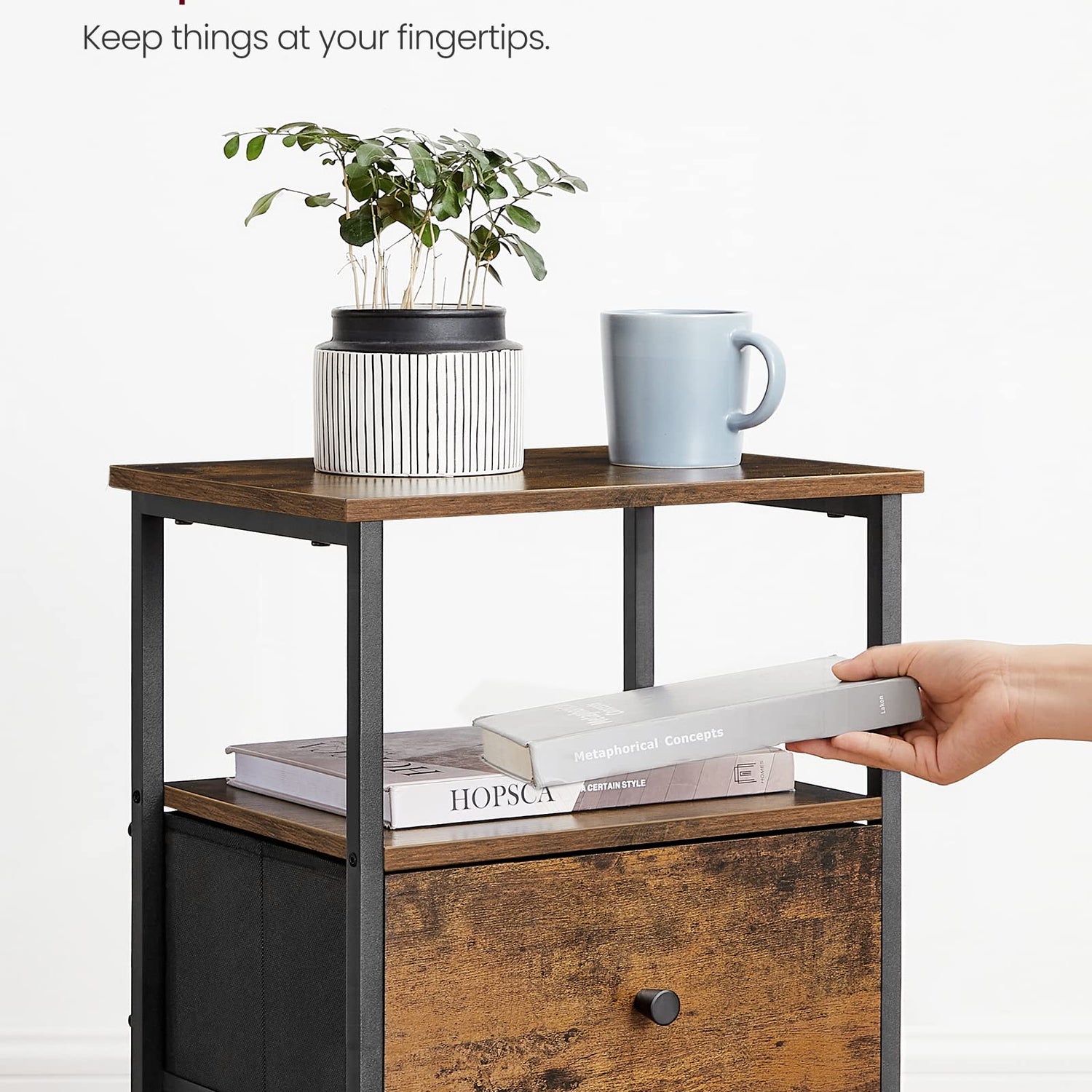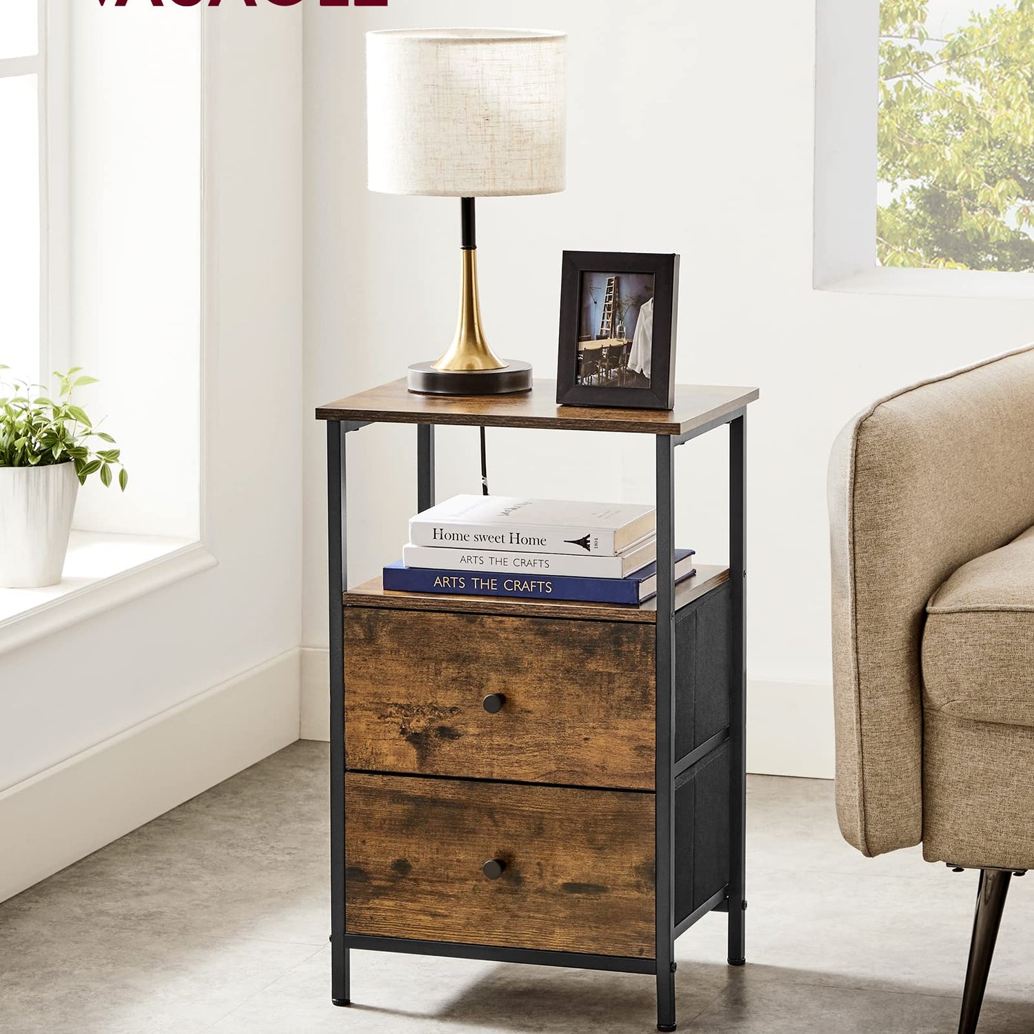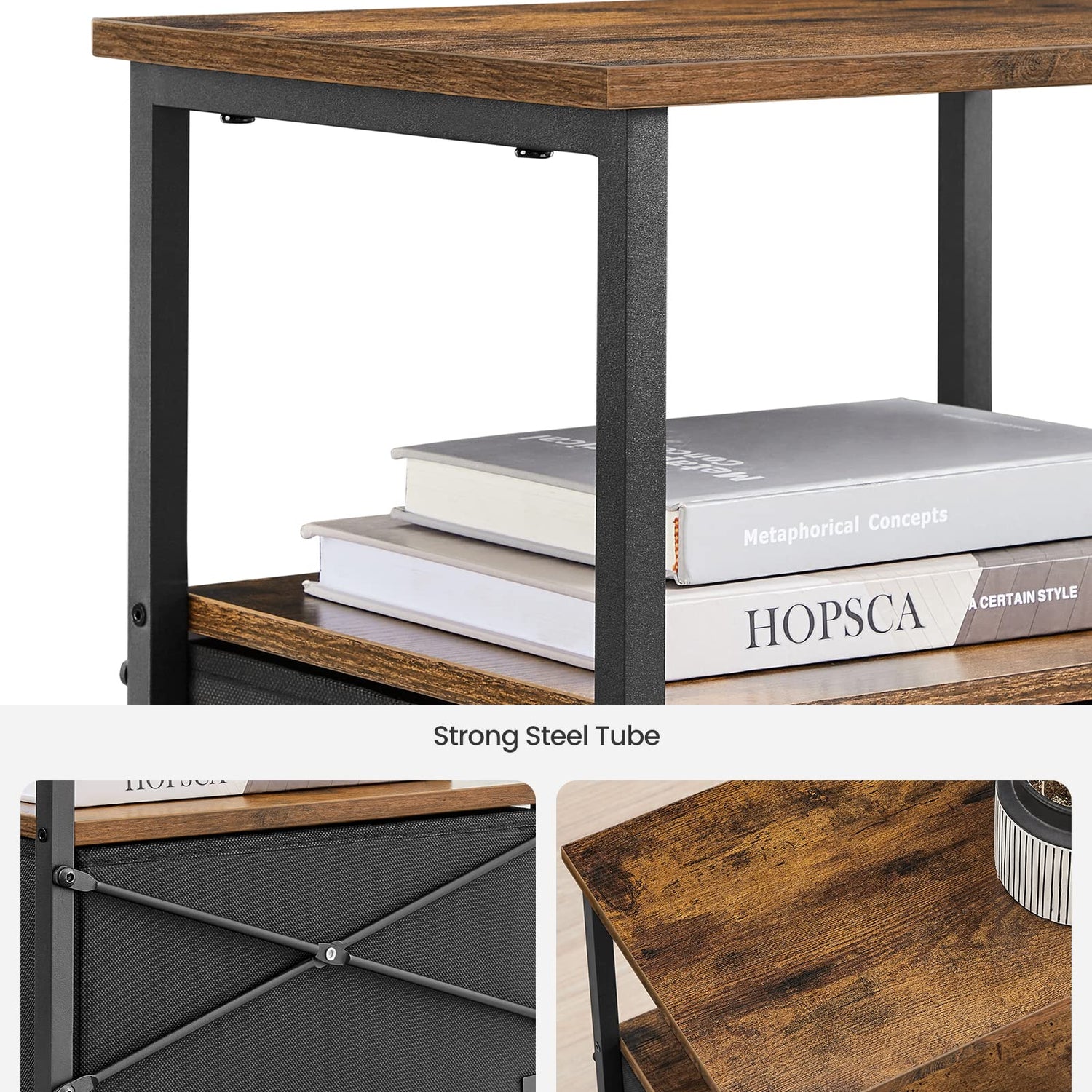 - [Sturdy & Stable] Made with particleboard, a steel frame with an X-bar, a durable non-woven fabric drawer, and balanced by 4 adjustable feet, this end table offers firm, stable, and lasting support