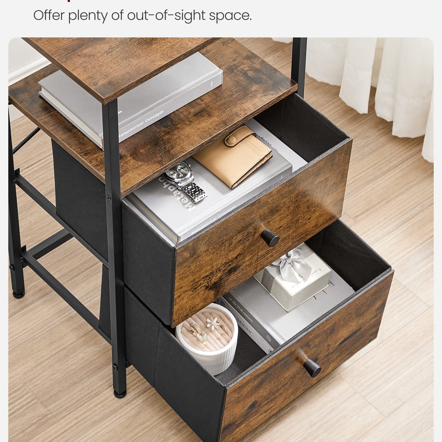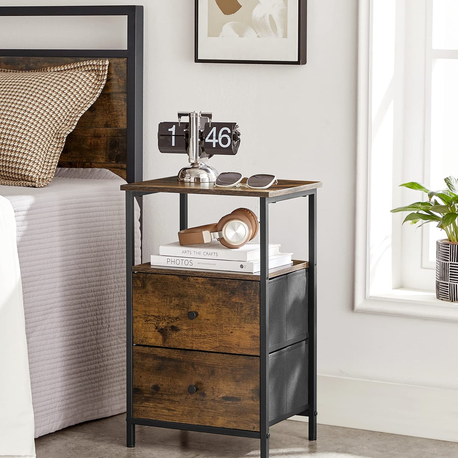 - [Everything by Your Side] Perch your lamp and clock on the top, store books in the middle shelf, and stash cables and remotes in the drawers—this side table with 2 shelves and 2 drawers offers tons of storage for you, from open storage to closed storage