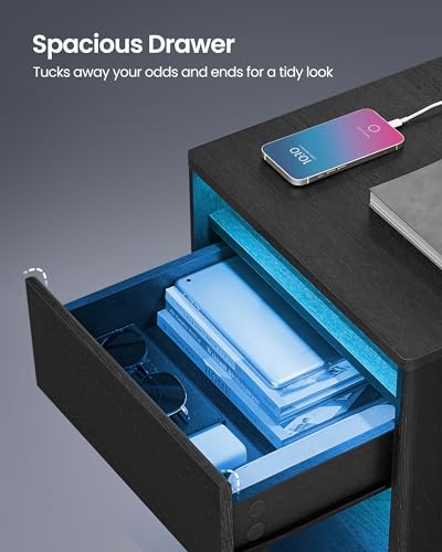 VASAGLE Nightstand with Charging Station, Side End Adjustable LED Lights, Bedside Table with Drawer 2 AC Outlets, 2 USB Ports, Modern, for Bedroom, 13.7" D x 15.7" W x 21.7" H, Black