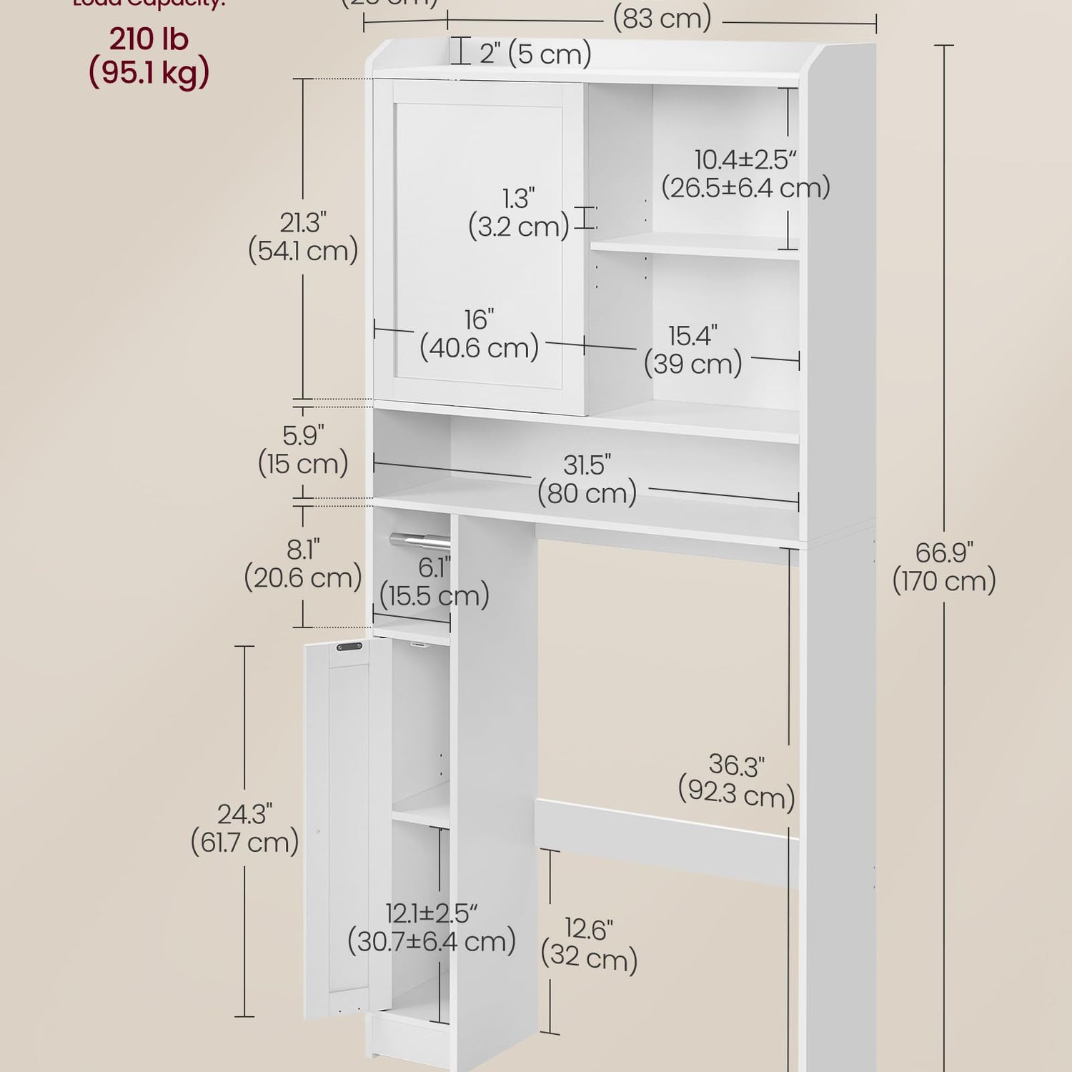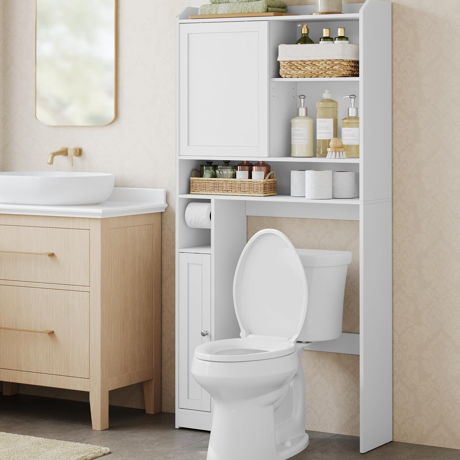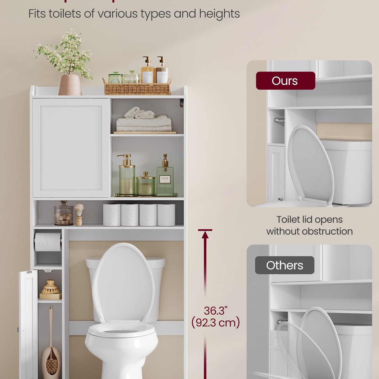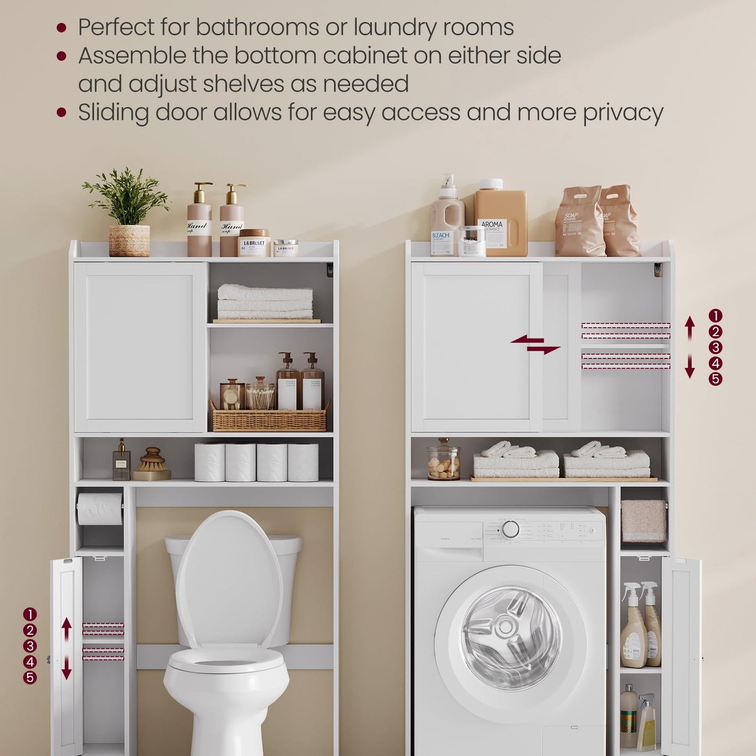VASAGLE Over The Toilet Storage Shelf, Bathroom Storage Cabinet with Sliding Door, Adjustable Shelves, Toilet Paper Holder, Space-Saving, Modern, 9.8 x 32.7 x 66.9 Inches, Cloud White UBTS018W01