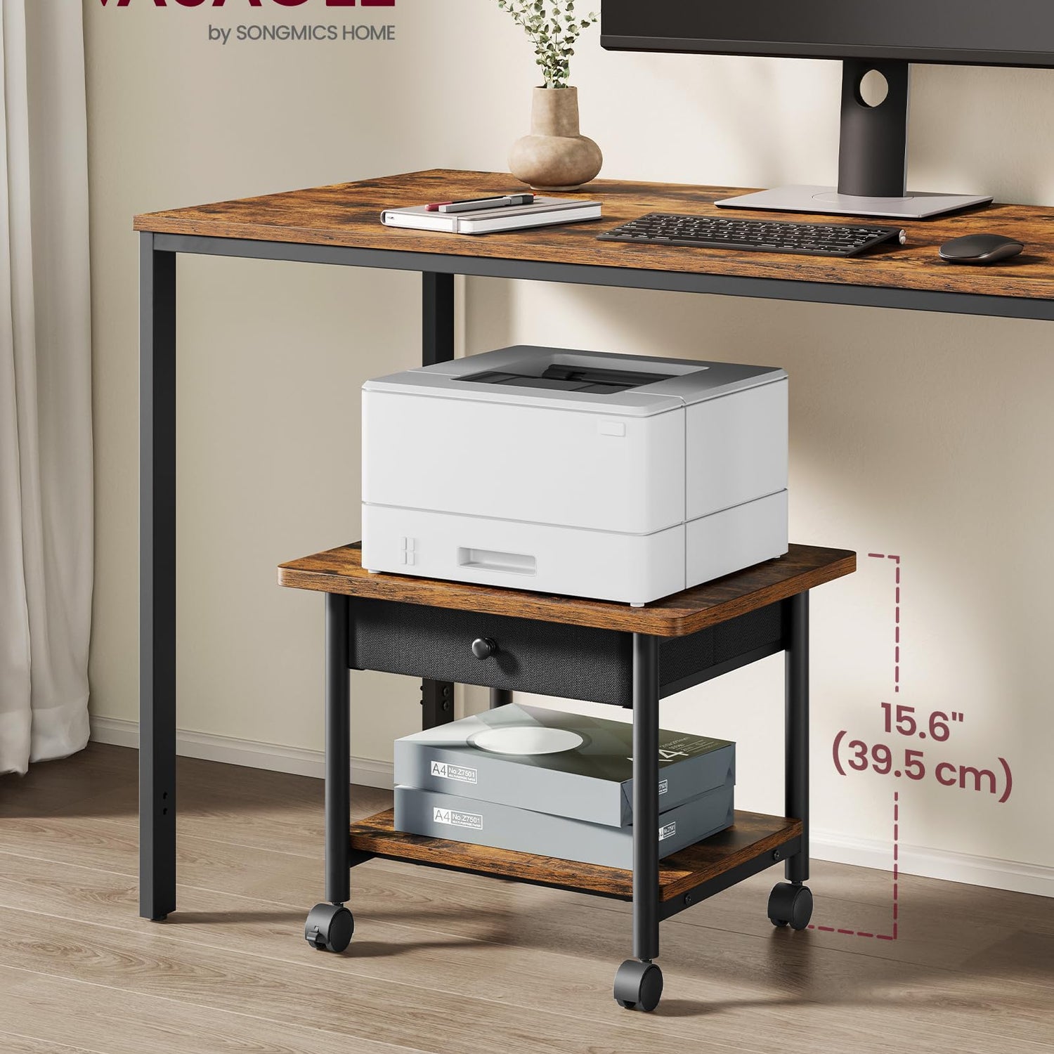 VASAGLE Printer Stand, Under Desk Printer Stand with Wheels, Drawer with Divider, Bottom Shelf, Fits Inkjet, Laser, Photo, All-in-One Printers, Home Office, Rustic Brown and Ink Black UOPS004B01