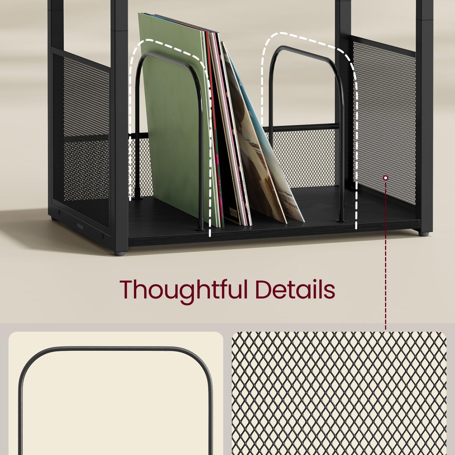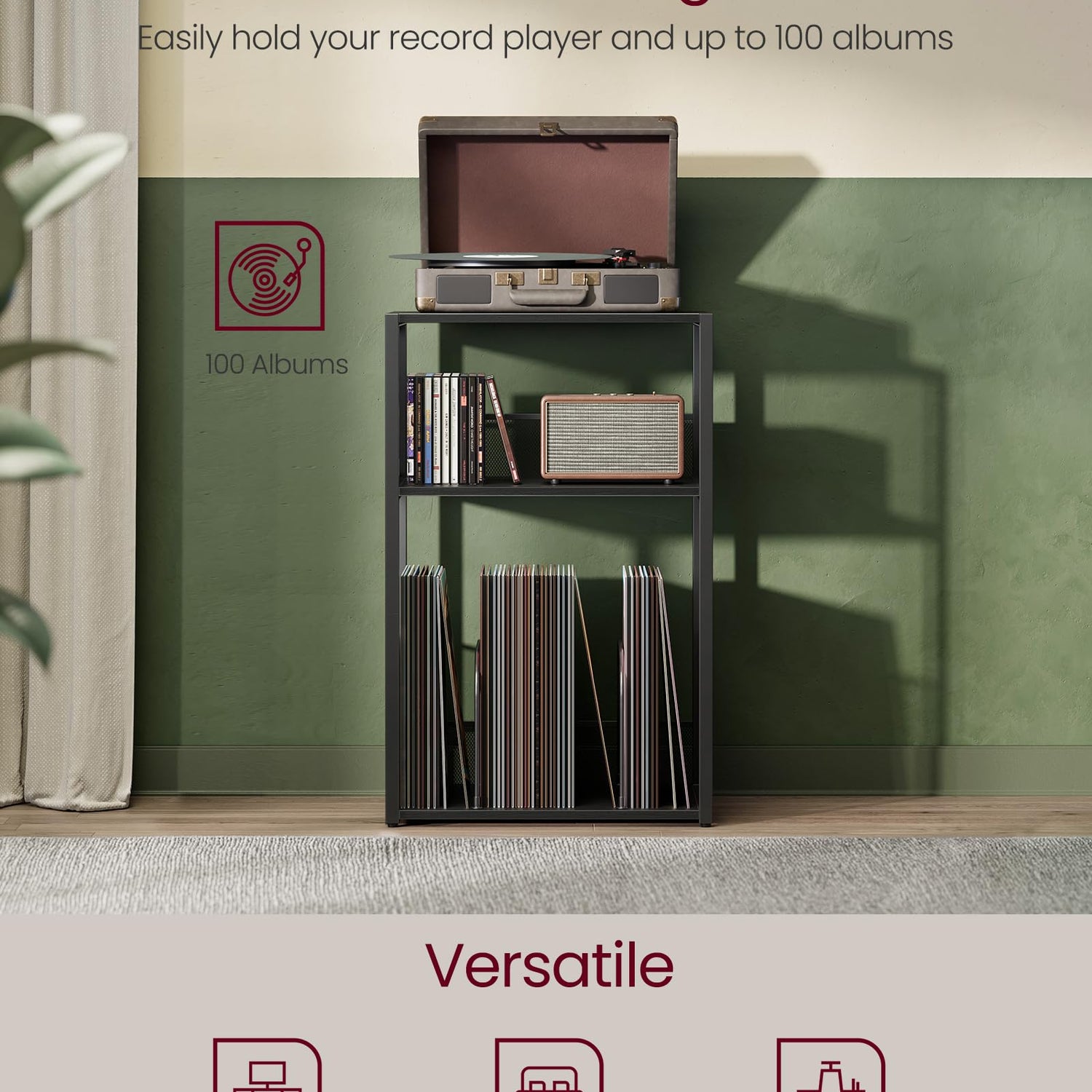 - 【3-TIER DESIGN】This bedside table features a tabletop for your record player and 2 open shelves that can hold up to 100 albums. Enjoy a tidy and organized music area