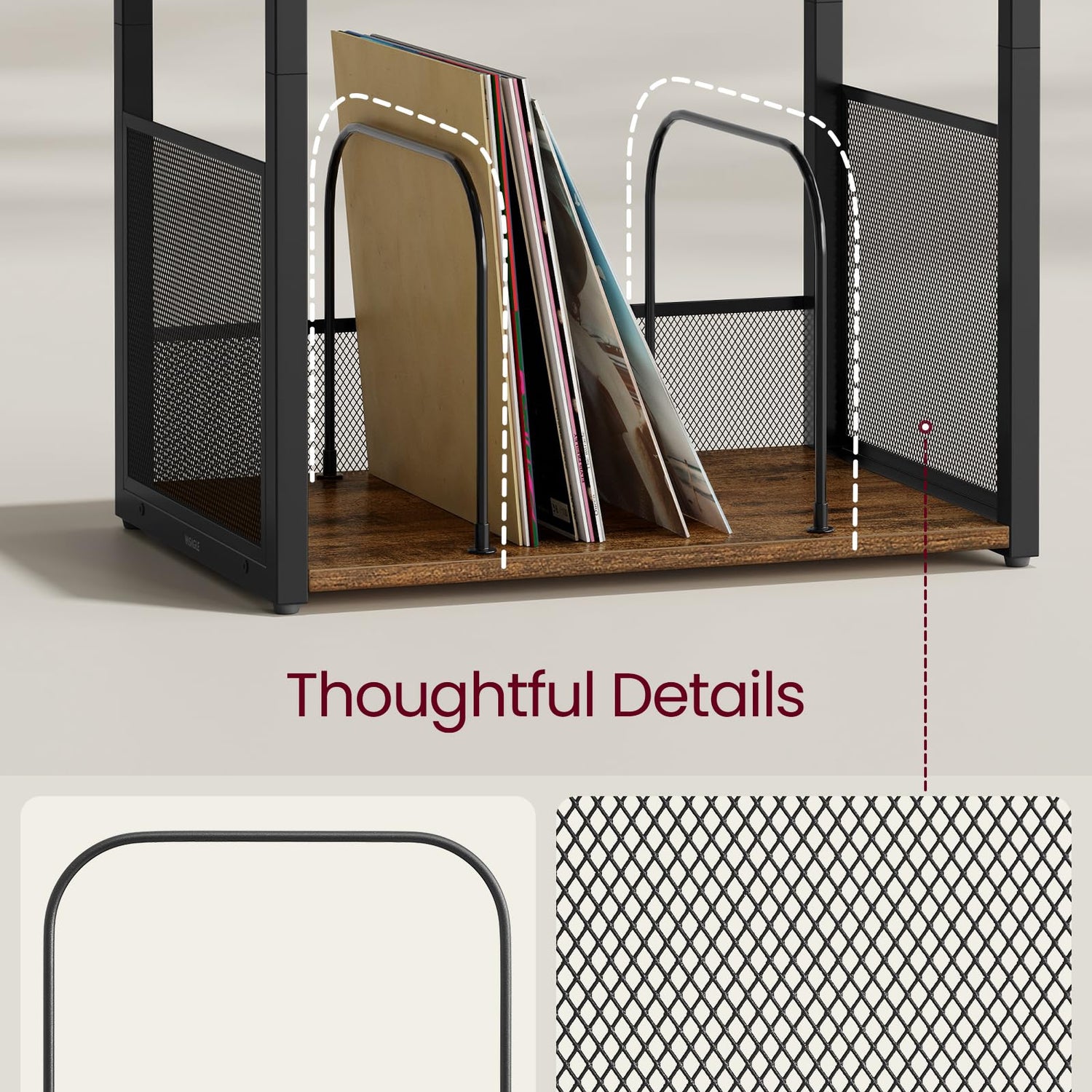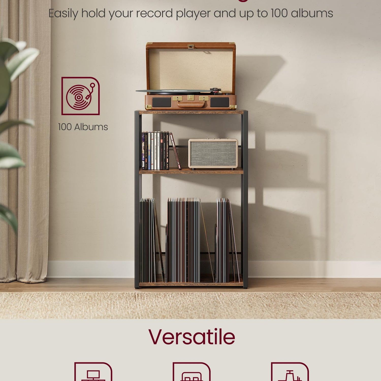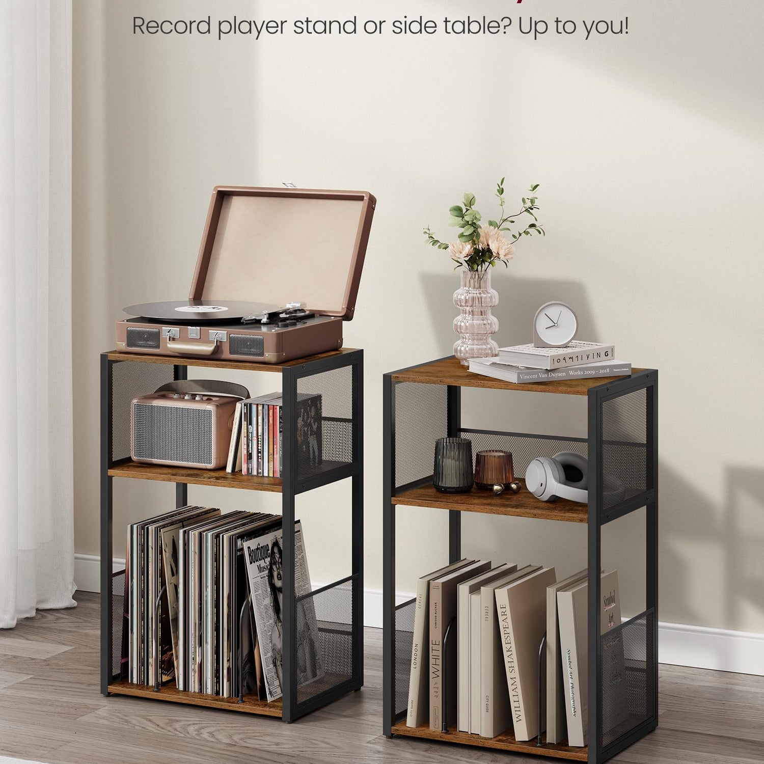 - 【3-TIER DESIGN】This bedside table features a tabletop for your record player and 2 open shelves that can hold up to 100 albums. Enjoy a tidy and organized music area