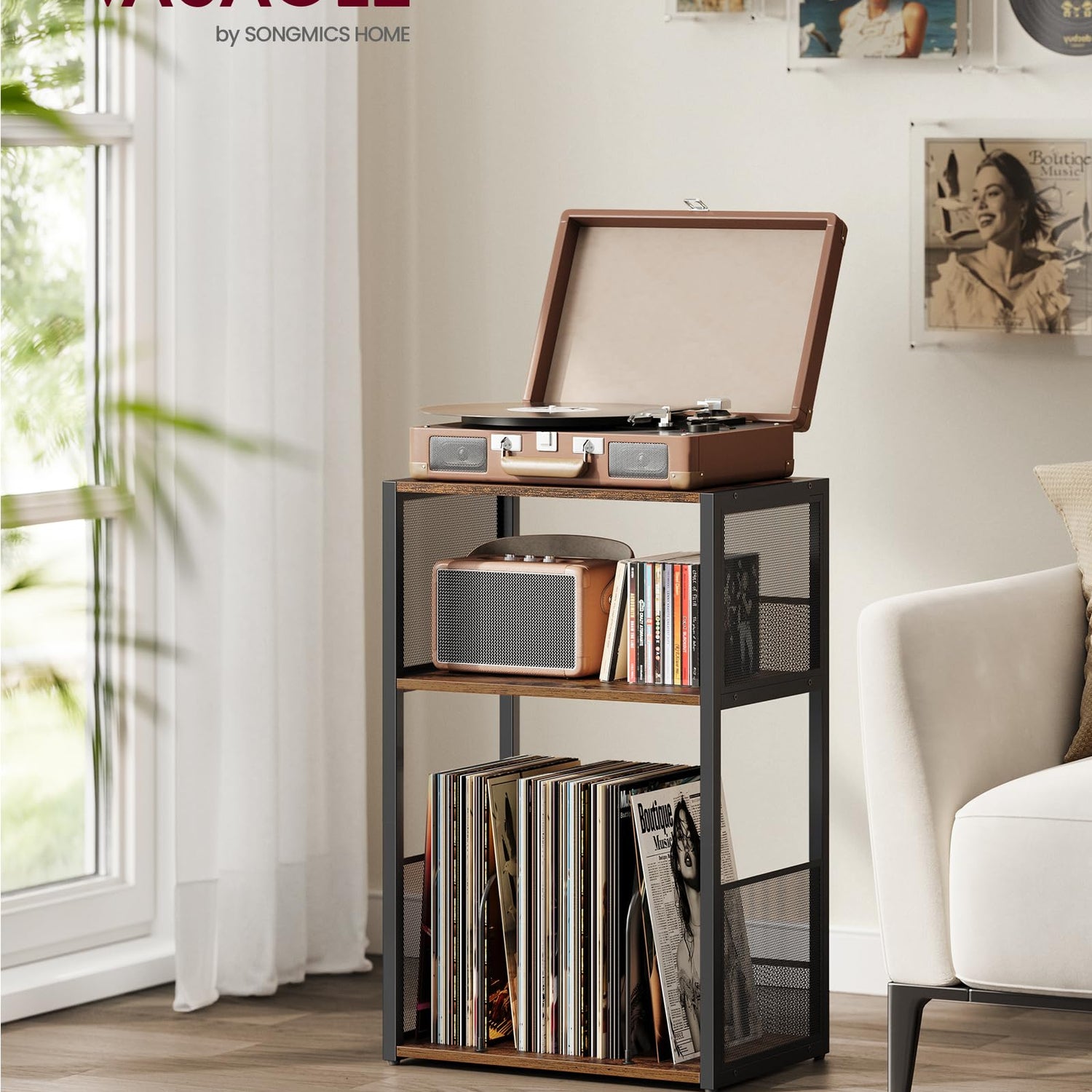 VASAGLE Record Player Stand, 3-Tier Side Table, Vinyl Record Storage up to 100 Albums, End Table for Living Room, Bedroom, Rustic Brown ULET275K01