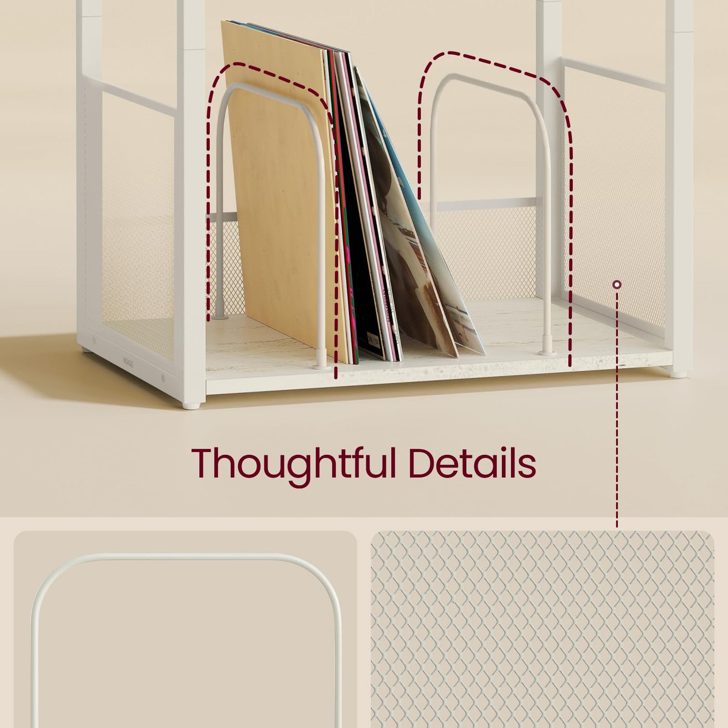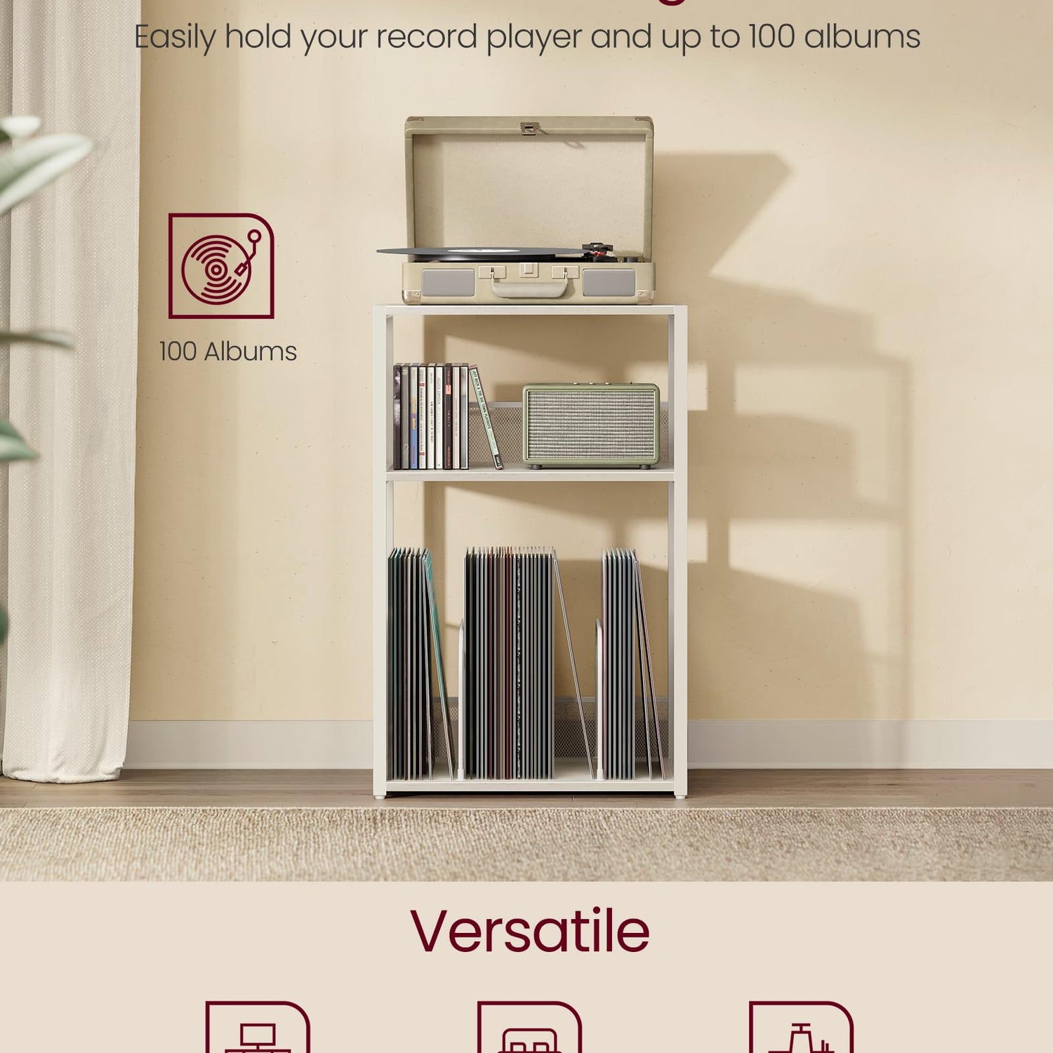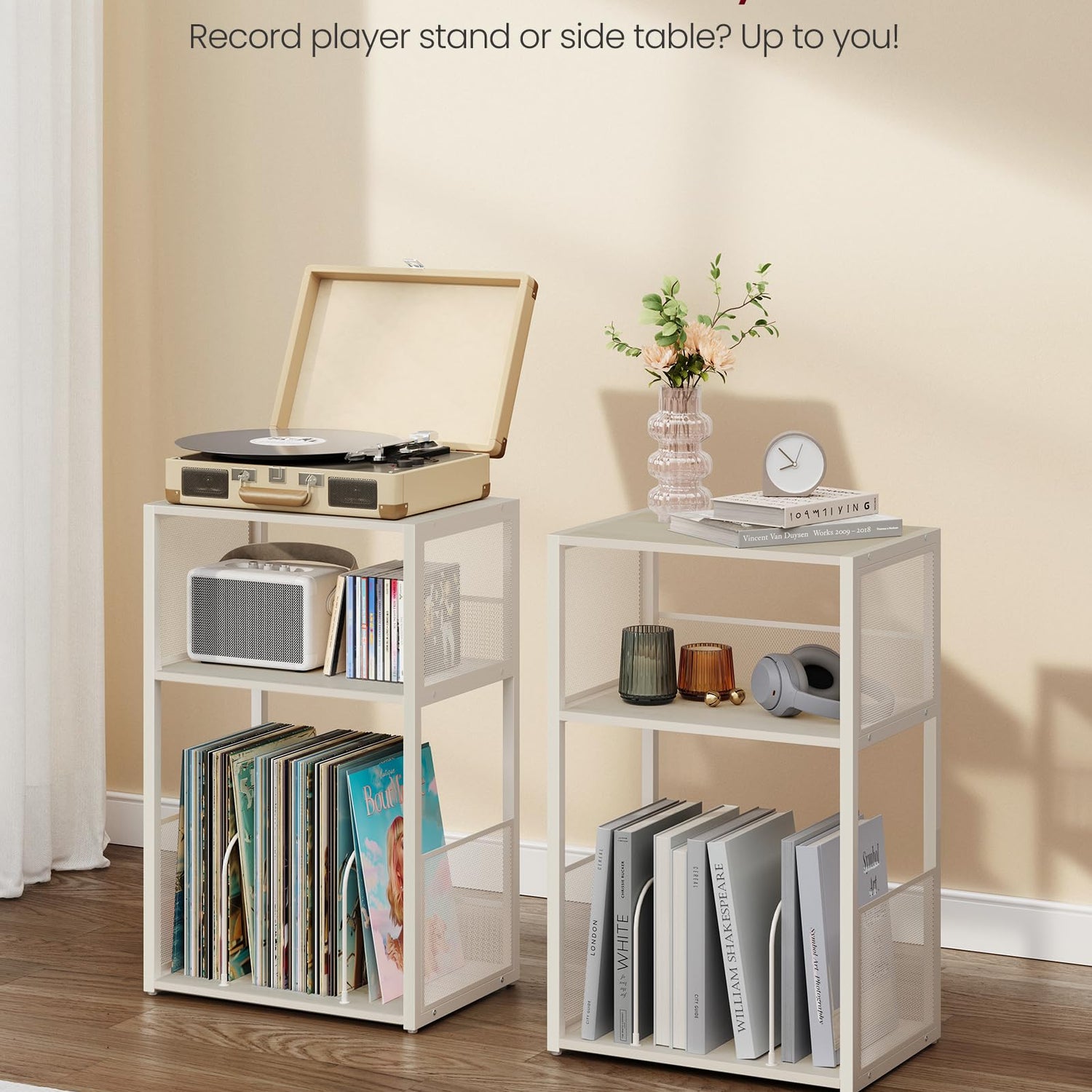 - 【3-TIER DESIGN】This bedside table features a tabletop for your record player and 2 open shelves that can hold up to 100 albums. Enjoy a tidy and organized music area