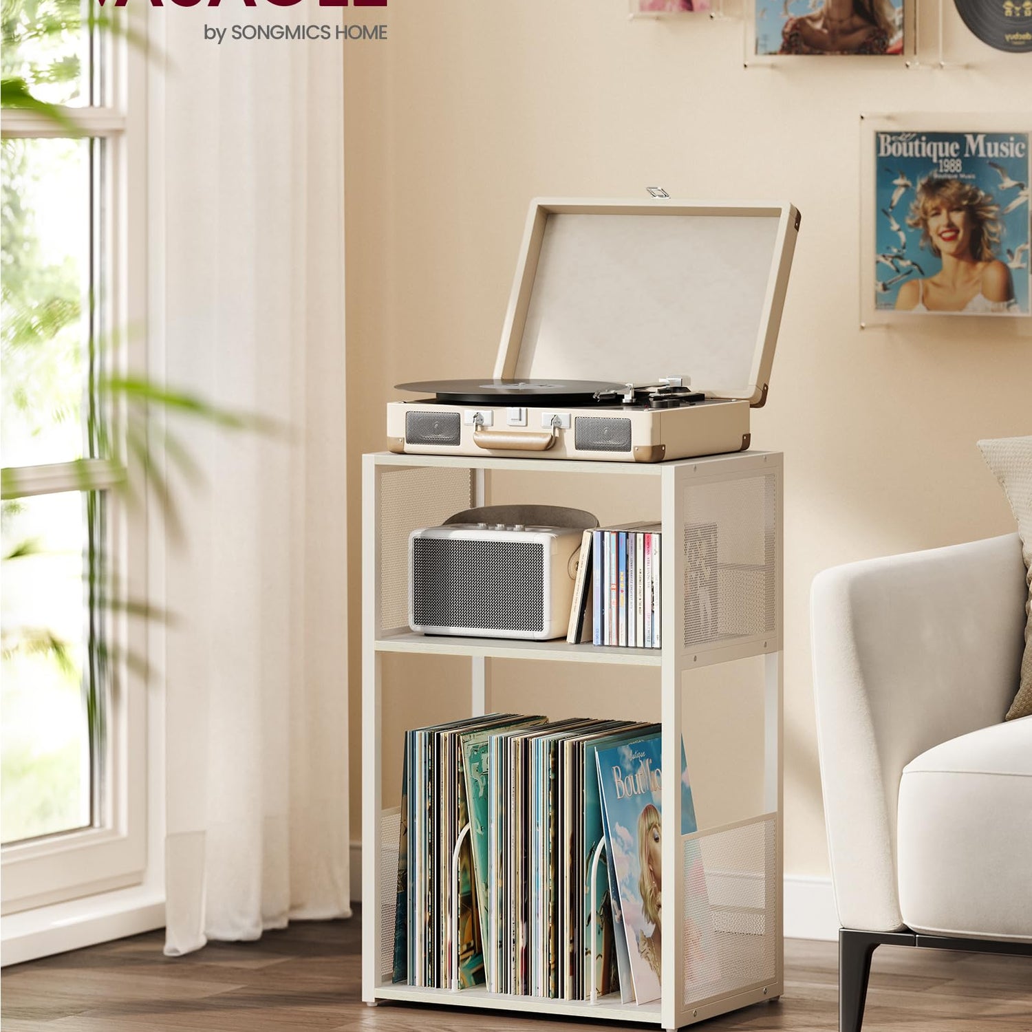 VASAGLE Record Player Stand, 3-Tier Side Table, Vinyl Record Storage up to 100 Albums, End Table for Living Room, Bedroom, Rustic White ULET275W01