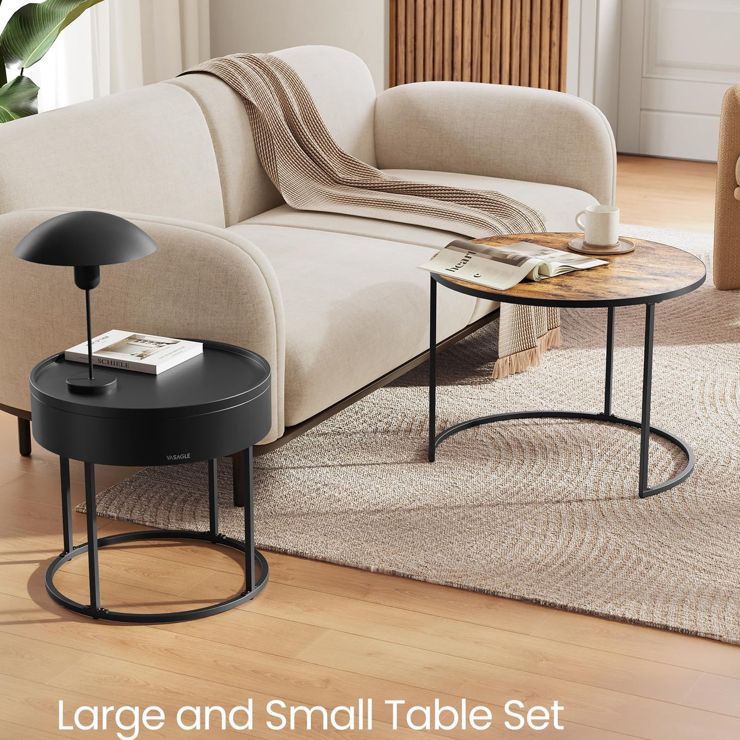 VASAGLE Round Coffee Tables, Set of 2 Nesting Tables, Modern Round Side Tables with Hidden Storage and Top Tray, for Living Room, Bedroom, Office, Rustic Brown and Ink Black ULCT044K01