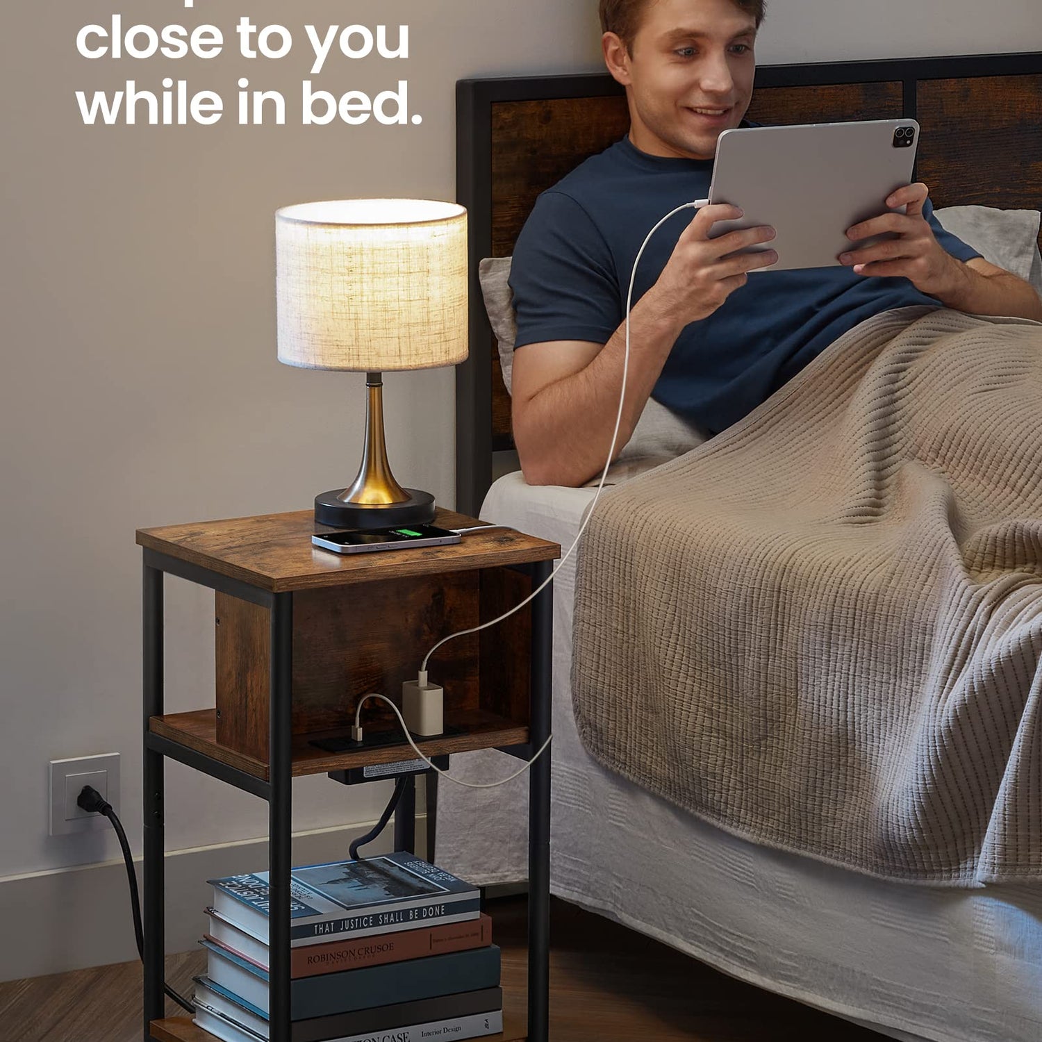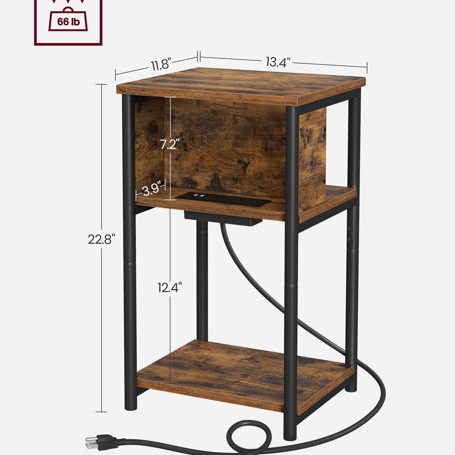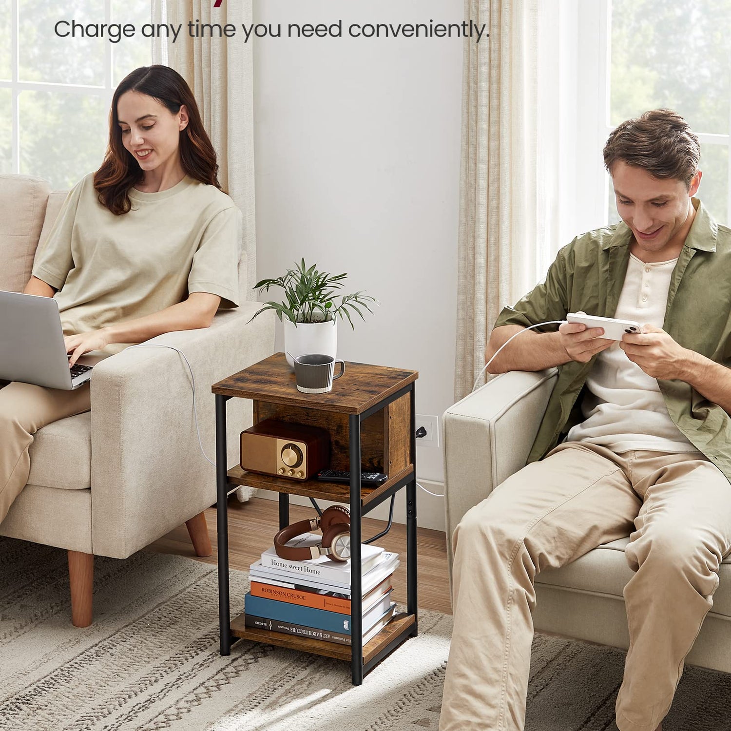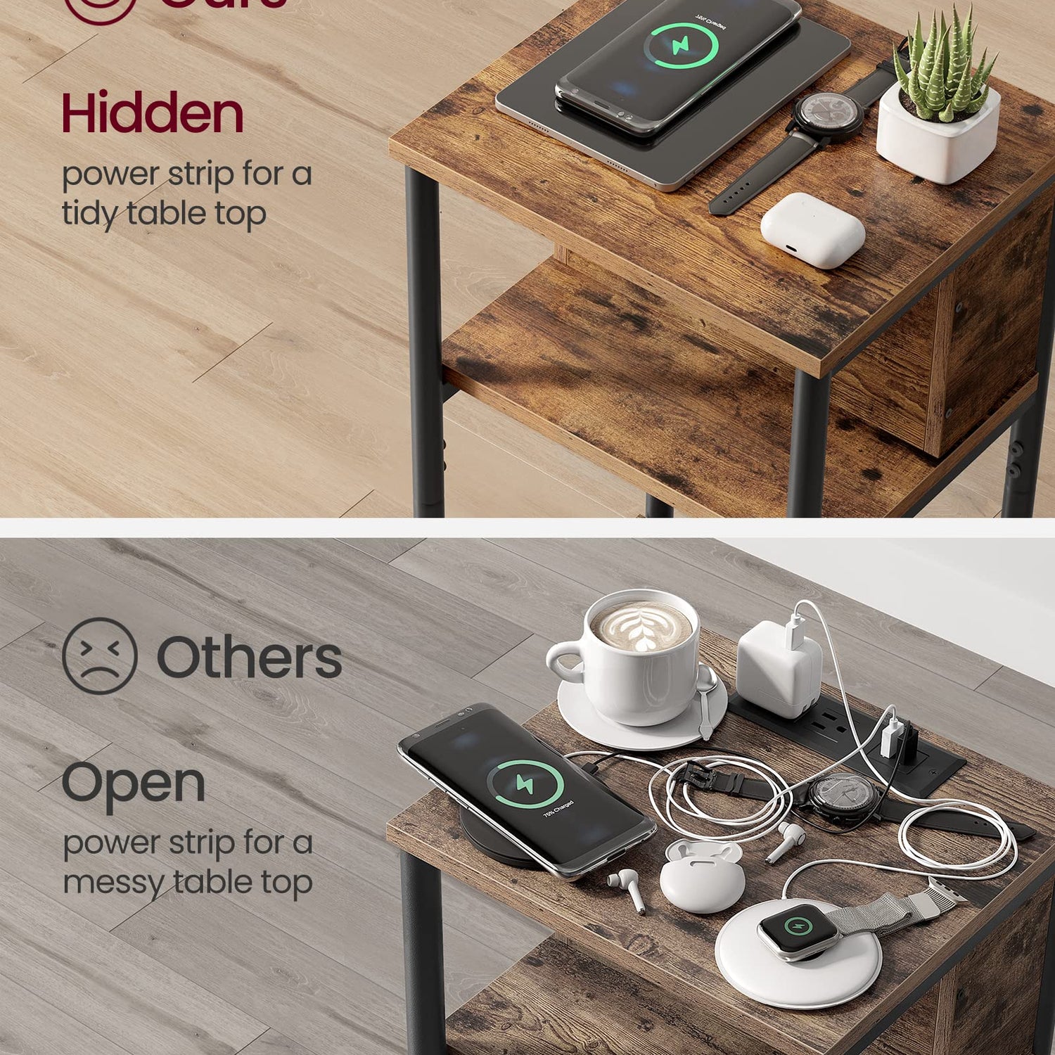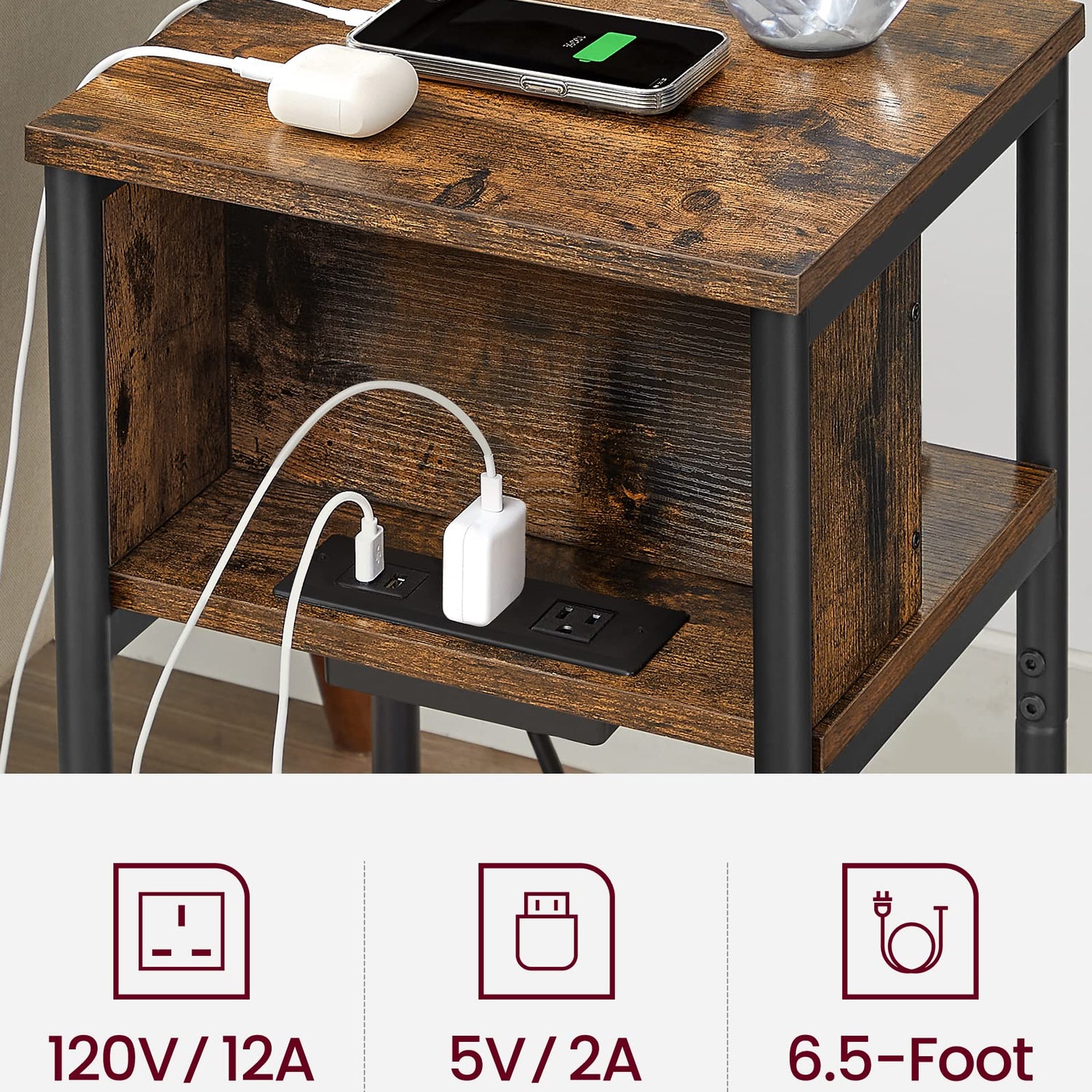 - [Side Table with Charging Station] With 2 AC outlets, 2 USB ports, and a 6.5 ft long cord, this end table allows you to charge your devices conveniently, so you don’t need to go looking for an outlet when your battery is low