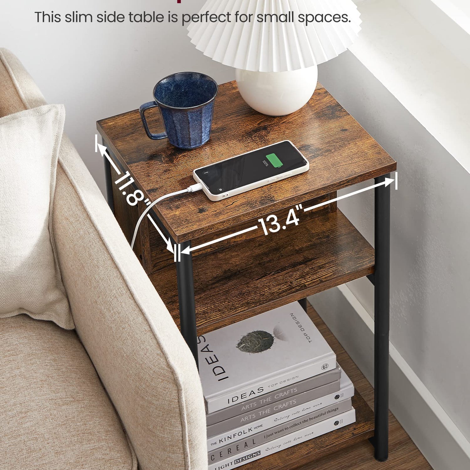 - [Fits Tight Spaces] Sized at 11.8”D x 13.4”W x 22.8”H, this slim end table perfectly fits the small spaces between two upholstered rockers or beside the bed