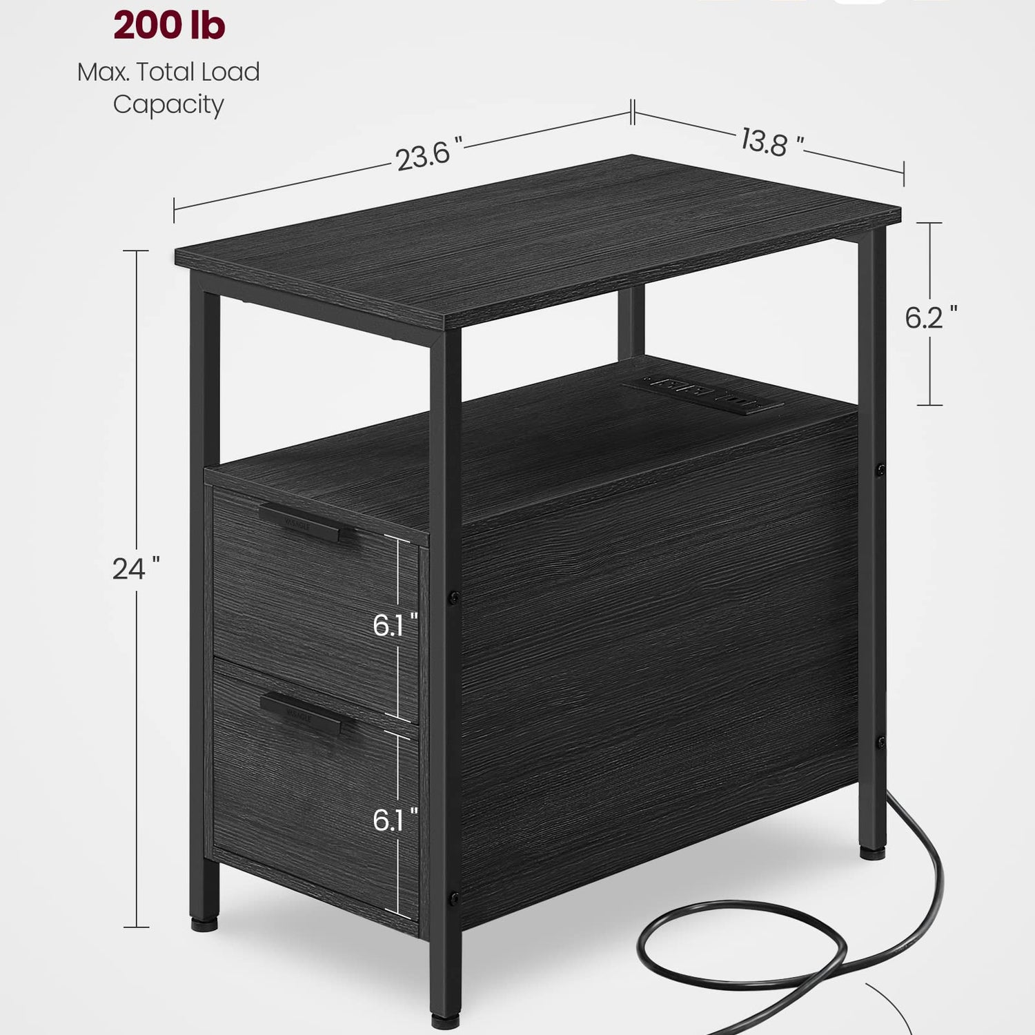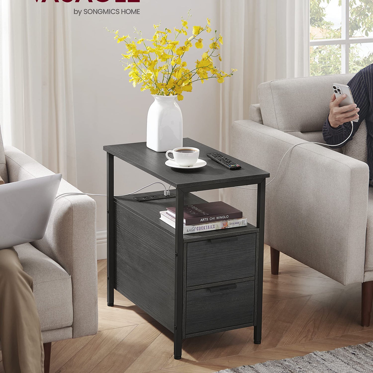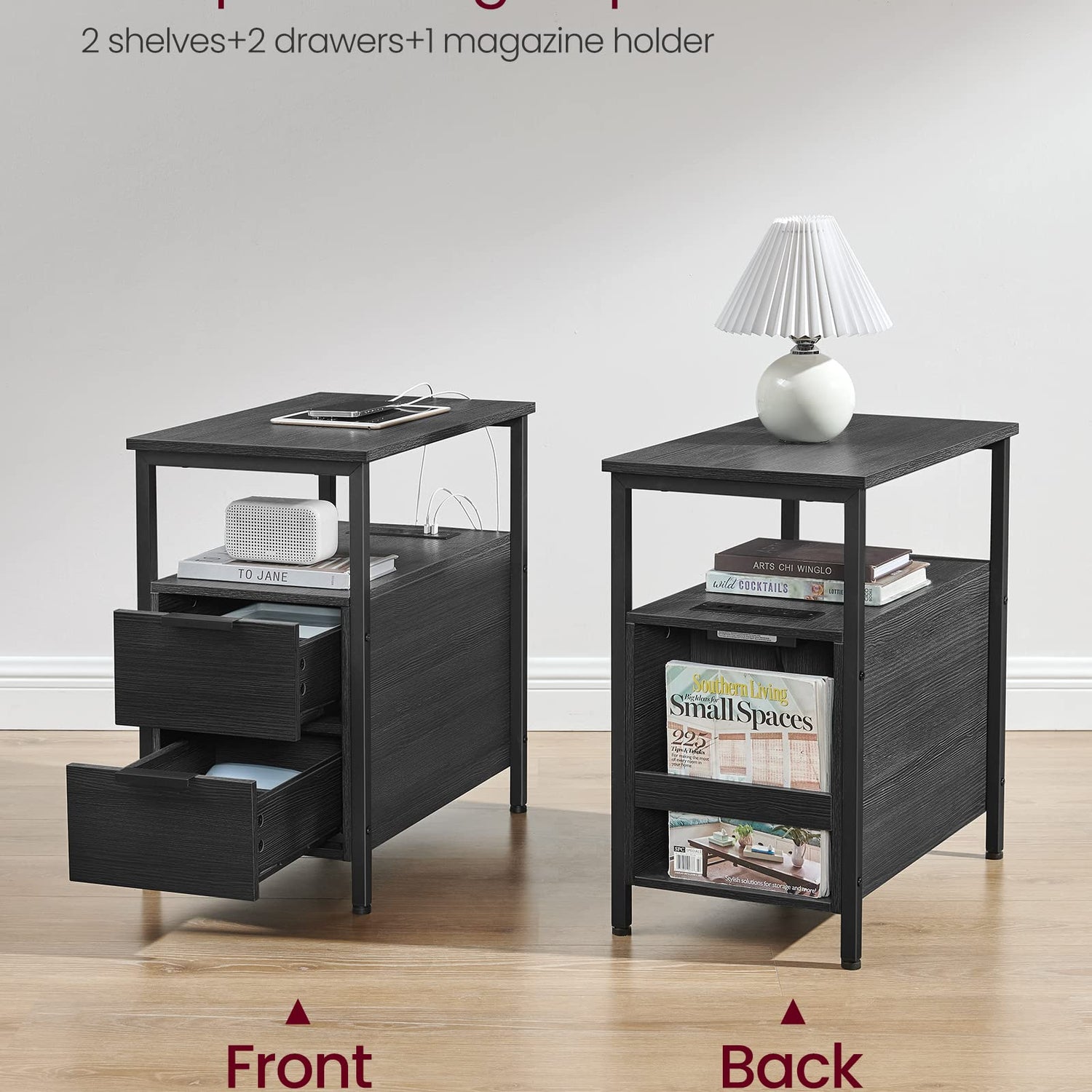 VASAGLE Side Table with Charging Station, Narrow End Table with 2 Drawers, Slim Nightstand and Bedside Table with Storage, for Small Spaces, Black ULET321B22