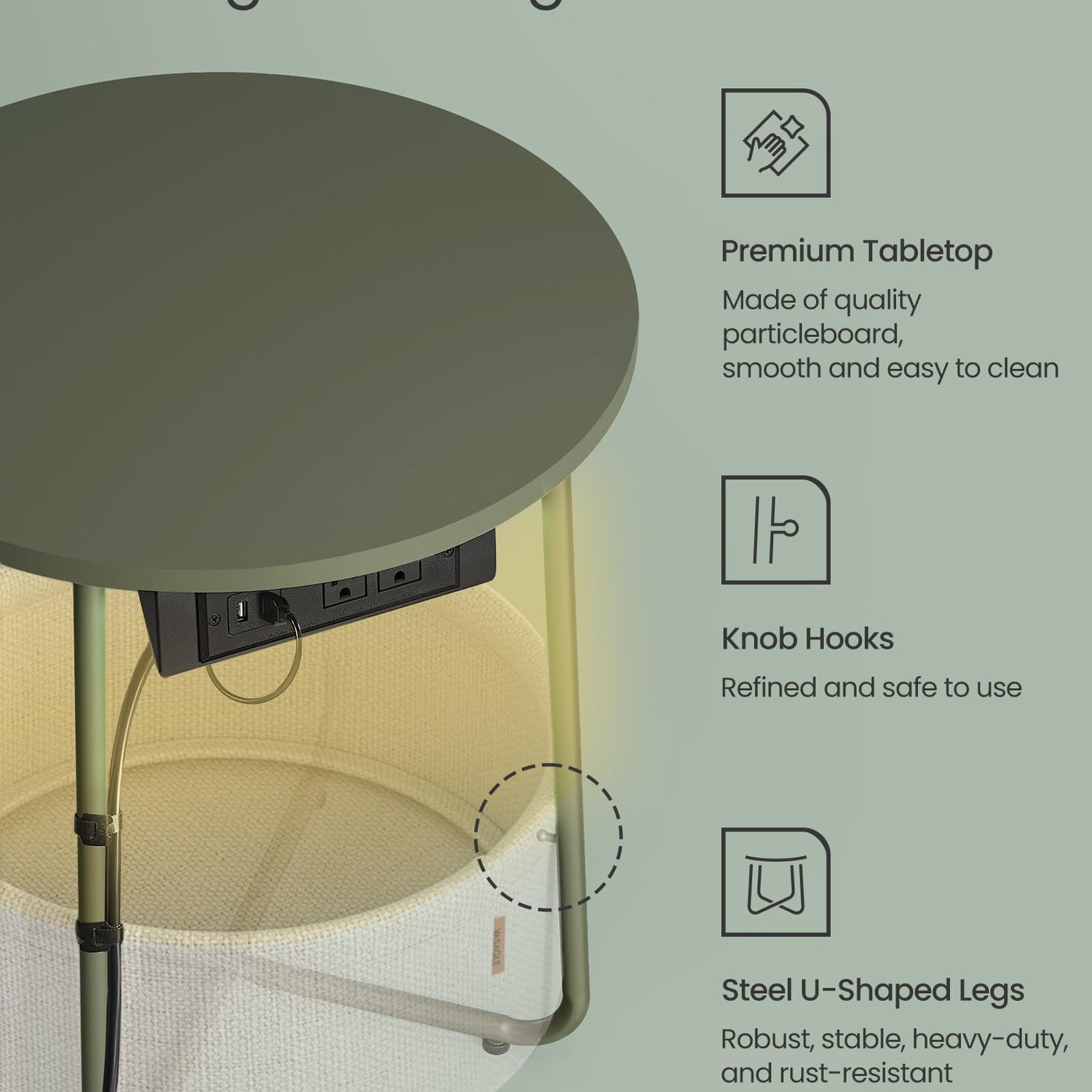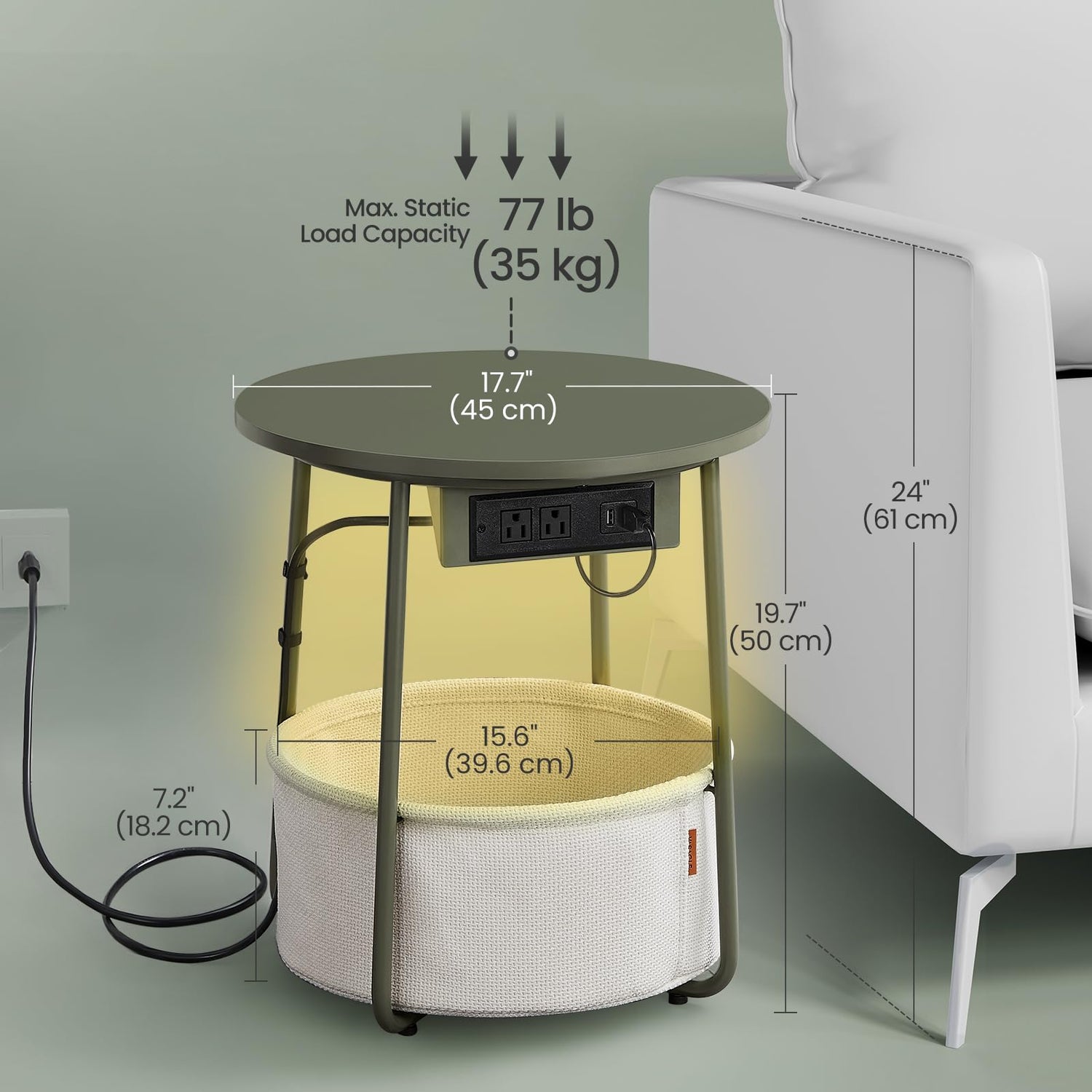 VASAGLE Side Table with Charging Station, Round End Table with Fabric Basket, LED Nightstand with Power Outlets, USB Ports, for Living Room, Bedroom, Modern, Forest Green and Cream White ULET227C01