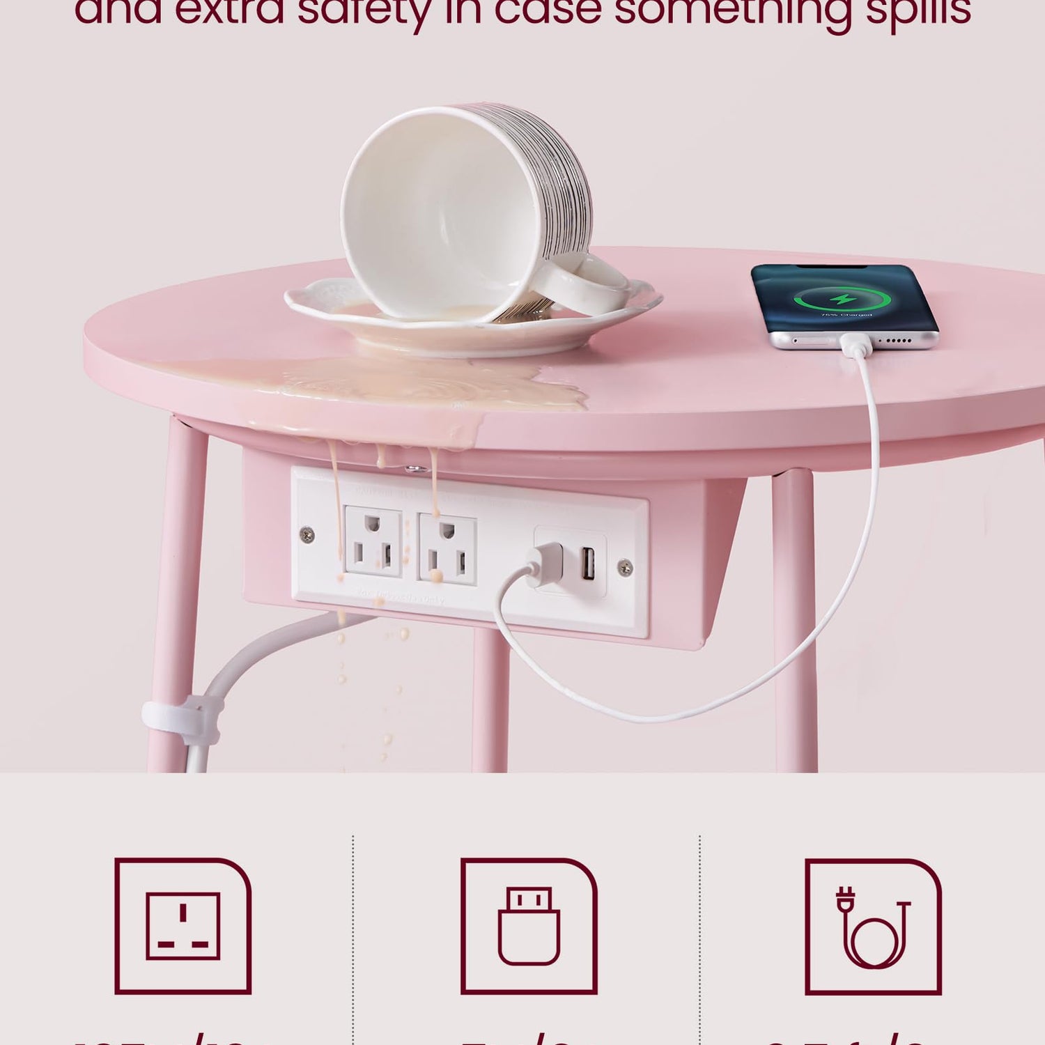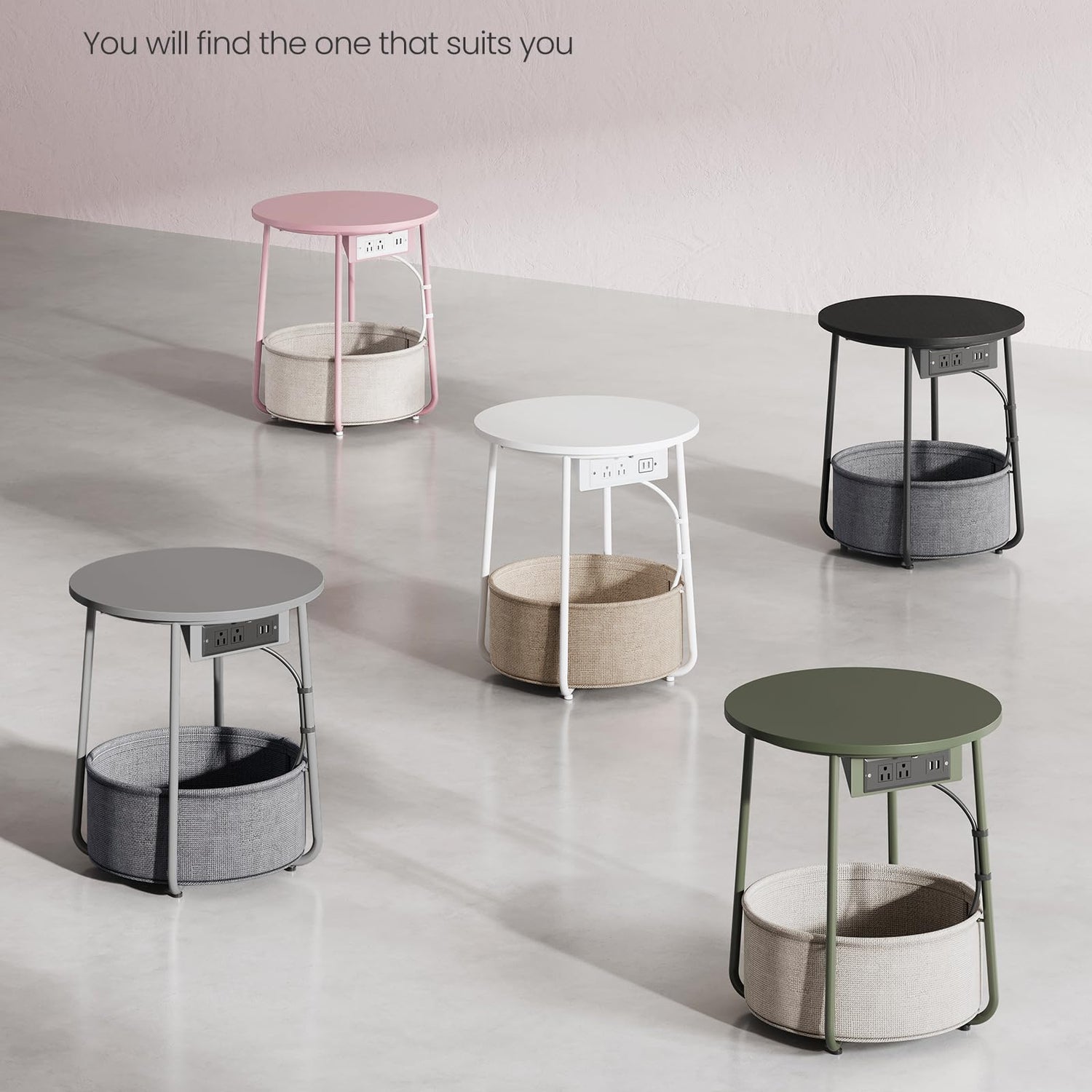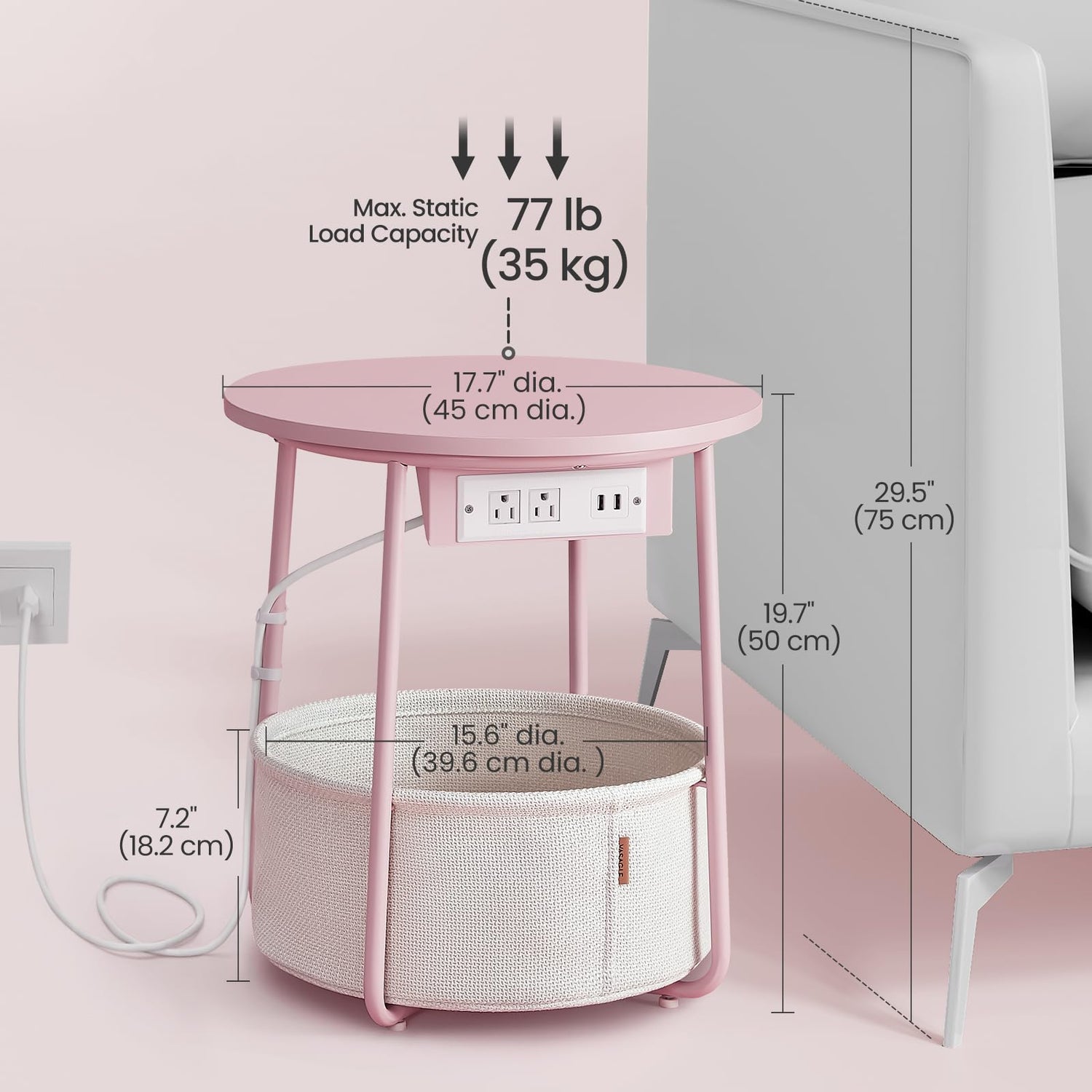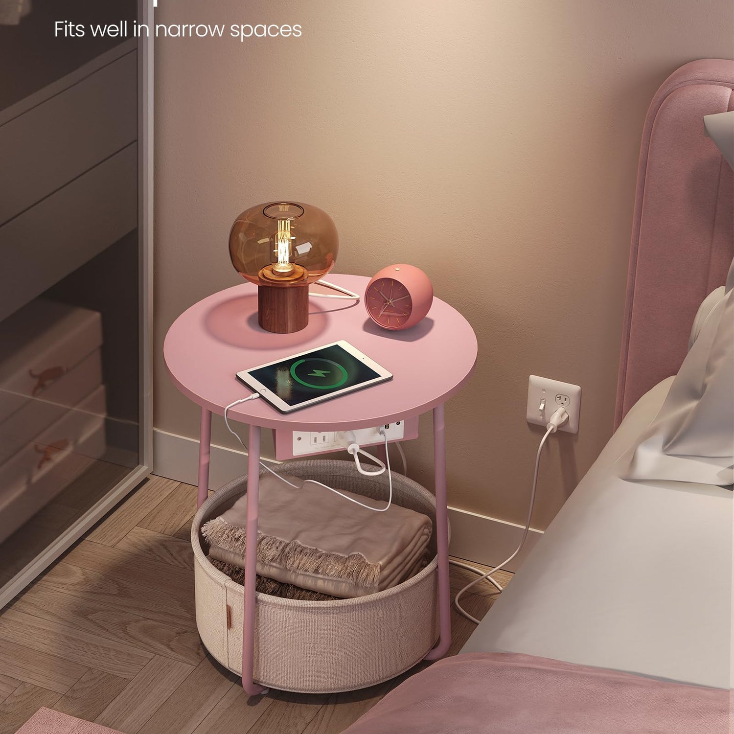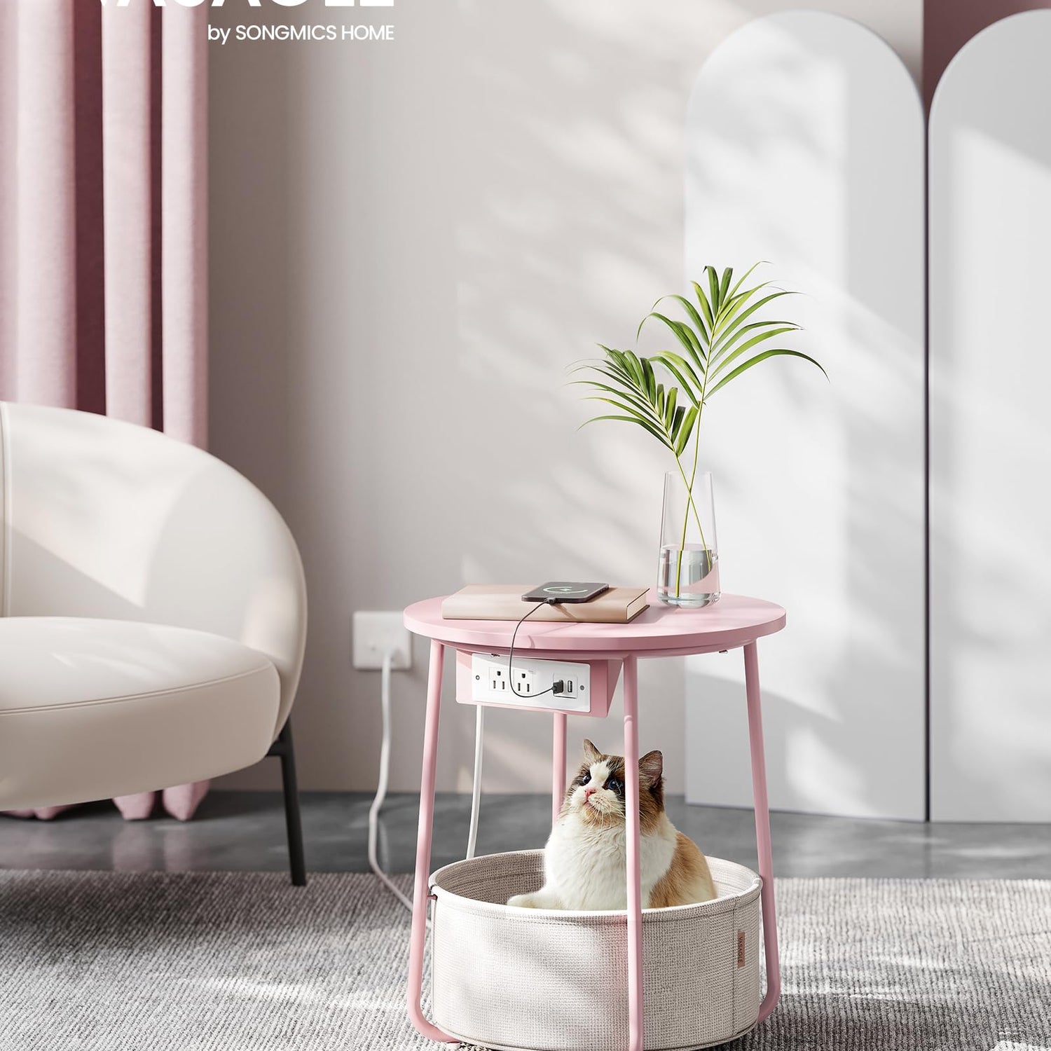 VASAGLE Side Table with Charging Station, Round End Table With Fabric Basket, Nightstand with Power Outlets USB Ports, for Living Room, Bedroom, Modern, Jelly Pink and Cream White ULET228R01