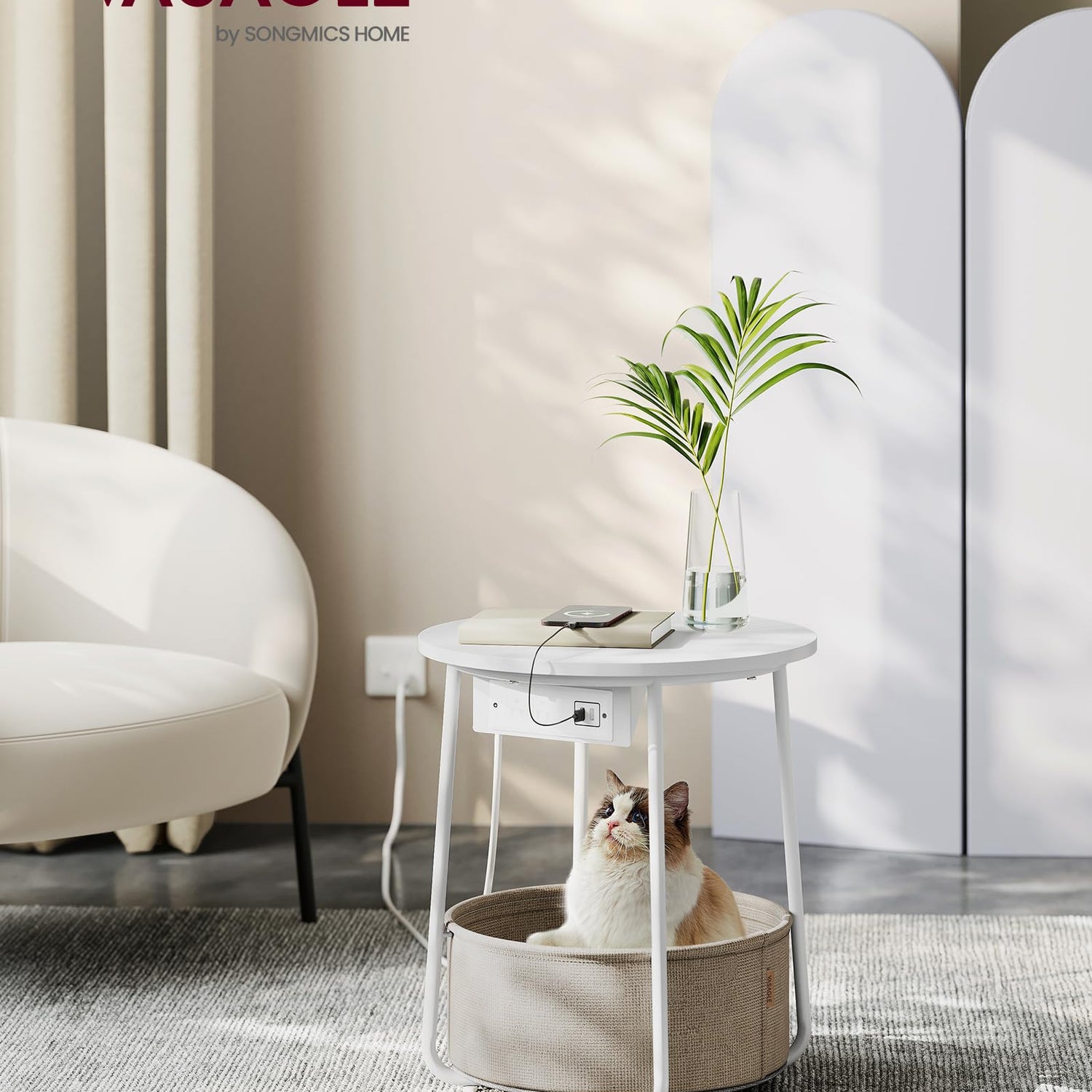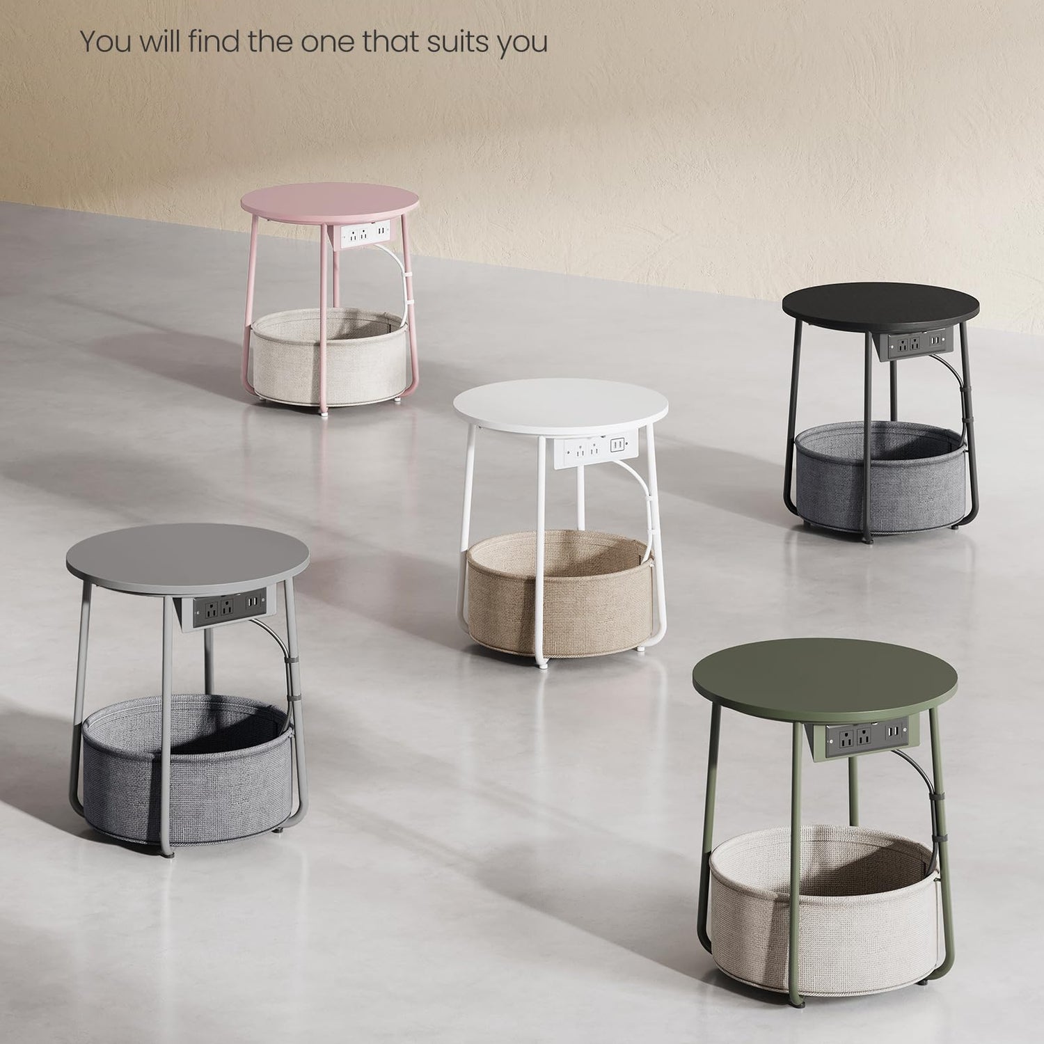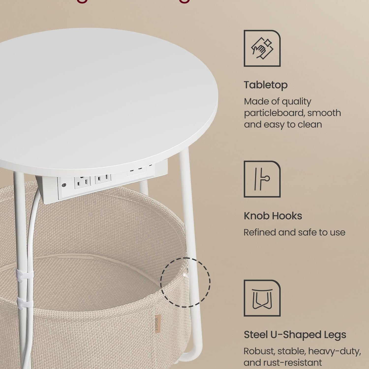 VASAGLE Side Table with Charging Station, Round End Table With Fabric Basket, Nightstand with Power Outlets USB Ports, for Living Room, Bedroom, Modern, Matte White and Camel Brown ULET228W01