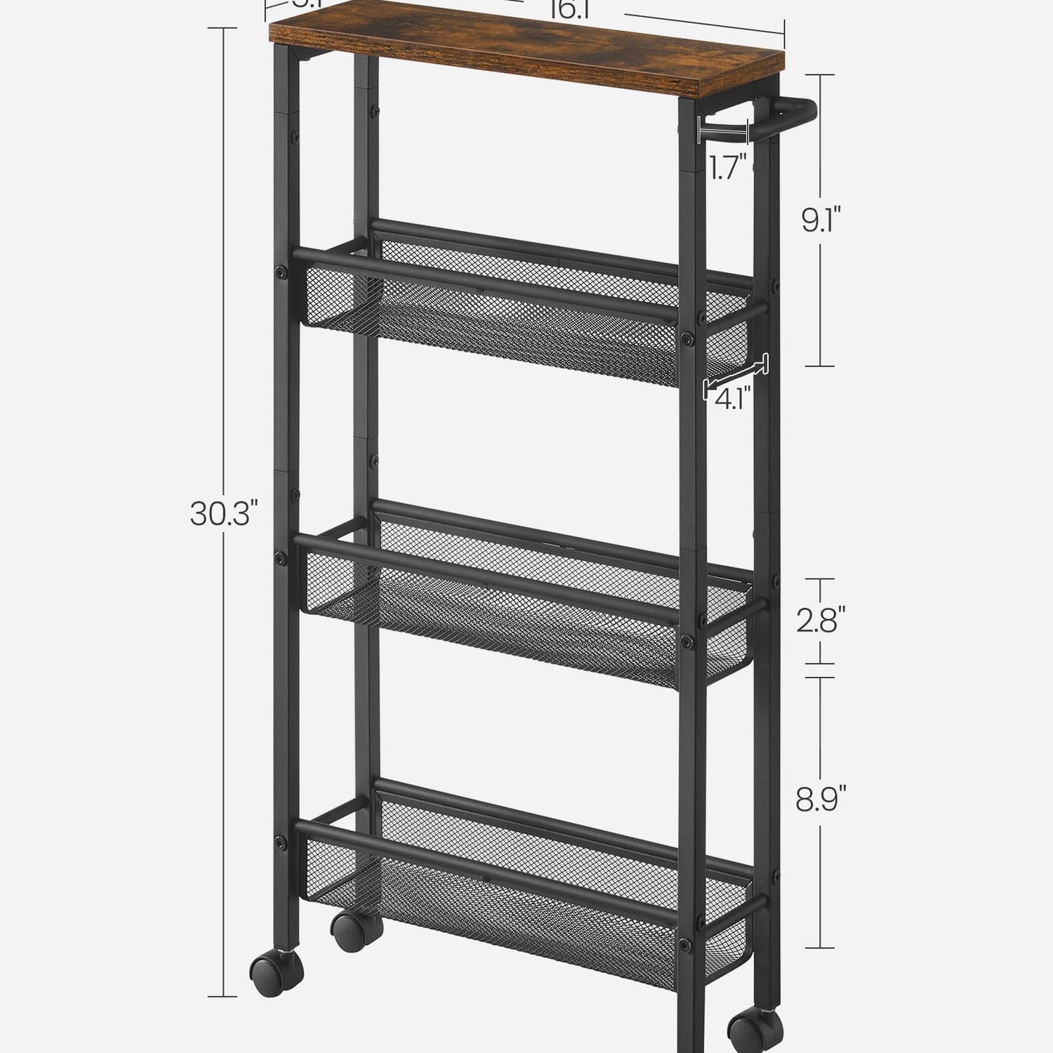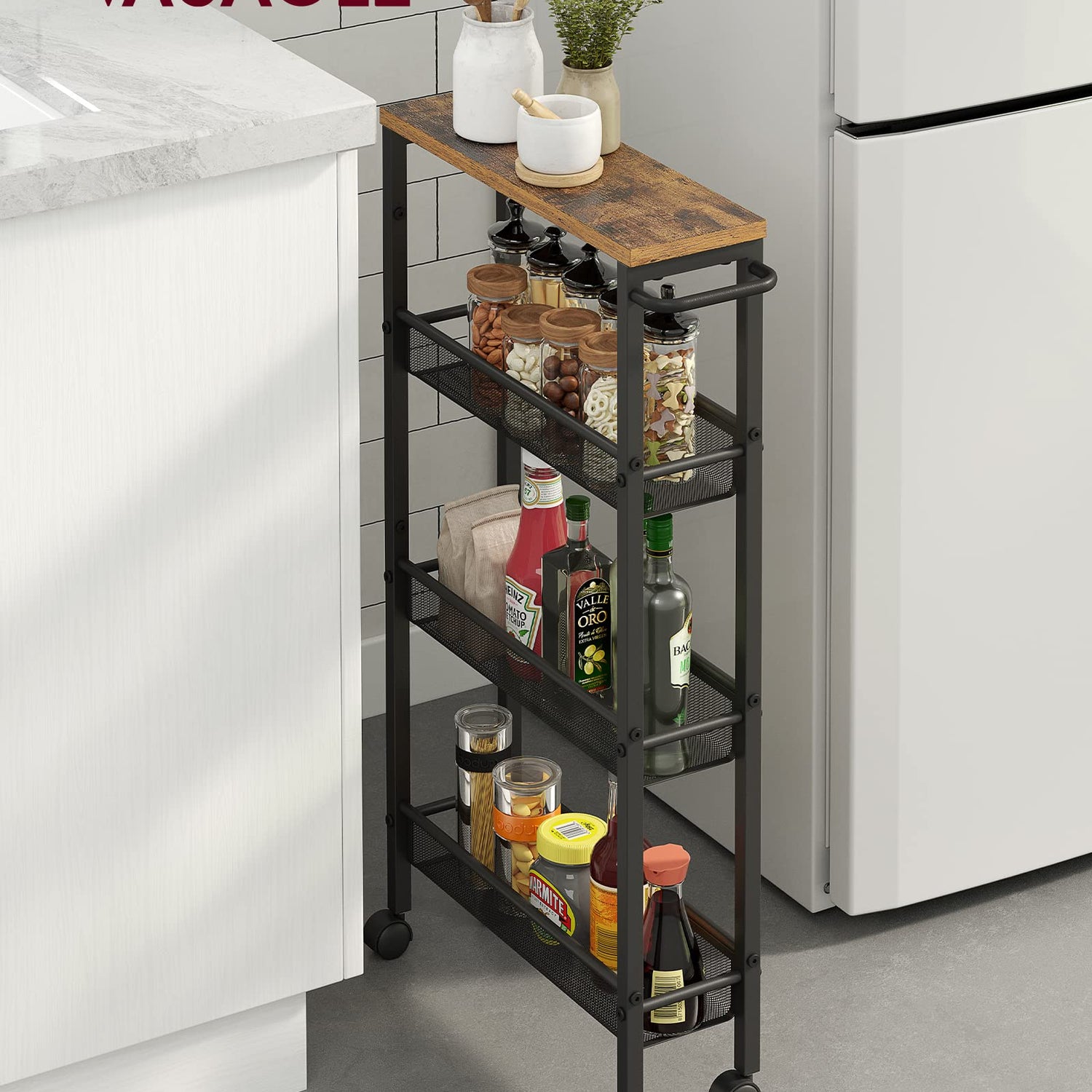VASAGLE Slim Rolling Cart, 4-Tier Storage Cart, Narrow Cart with Handle, 5.1 Inches Deep, Metal Frame, for Kitchen, Dining Room, Living Room, Home Office, Rustic Brown and Classic Black ULRC032B01V1
