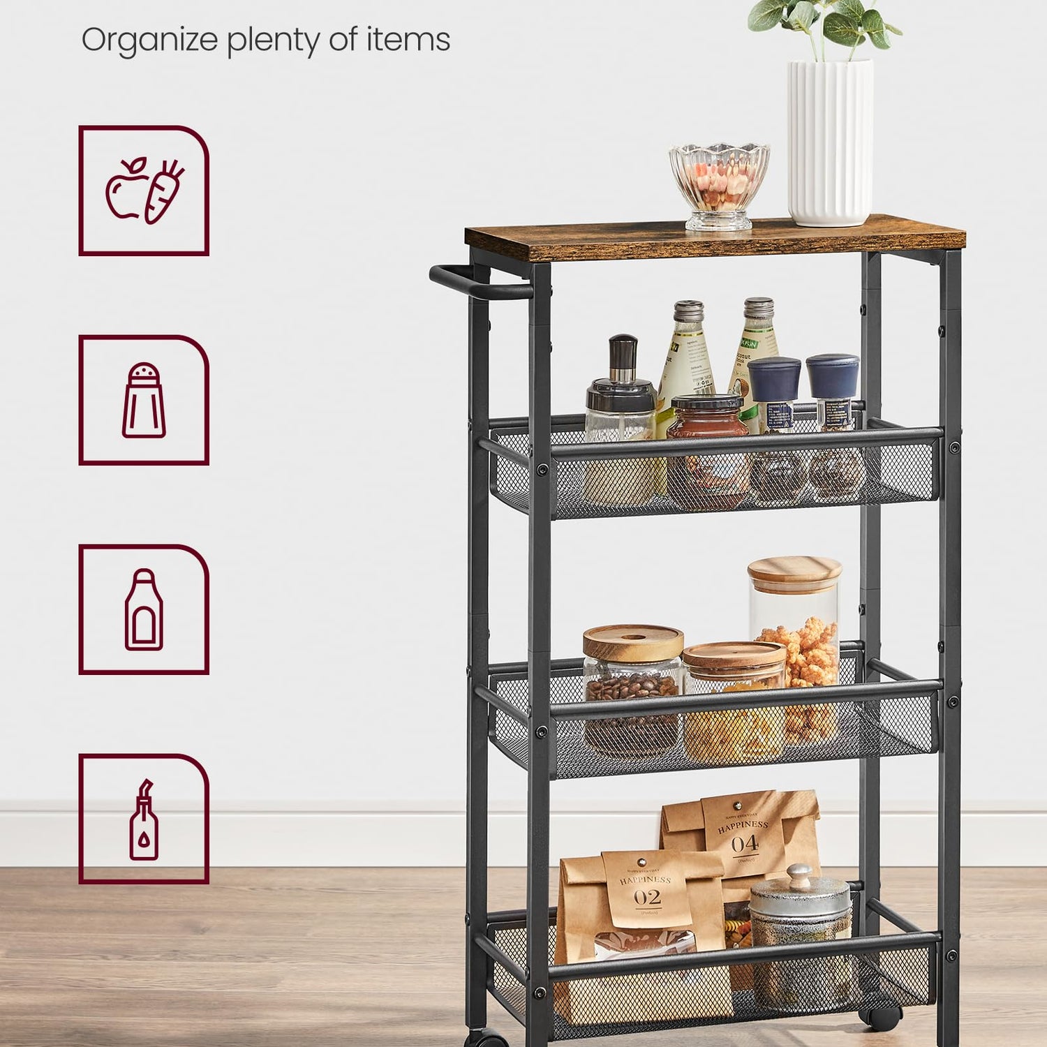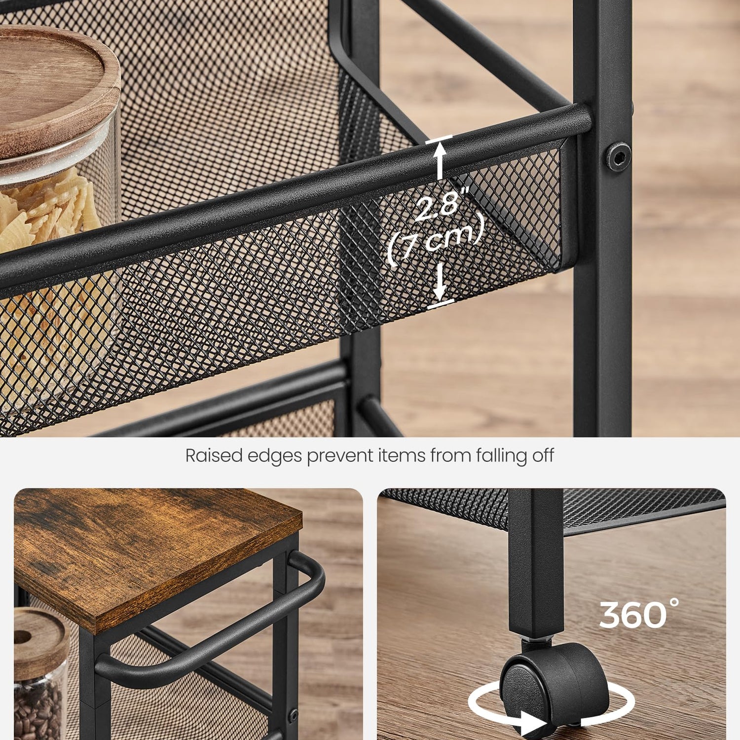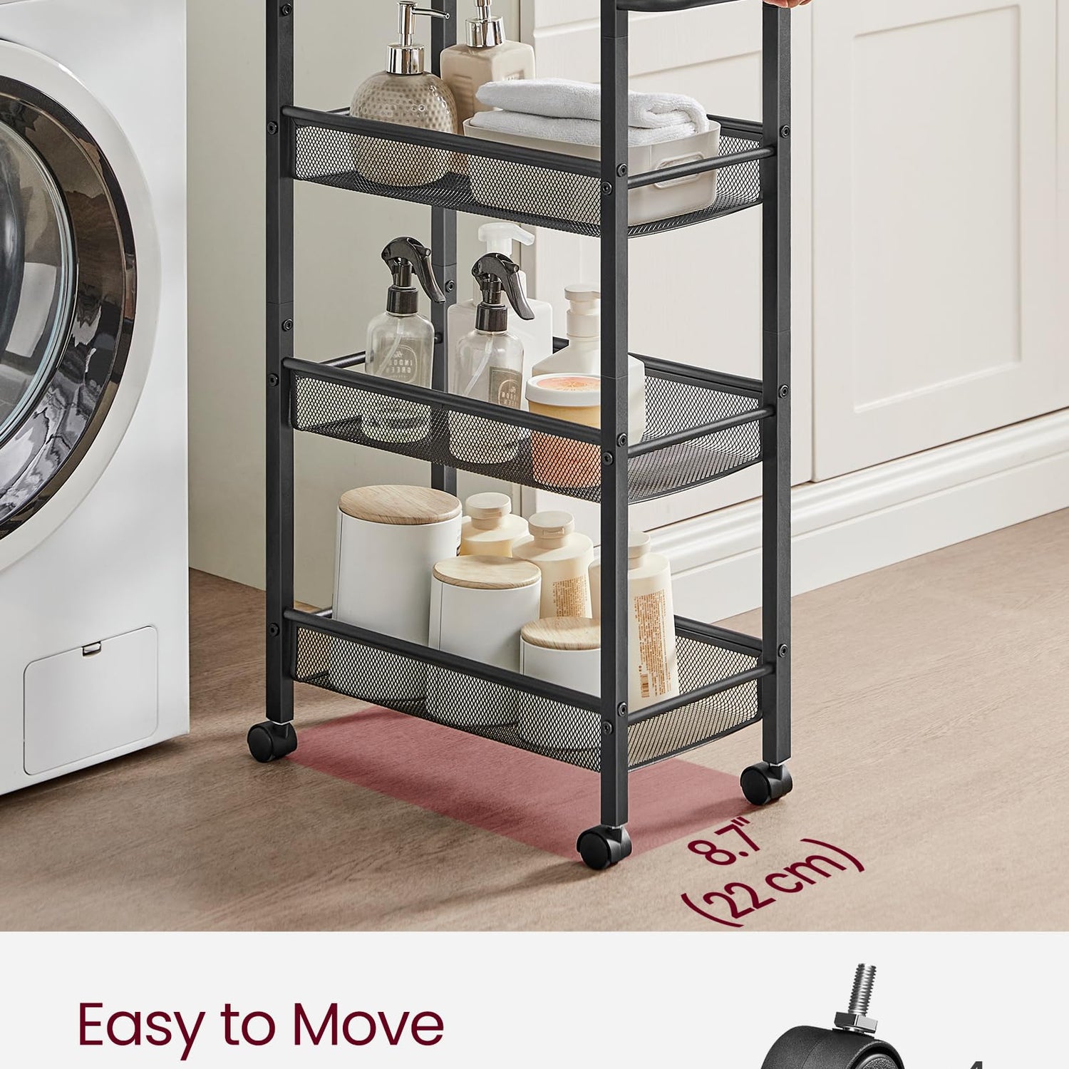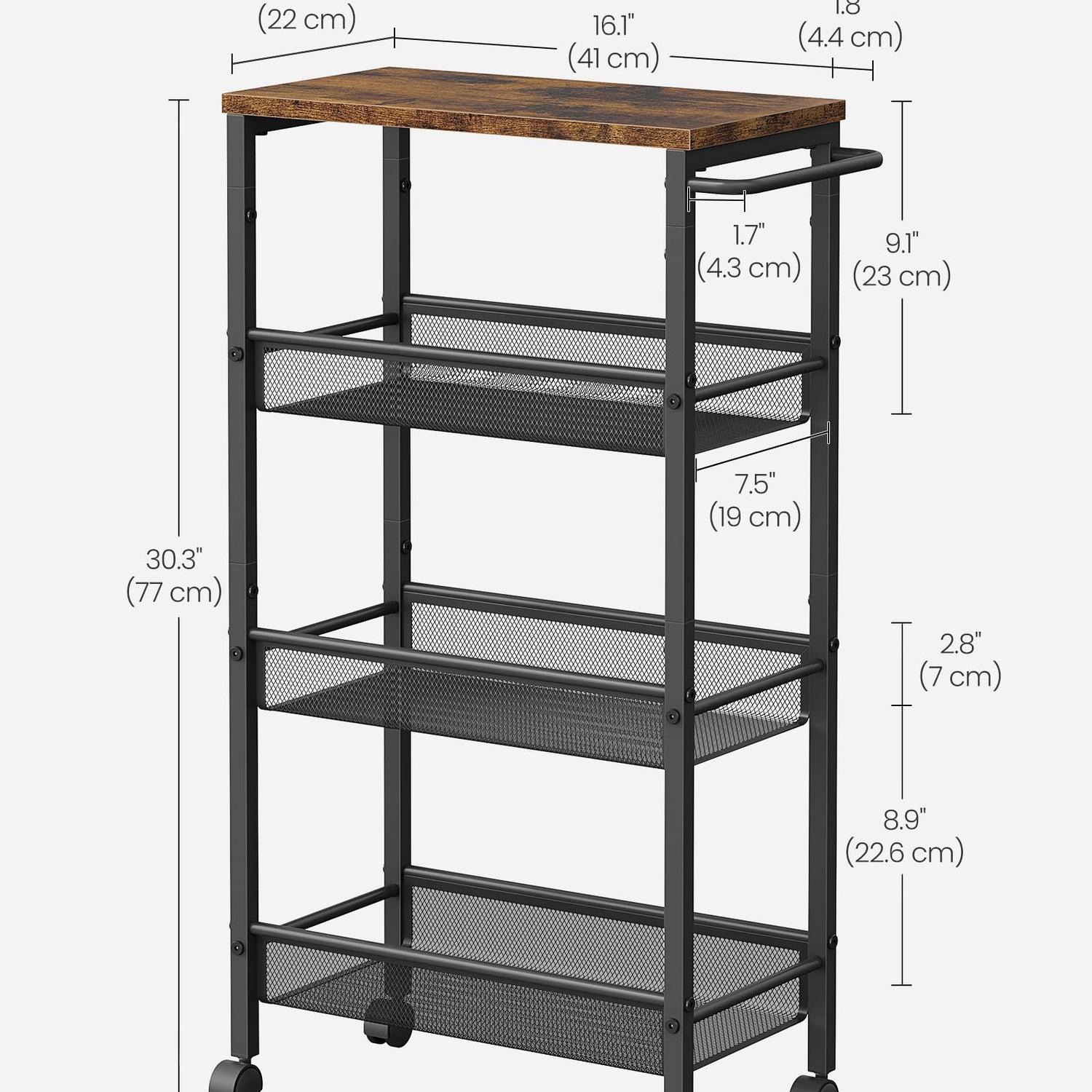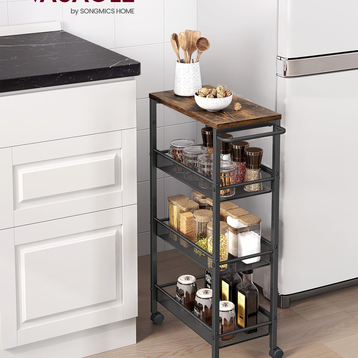 VASAGLE Slim Rolling Cart, 4-Tier Storage Cart, Narrow Cart with Handle, 8.7 Inches Deep, Metal Frame, for Kitchen, Dining Room, Living Room, Home Office, Rustic Brown and Classic Black ULRC033B01