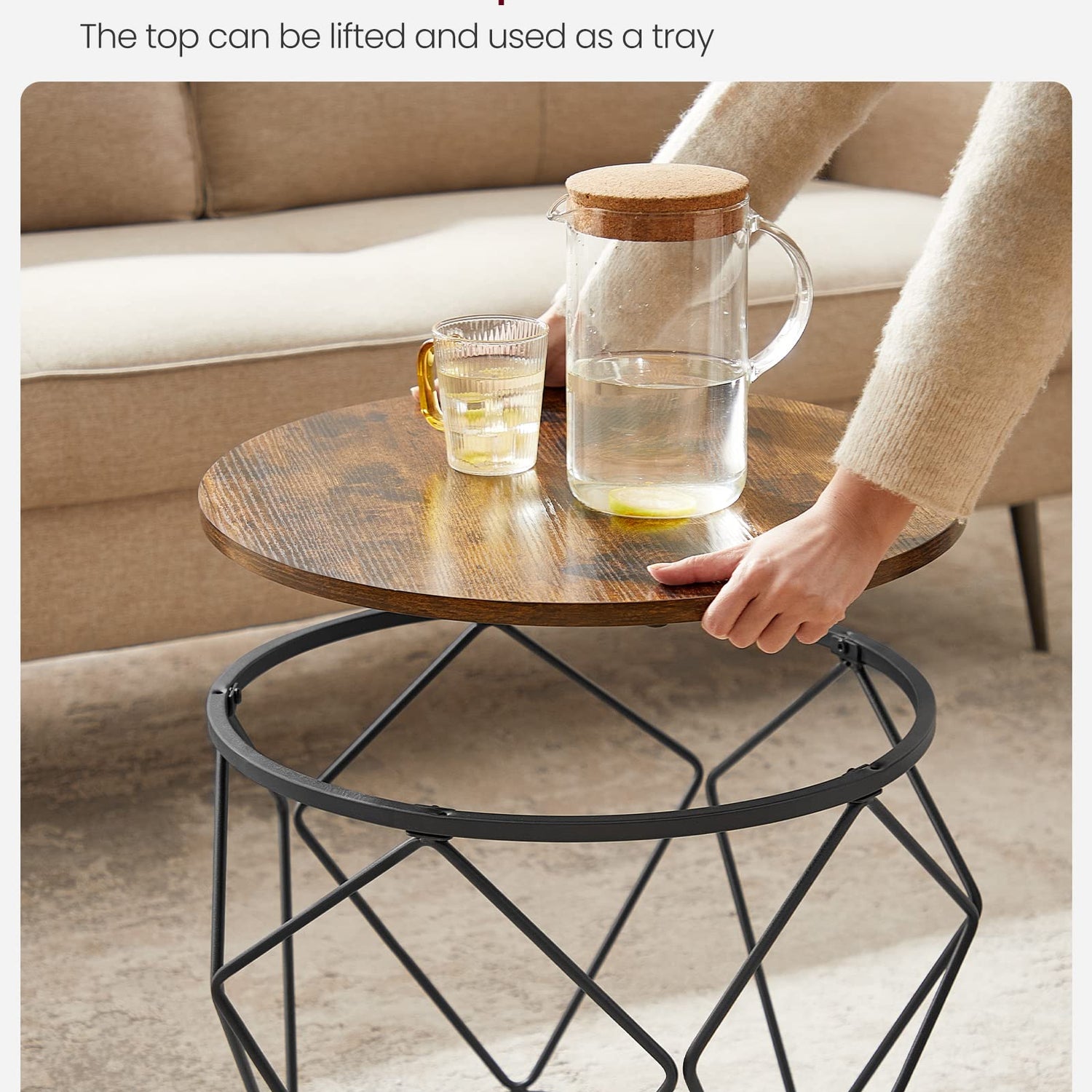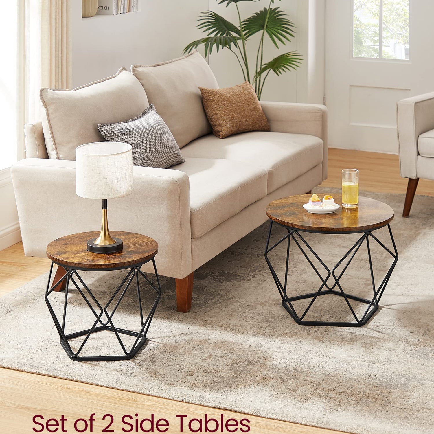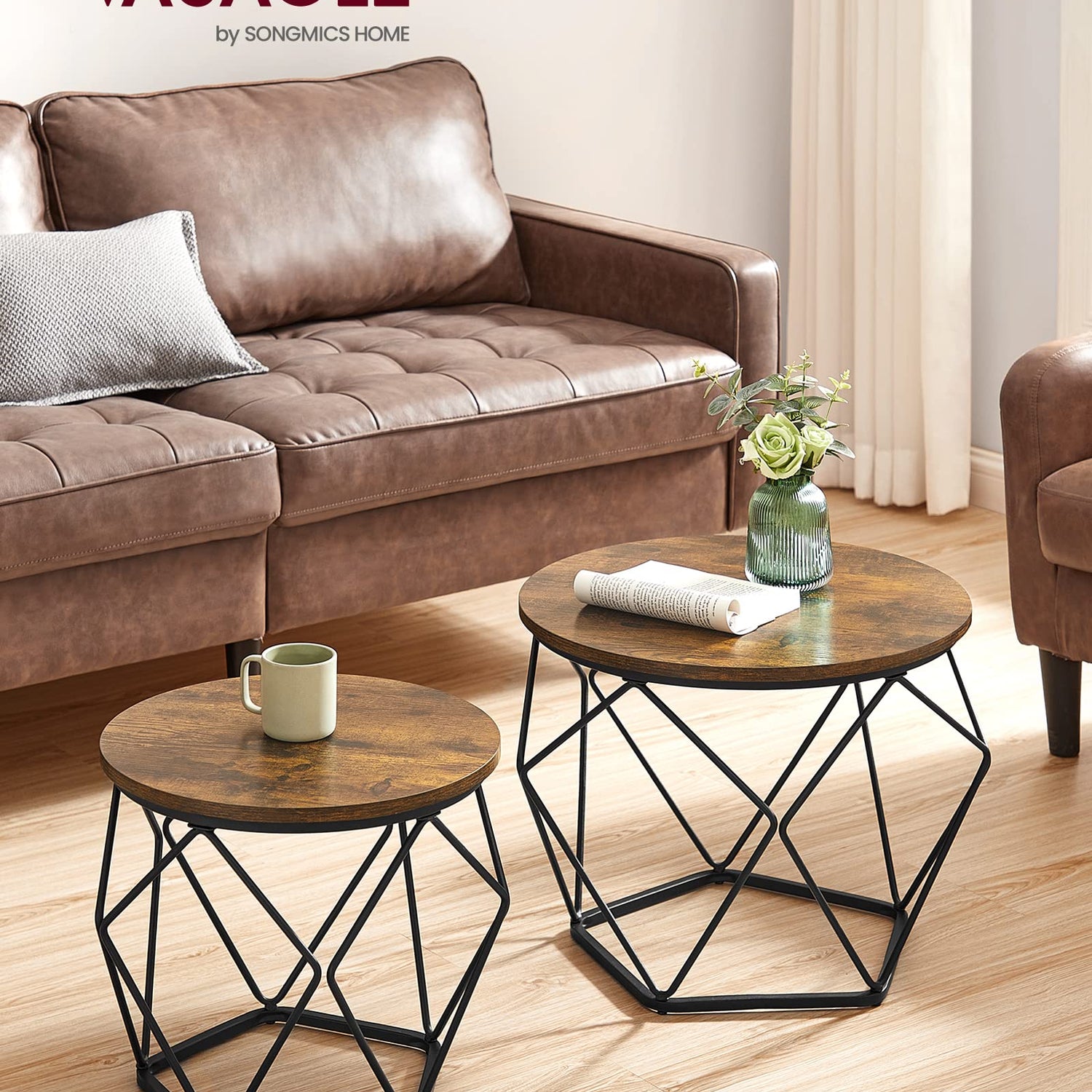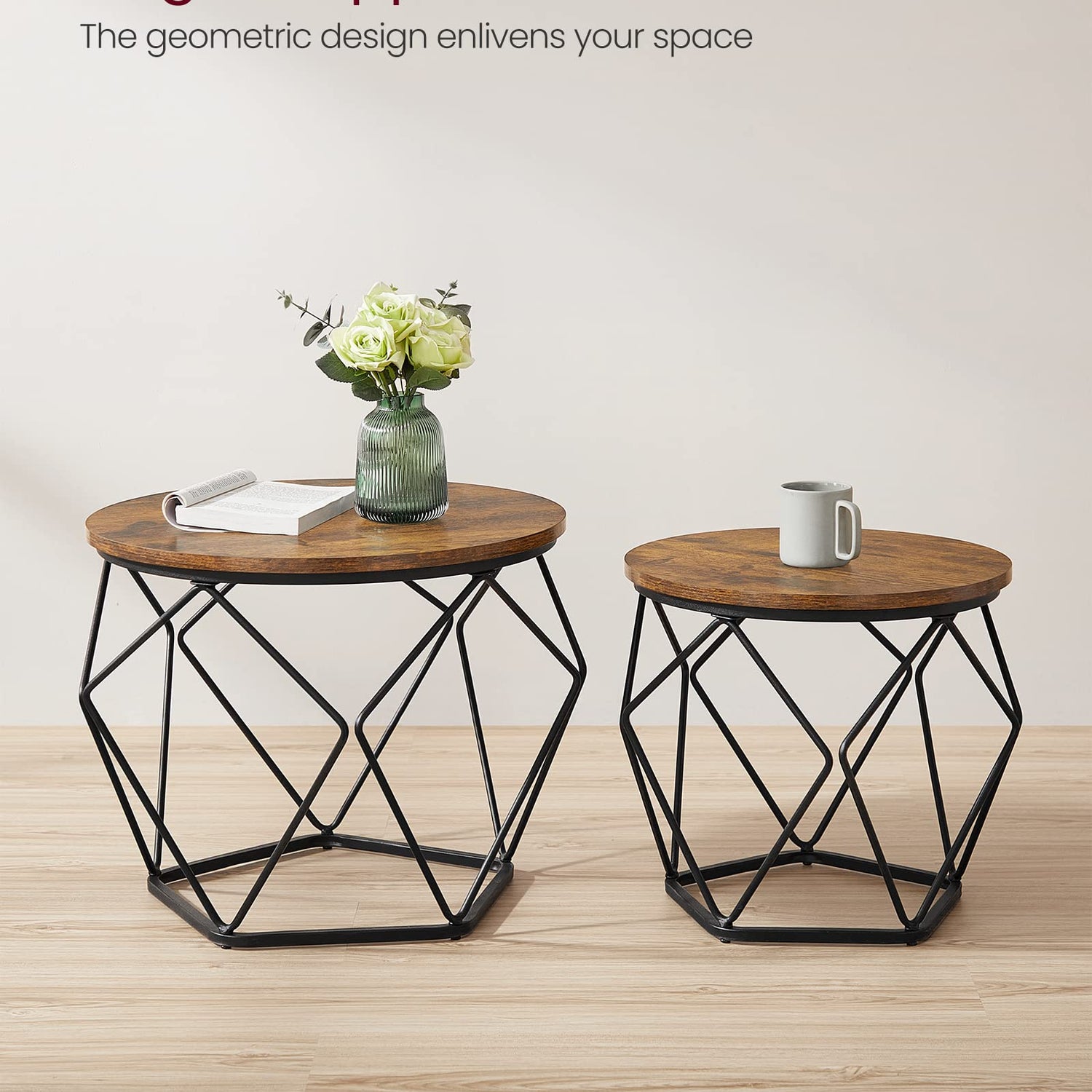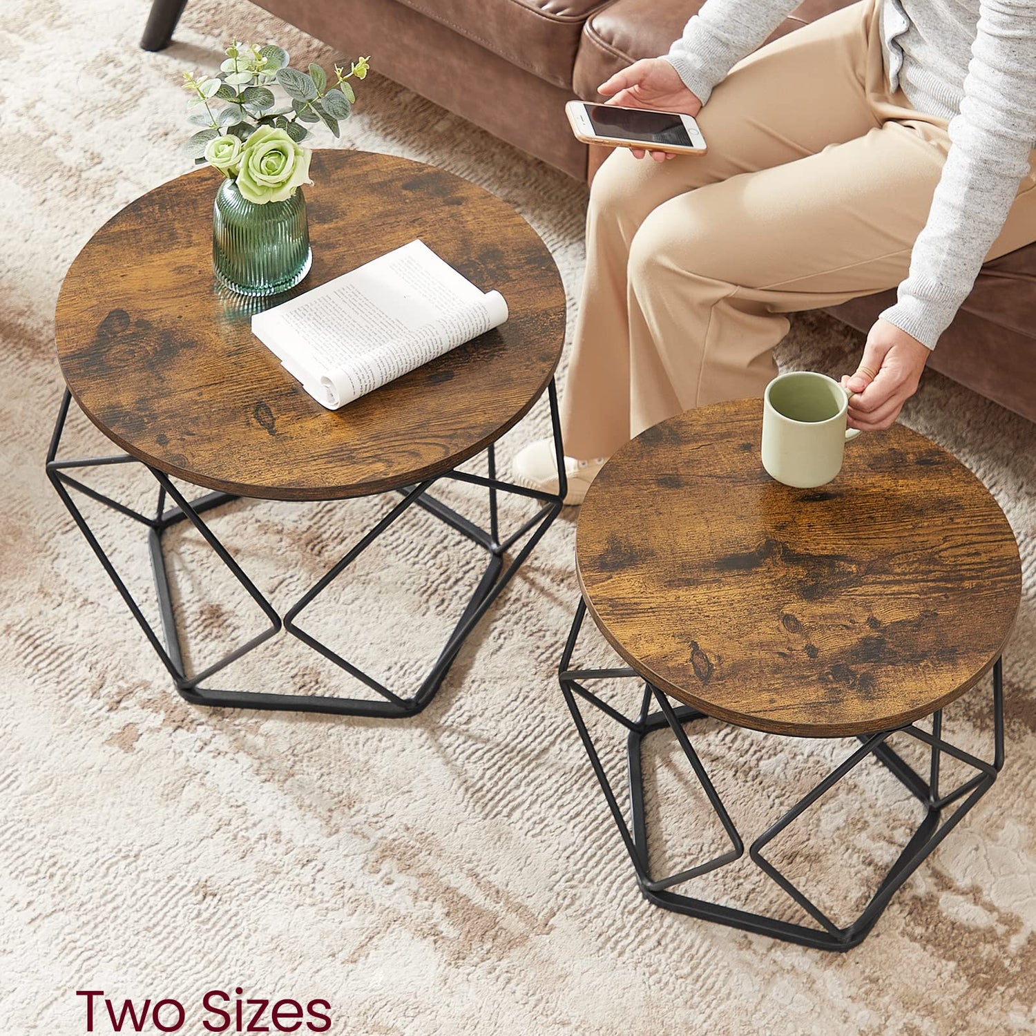 VASAGLE Small Coffee Table Set of 2, Round Coffee Table with Steel Frame, Side End Table for Living Room, Bedroom, Office, Rustic Brown and Ink Black