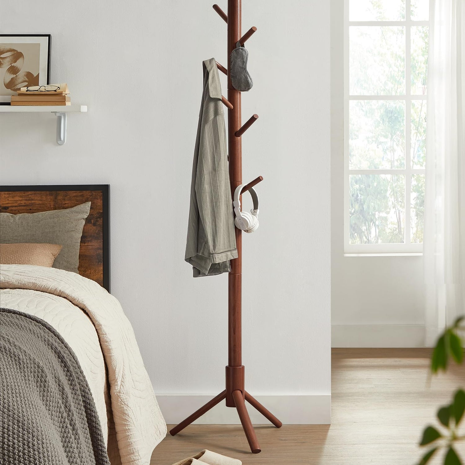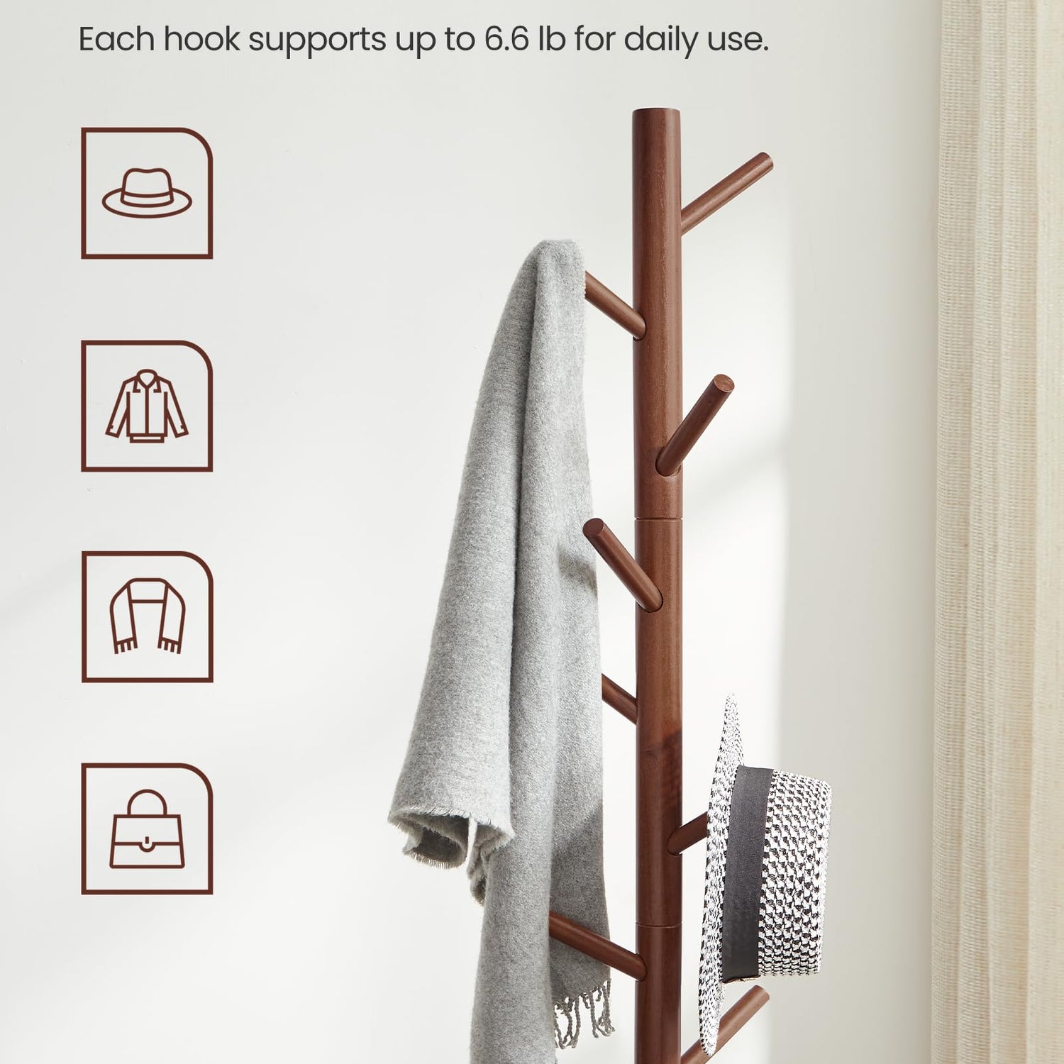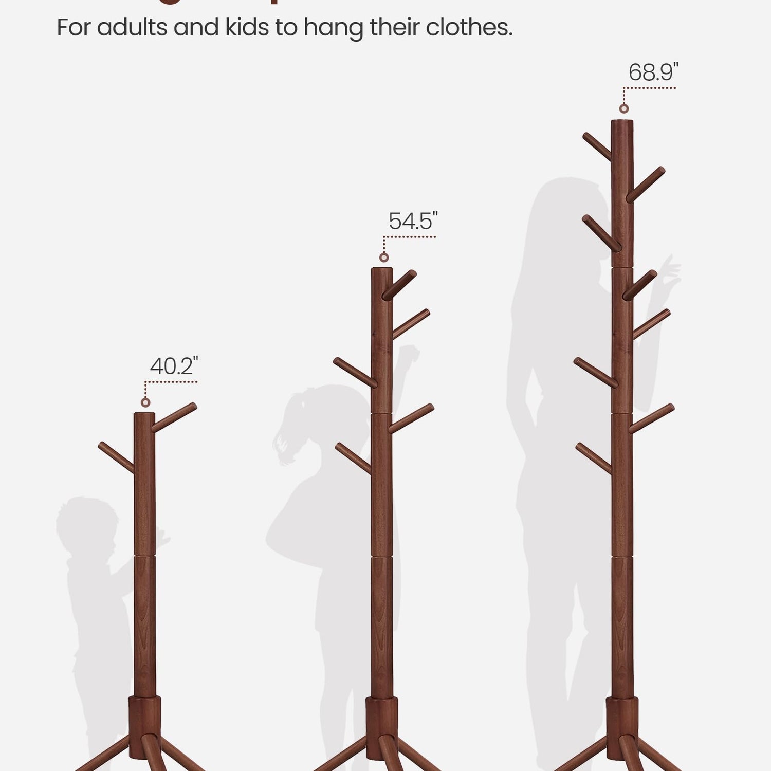 - [Durable & Refreshing] Made of 1.5” dia. solid wood, this coat rack is durable for years to come. And, the dark walnut color adds a refreshing touch to your home