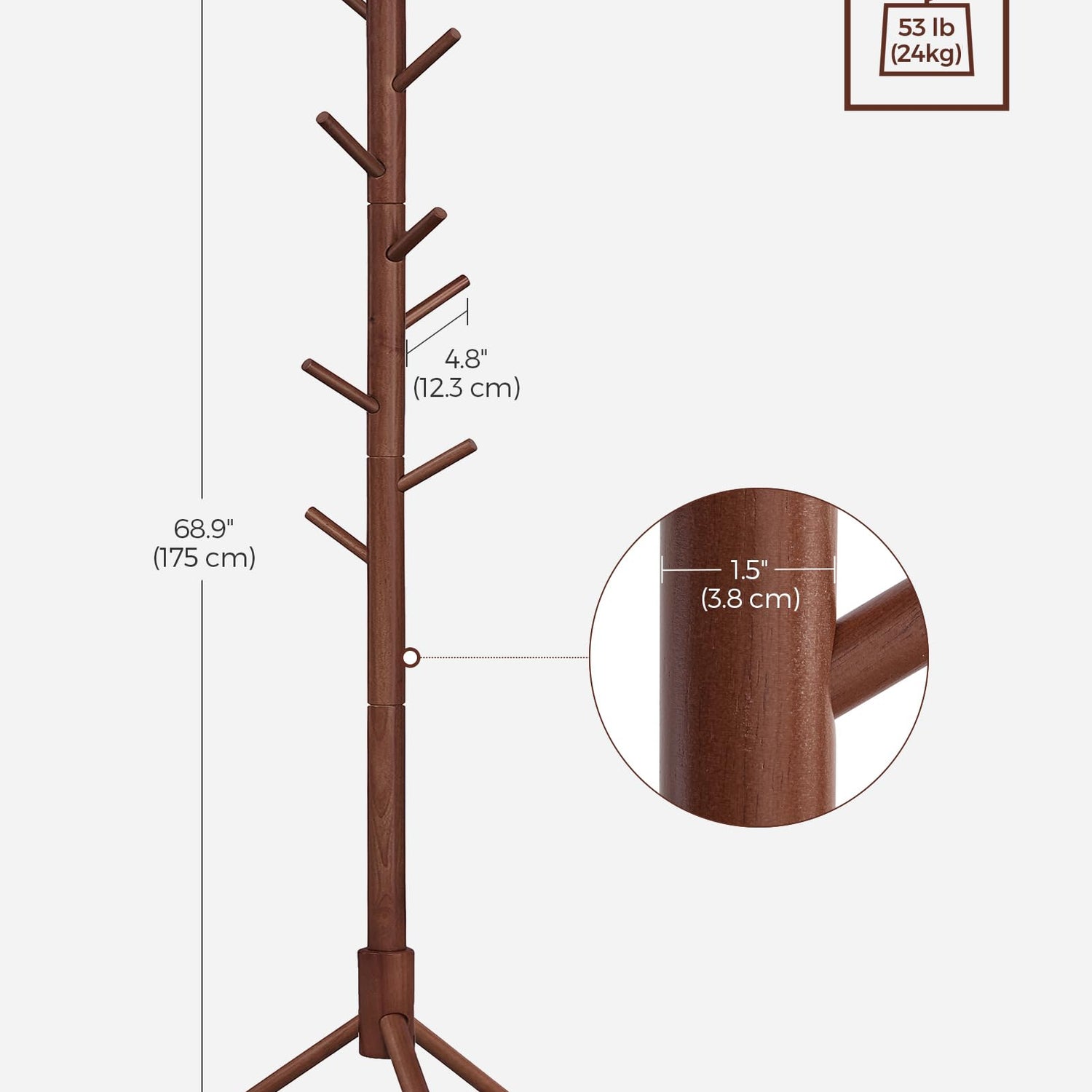 - [Stable Triangular Base] Stability is the top priority for a coat rack. The 18.5” wide triangular base provides a solid foundation for this coat rack, which can support up to 53 lb