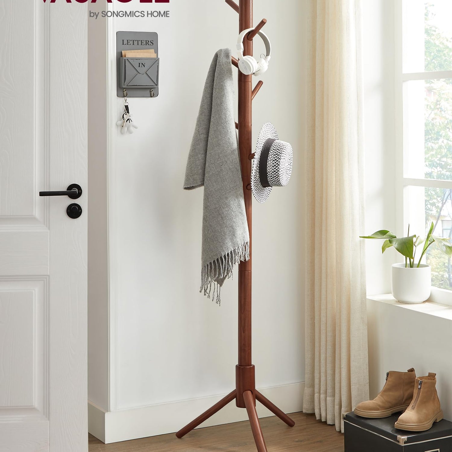 Details: Free Standing Coat Rack You can never have a home that is too organized. With this free standing coat rack by VASAGLE, you can stop tossing your belongings on the nearest couch, and start giving your home a clean, fresh look the moment you walk through the door. Here’s What You Can Expect: - A sturdy, durable, and reliable coat rack with a tri-legged base that won’t fall over every time you go to hang up a jacket. - 8 available hooks that give you plenty of space to hang your favorite, on-the-go items. - An assembly process that won’t make you want to throw things against the wall (hopefully). Specifications: - Color: Dark Walnut - Material: Rubberwood - Product Size: 18.5“L x 18.5“W x 68.9“H (47 x 47 x 175 cm) - Length of Each Hook: 4.8” (12.3 cm) - Product Weight: 4.4 lb (2 kg) - Max. Static Load Capacity Per Hook: 11 lb (5 kg) - Max. Static Load Capacity Total: 33 lb (15 kg) Package Contents: - 1 x Coat Stand - 1 x Instructions VASAGLE Notes: - Do not expose the product to direct sunlight for extended periods of time. - Do not touch the product with sharp items.