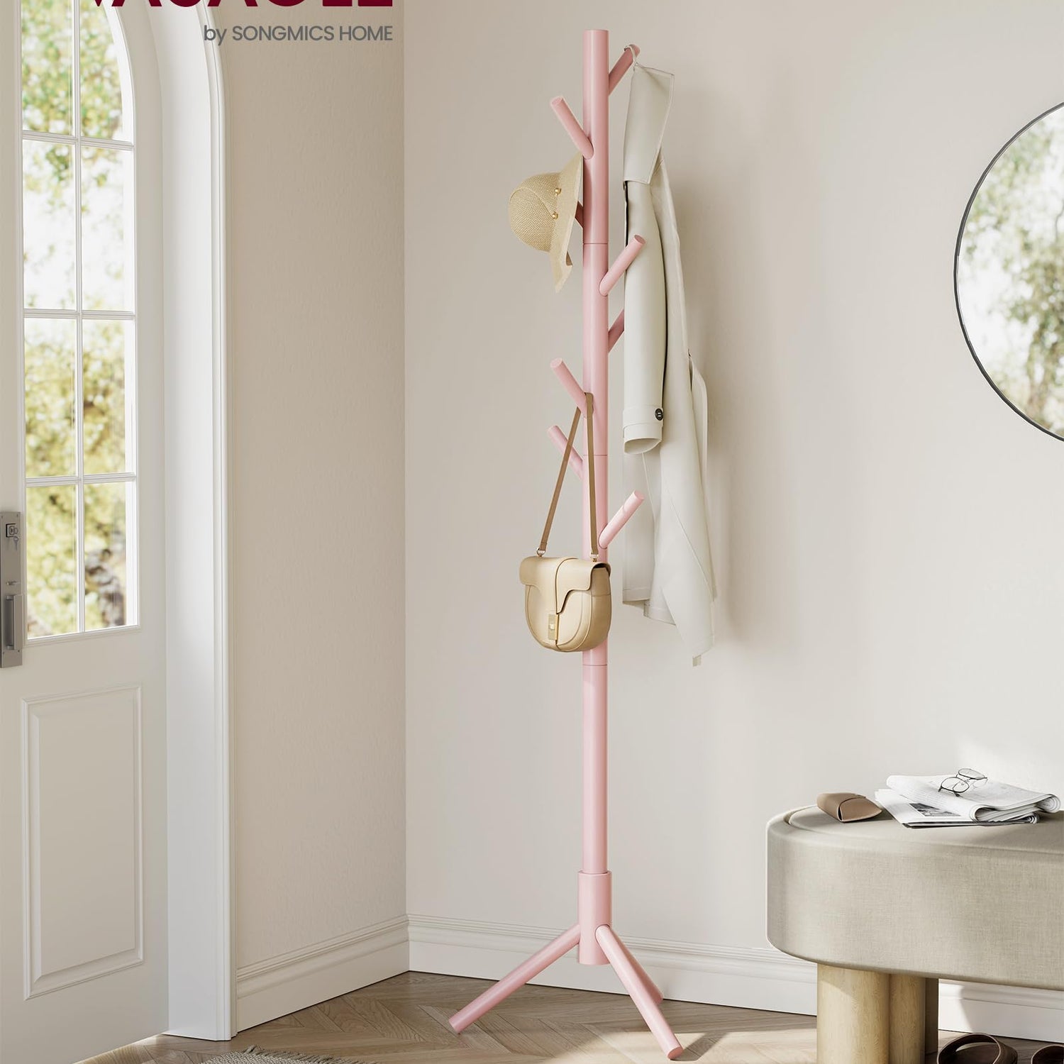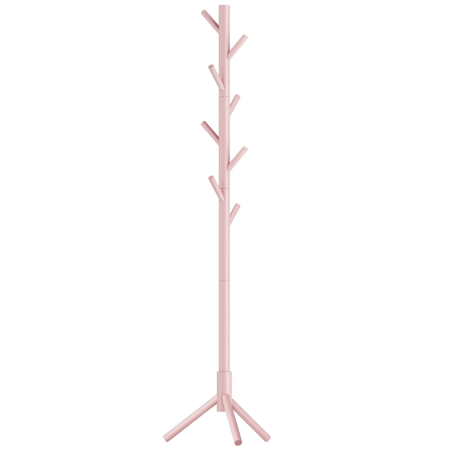 VASAGLE Solid Wood Coat Rack, Free Standing Coat Rack, Tree-Shaped Coat Rack with 8 Hooks, 3 Height Options, for Clothes, Hats, Bags, for Living Room, Bedroom, Home Office, Jelly Pink URCR004R01
