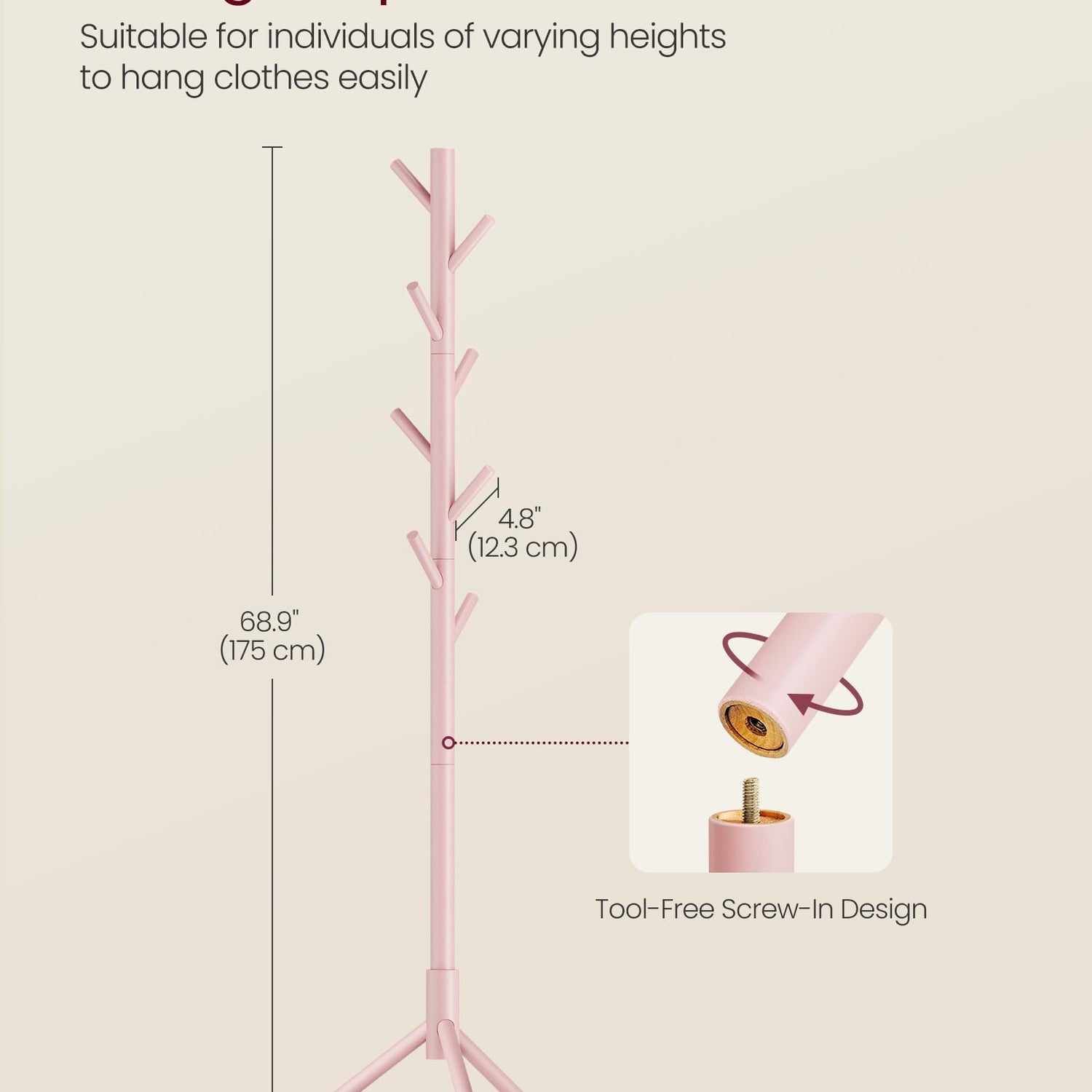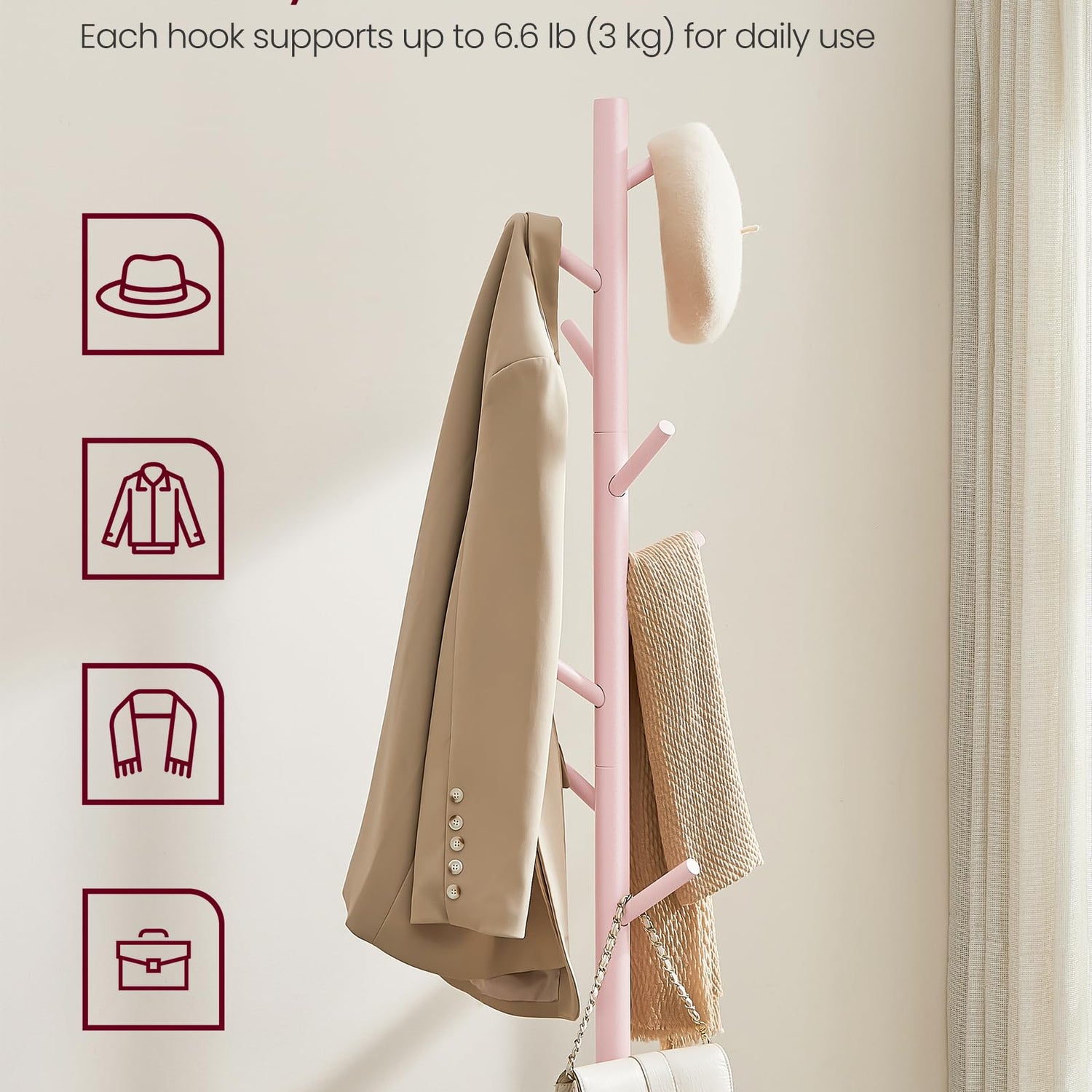 - [Durable & Refreshing] Made of 1.5" dia. solid wood, this coat rack is durable for years to come. And, the pink color adds a refreshing touch to your home