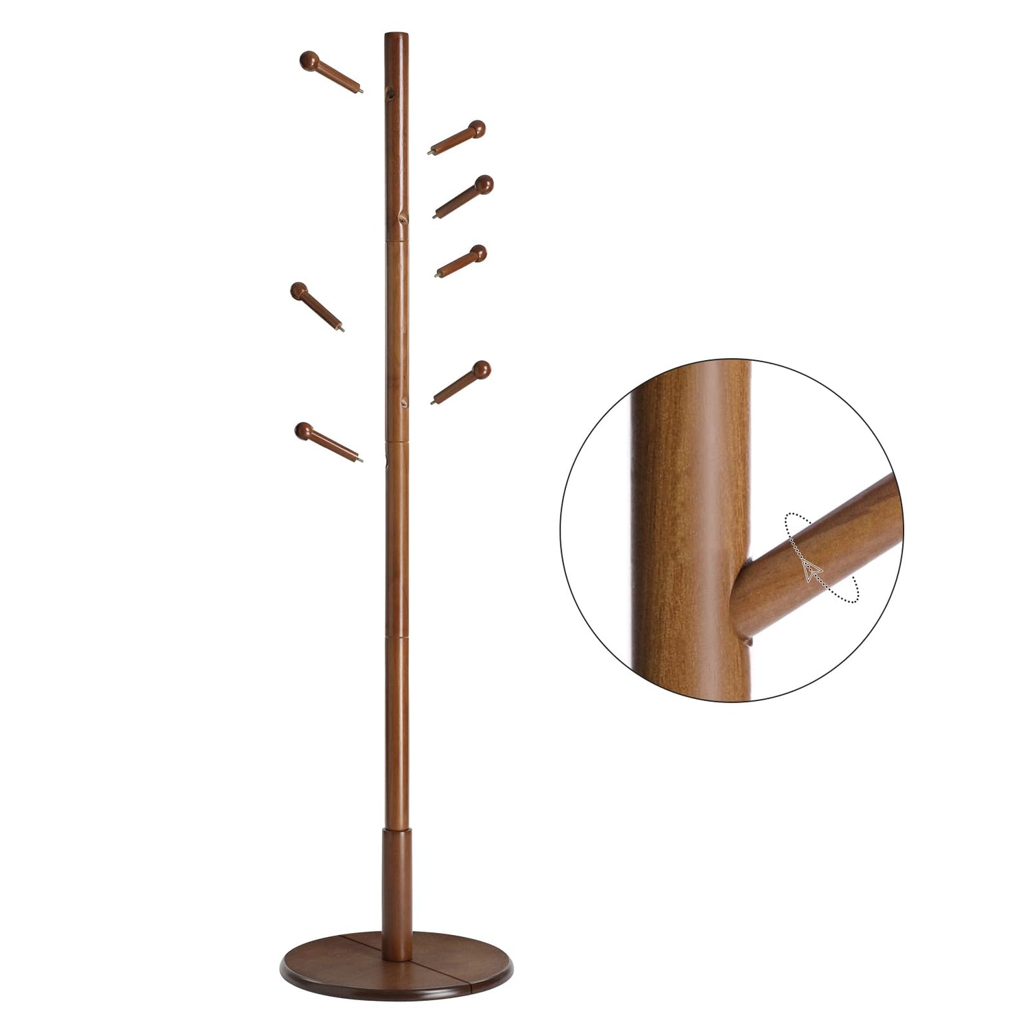 - [Solid Like a Tree] Crafted of solid rubberwood, this coat rack is robust like a tree with its large 15” dia. round base, 1.6” dia thick trunk for strong support, and rounded branches hold up to 11 lb each, offering a stable home for your clothes and hats