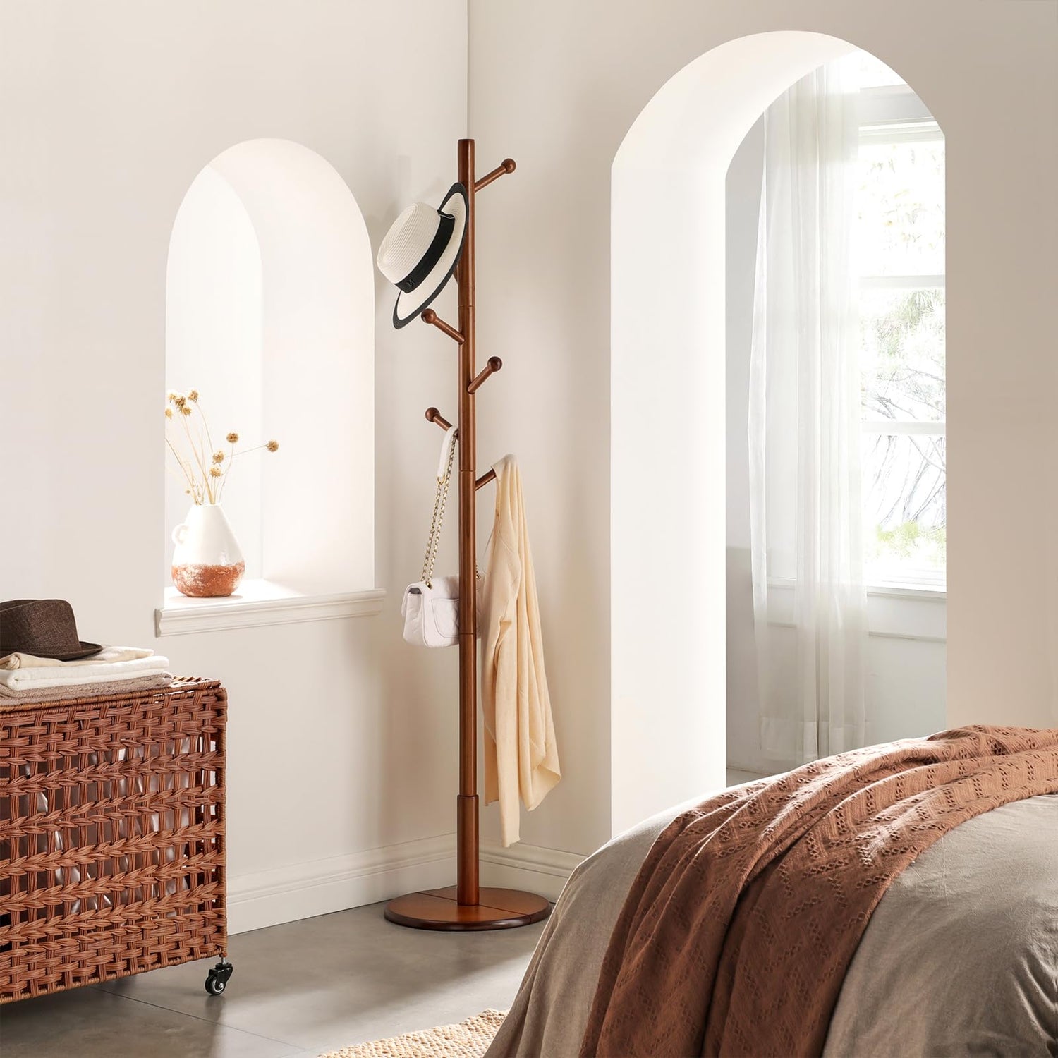 VASAGLE Solid Wood Coat Rack, Wood Hall Tree, Coat Rack Stand with 7 Rounded Hooks, Stable Round Base, 3 Height Options, for Living Room, Bedroom, Home Office, Dark Walnut URCR07WN