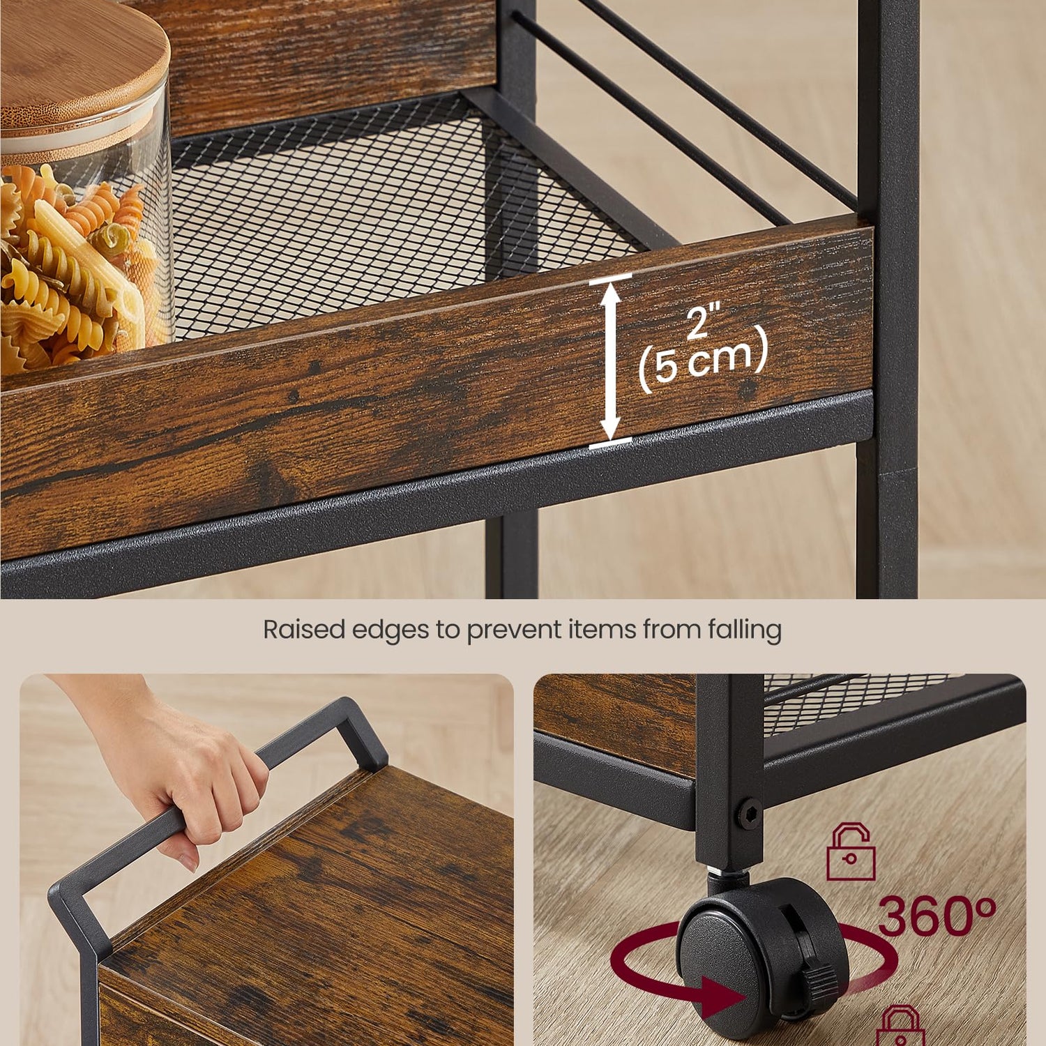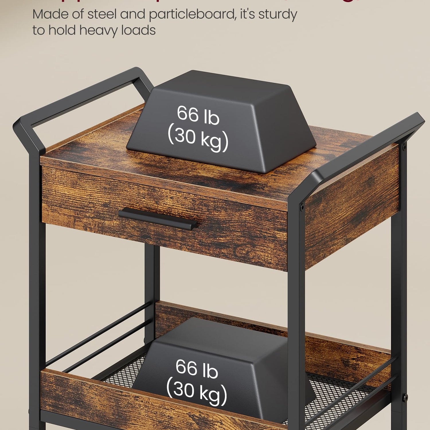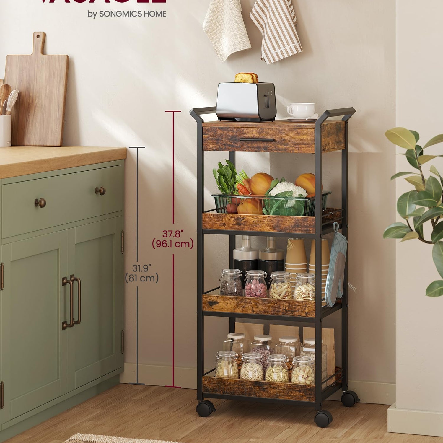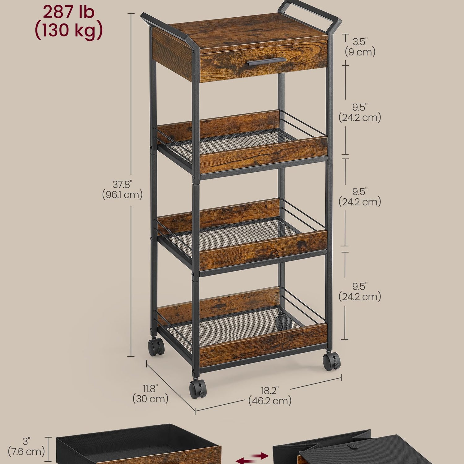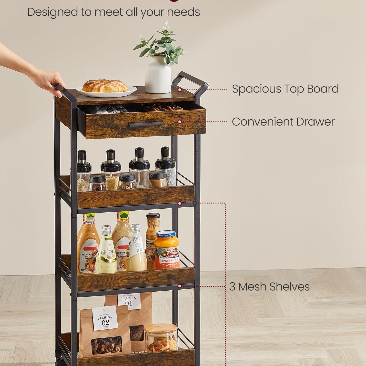 VASAGLE Storage Cart, 4-Tier Rolling Utility Cart with Table Top, Handles, 4 Lockable Casters, Top Drawer, Mesh Shelves, for Kitchen, Bathroom, Bedroom, Rustic Brown and Ink Black ULRC049K01
