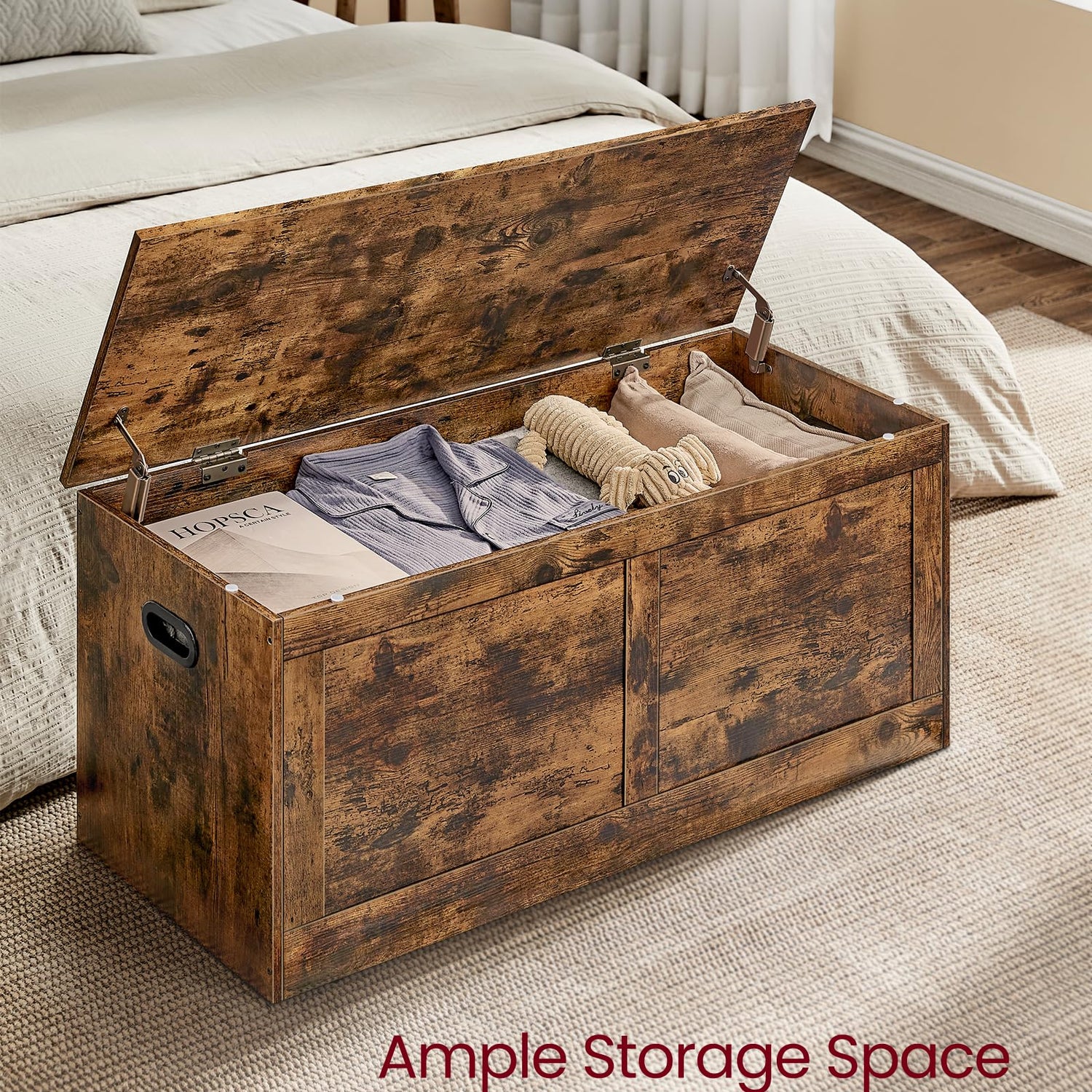 - 【CONVENIENT SIDE HANDLES】Our storage chest is designed with wide, ergonomically designed cut-out handles, making it easy to relocate whenever you need extra storage or seating
