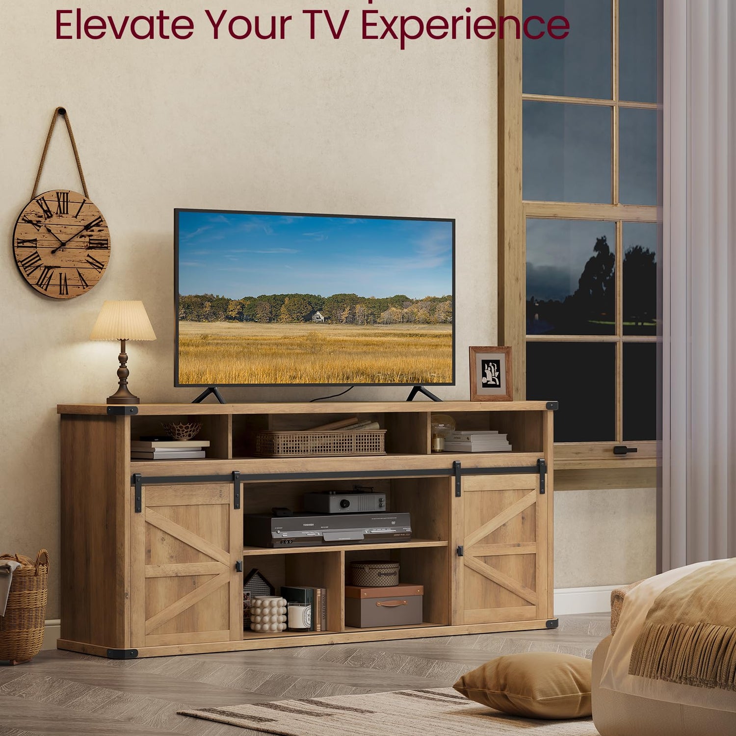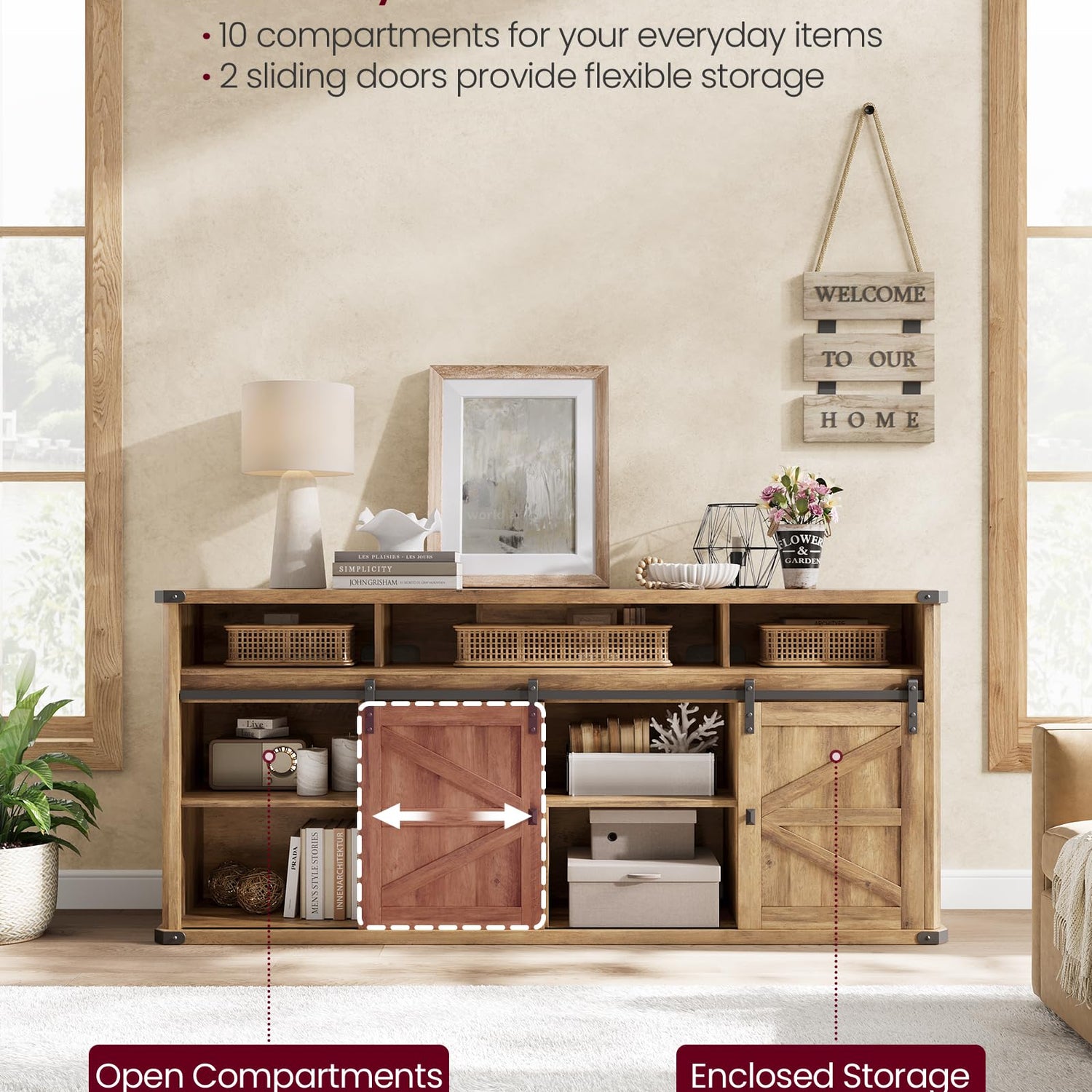 - [Ample and Flexible Storage] With 10 compartments, this TV cabinet neatly stores your DVDs, game consoles, and more. The barn doors slide freely to hide odds and ends for a clean look. 2 side shelves are adjustable for items of different sizes