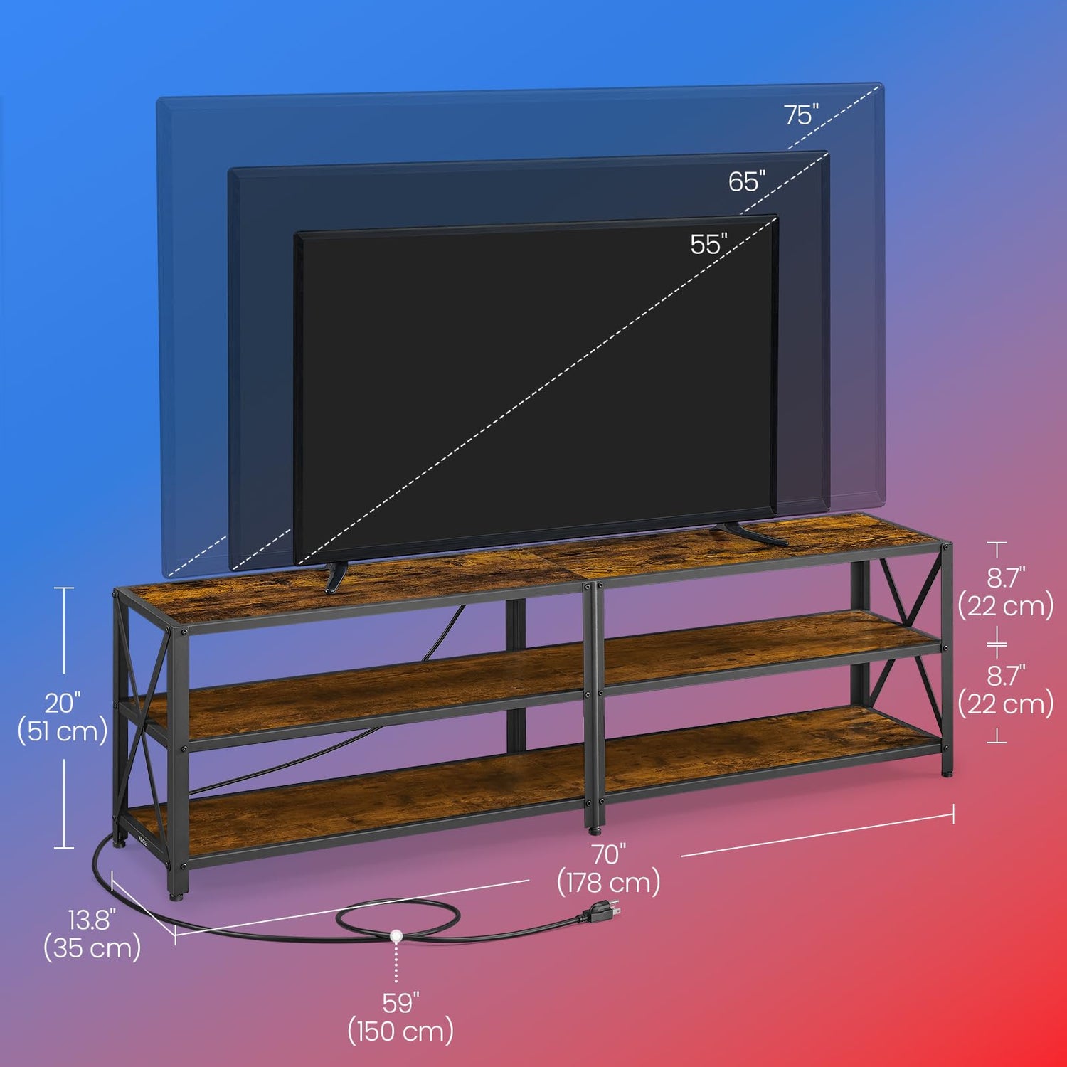 - 【BUILT-IN CHARGING STATION】This TV stand features a power strip with 3 AC outlets, 2 USB ports, and a 4.9 ft cable, allowing you to conveniently power your TV, gaming console, speakers, and other electronic devices all in one place