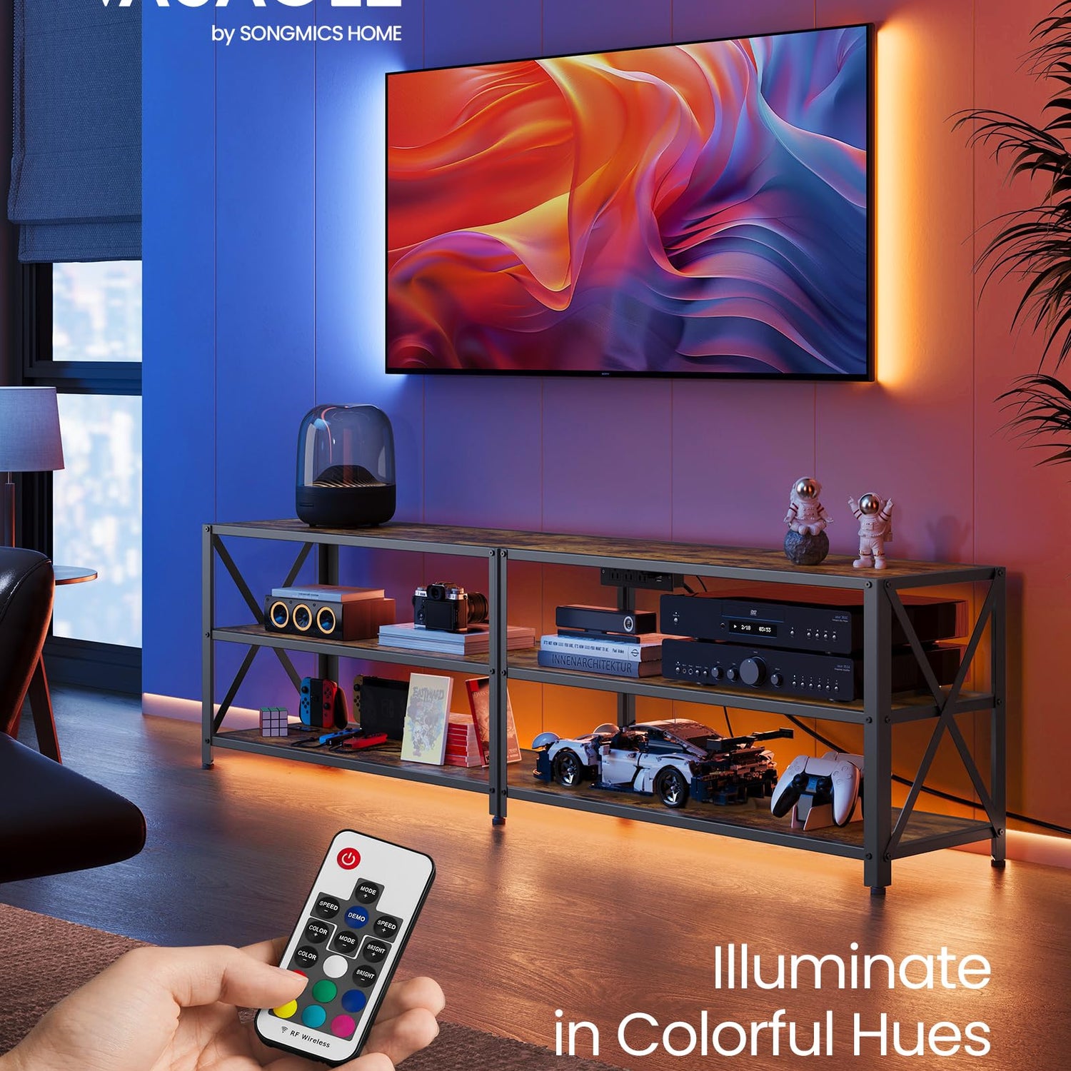 VASAGLE TV Stand with Power Outlets and LED Lights, for TVs up to 75 Inches, Entertainment Center with Open Storage Shelves, TV Console Table for Living Room, Rustic Brown and Ink Black ULTV119K01