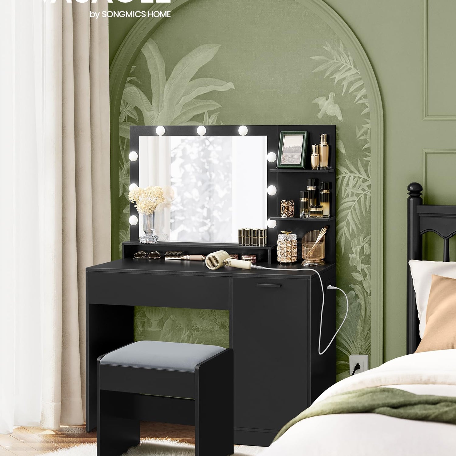 VASAGLE Vanity Desk with Mirror and Lights, 43.3-Inch Wide Makeup Vanity with Upholstered Vanity Stool, Power Outlets, Dimmable LED Lights, Storage Drawer, for Bedroom, Ink Black URDT628B01