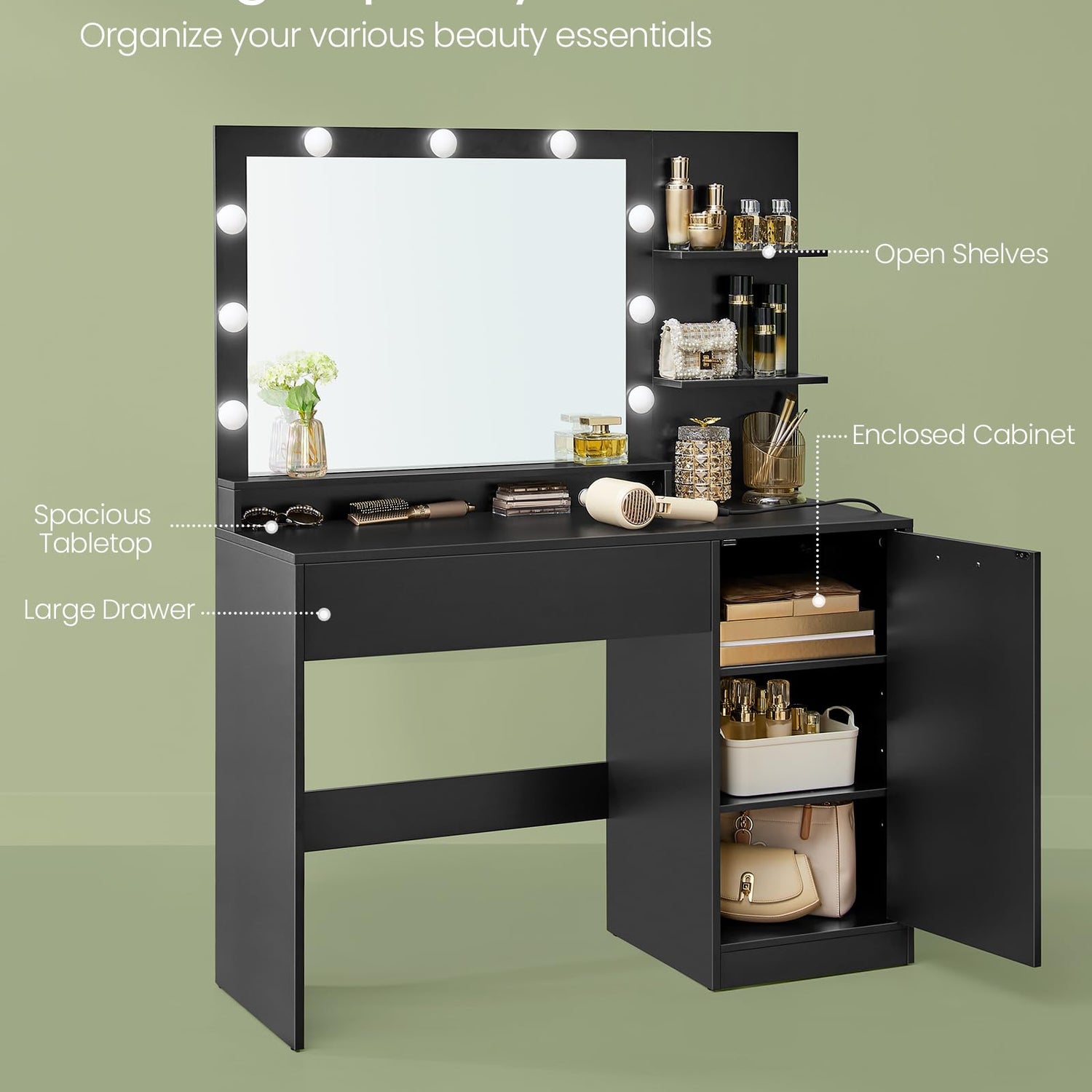 - 【STORAGE GALORE】The vanity desk boasts a spacious tabletop, 3 open shelves, a roomy drawer, and an enclosed cabinet, providing ample storage to keep all your beauty necessities organized and within easy reach