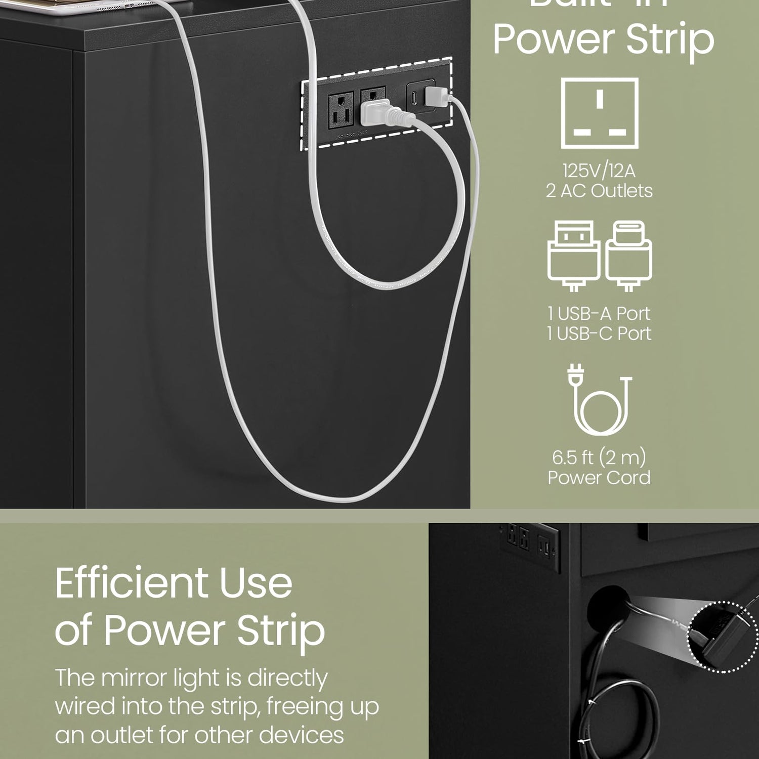 - 【CONVENIENT POWER HUB】The built-in power strip with 2 outlets, 1 USB-A, and 1 USB-C port conveniently powers your hair tools and charges your phone. The mirror's light is cleverly wired into the strip, freeing up an outlet for other appliances
