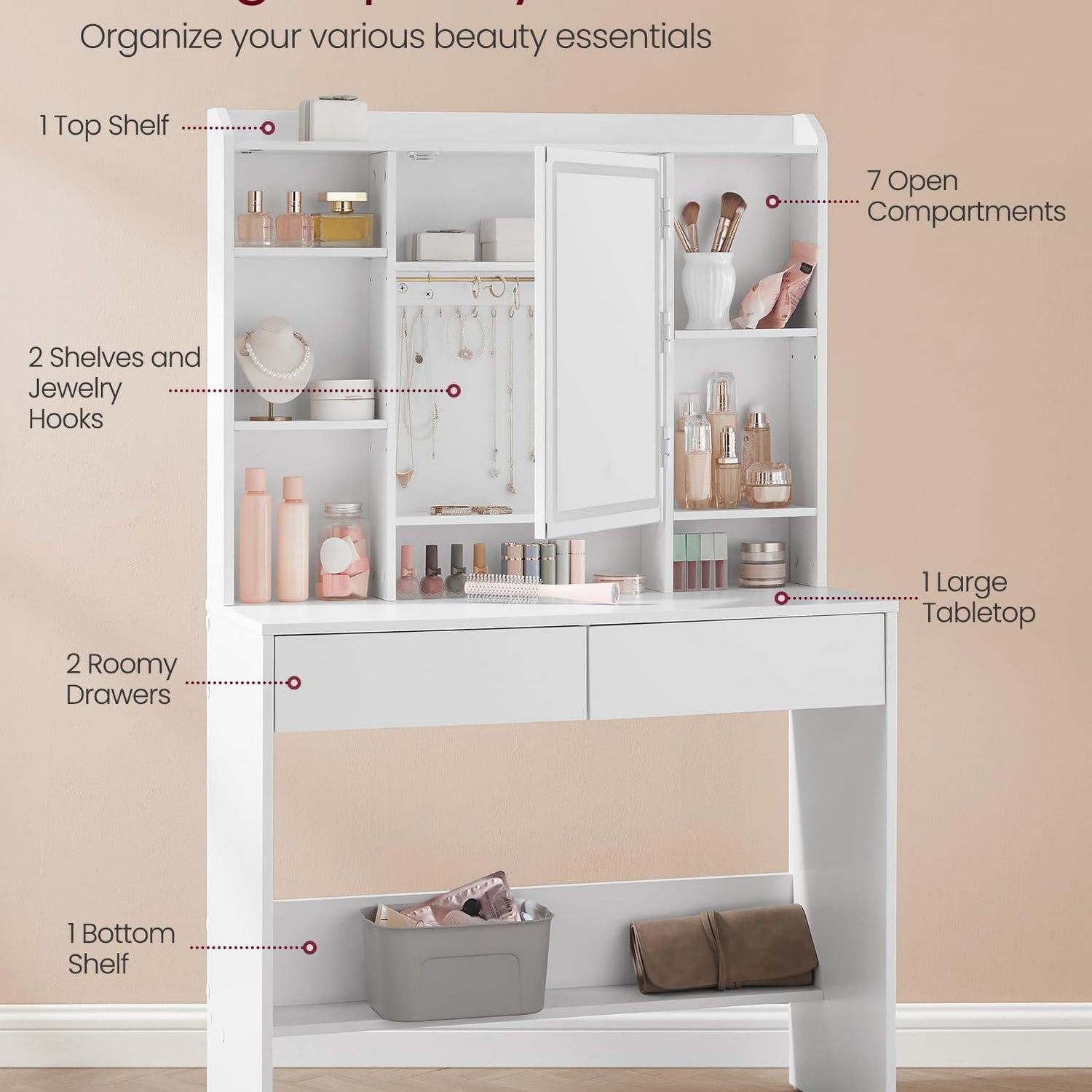 - 【SPACIOUS STORAGE】Featuring 1 top rack for perfumes, 7 open compartments for beauty essentials, 2 hidden shelves and hooks for jewelry behind the mirror, a large tabletop, 2 drawers, and a bottom shelf, everything can find its place in this vanity desk