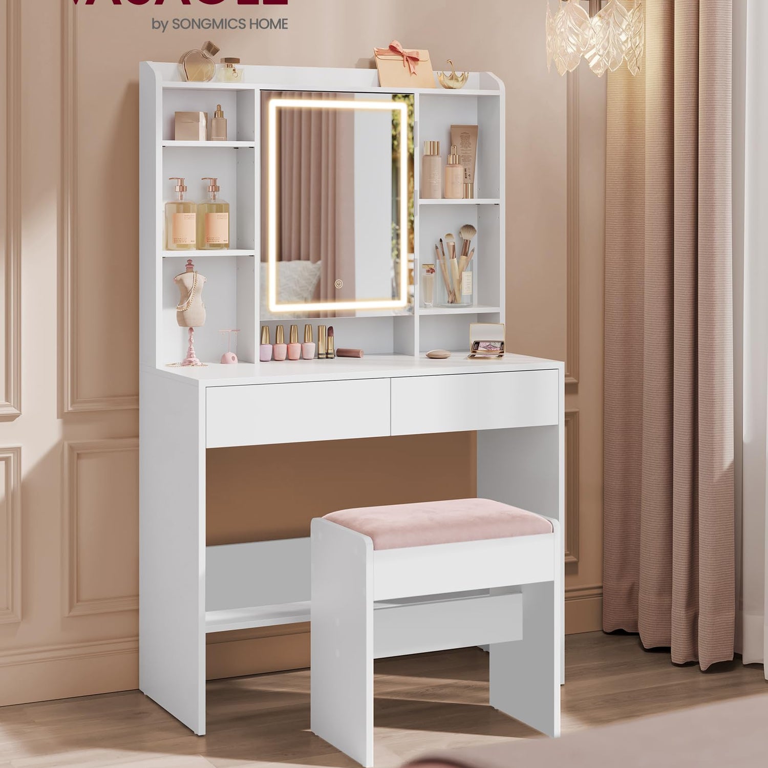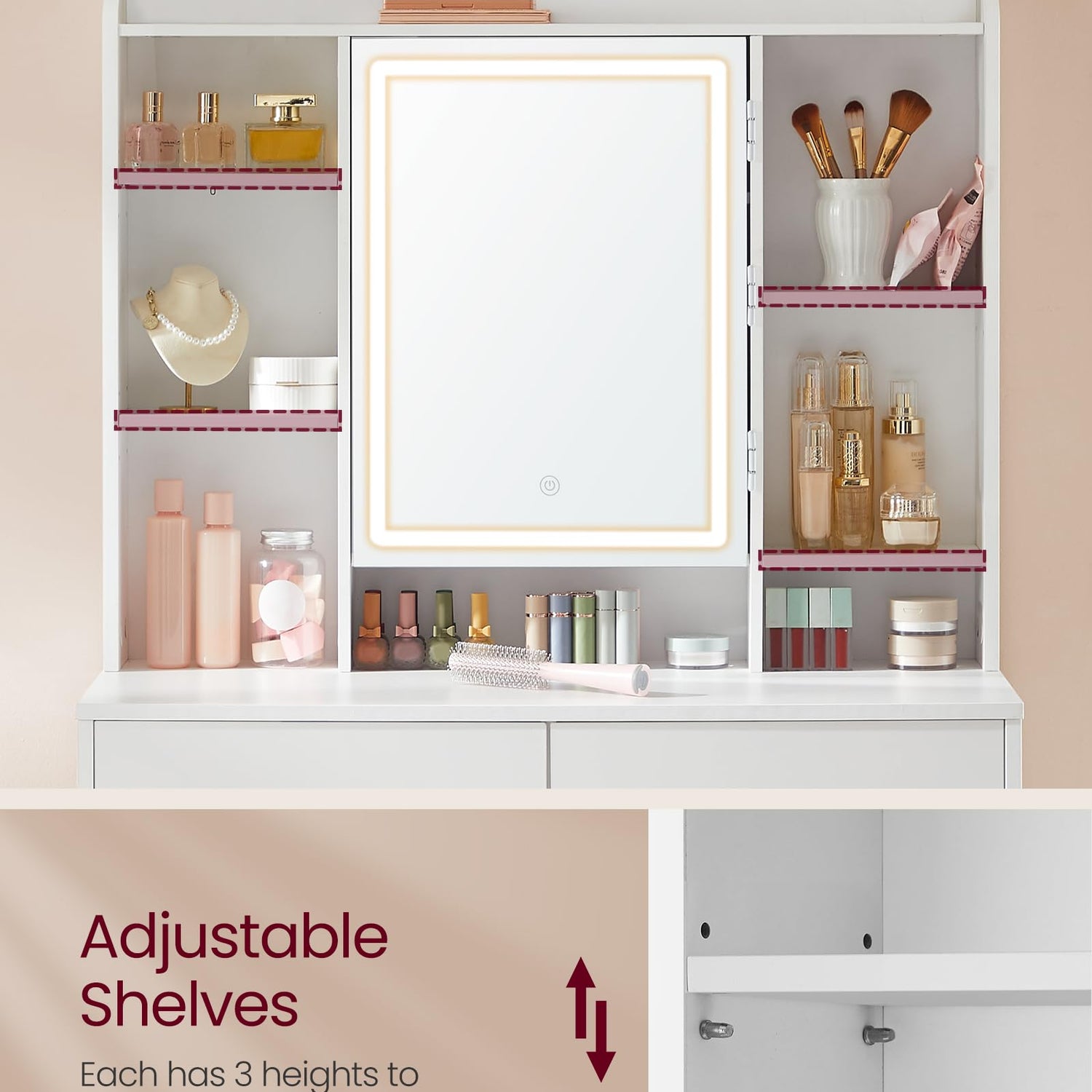 VASAGLE Vanity Desk with Mirror and Lights, Makeup Vanity with Upholstered Vanity Stool, Dimmable LED Lights, Adjustable Shelves, 7 Compartments, 2 Drawers, for Bedroom, Cloud White URDT131W01